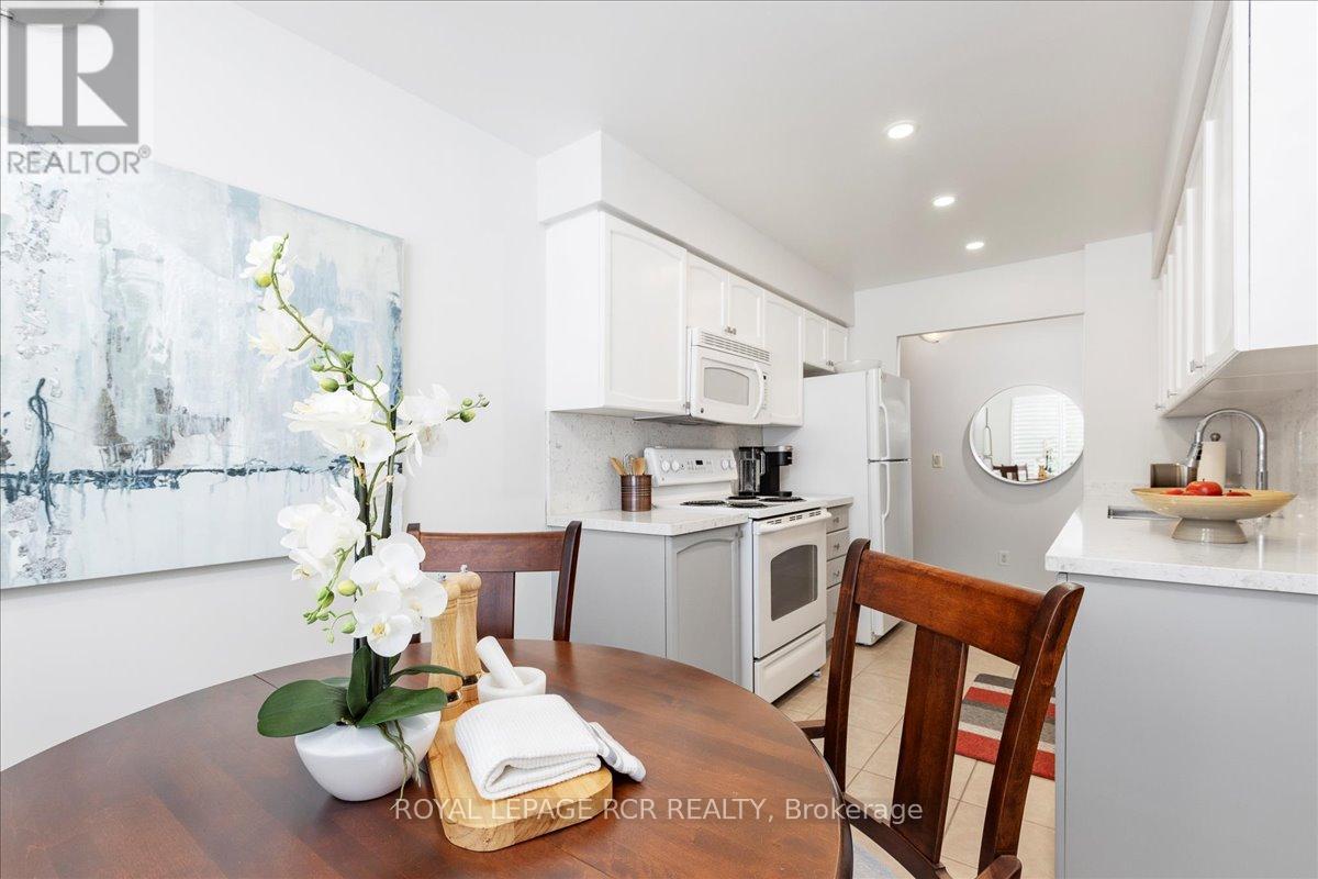Serene and beautifully decorated, this condo apartment in the desirable Rosedale Village Gated Community is a true showpiece. Offering 1,000 s.f. with 2 bedrooms, 2 bathrooms, this bright and inviting suite features an updated galley kitchen remodeled in 2021, complete with updated cabinetry, quartz countertops & backsplash, and convenient pull-out drawers in all lower cabinets. A generous eat-in area provides the perfect space for casual dining. The spacious living room showcases engineered hardwood floors and a walk-out to a large private balcony, ideal for relaxing outdoors. The primary bedroom features hardwood flooring, a walk-in closet, and an updated 3-piece ensuite with a walk-in shower and quartz counters. The second bedroom also offers hardwood floors and a double closet-perfect for guests, a home office, or hobbies.This suite includes excellent storage, plus a separate locker and a parking space just steps from the building. Seller currently rents an underground spot which is available. Enjoy an active lifestyle with exceptional community amenities including a vibrant Club House with activities such as cards, pickleball, book club, shuffleboard, darts, party room and more-plus a 9-hole golf course right in the community. (id:4555)