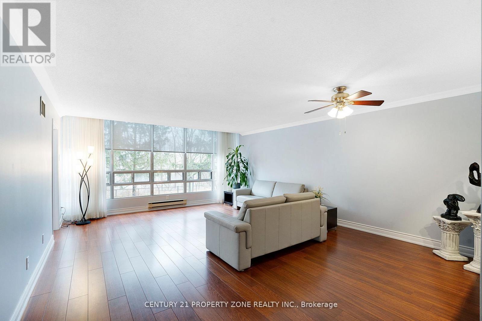 Welcome to over 1,200,sq. ft. to 1,399 sq.ft. , of exceptionally designed living space, beautifully remodeled from top to bottom. This one-of-a-kind suite features raised ceilings, premium finishes, and an abundance of natural light throughout. Located in the award-winning 330 Mill St S-considered the premier building among the three on site-this home offers unmatched quality and comfort. The modern, bright kitchen is equipped with updated cabinetry, sleek finishes, and ceramic flooring, while engineered hardwood floors grace the living and dining areas. Floor-to-ceiling windows showcase tranquil ravine and stream views, complemented by automatic blinds in the living room. The entertainment-sized living and dining area is perfect for gatherings, and the spacious primary bedroom features a modern 3-piece ensuite with a glass shower and two extra closets.An extra-large second bedroom with generous closets, full-size in-suite laundry, crown moldings in the livingroom, and exceptional storage throughout the suite add to the home's appeal. Spotlessly maintained and fully upgraded, this move-in-ready home is ideal for a small family, downsizers, or those looking to retire in comfort without the worry of snow removal or lawn maintenance. Maintenance fees include all utilities, offering convenient, stress-free living, all within a highly sought-after, well-managed Brampton West building known for it's excellent amenities and peaceful surroundings. Exceptional storage throughout the suite Full-size in-suite laundry Crown moldings for an elegant touch Spotlessly maintained & fully upgraded-move-in ready! Perfect for a small family, down sizers, stress-free living. Situated in a highly sought-after, well-managed Brampton West building known for its excellent amenities and peaceful surroundings. (id:4555)