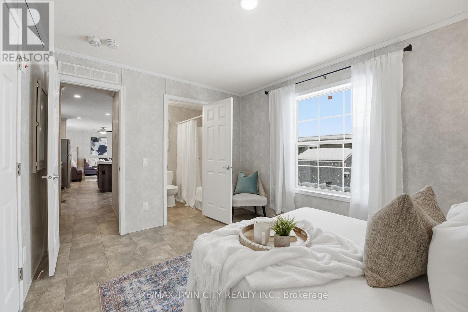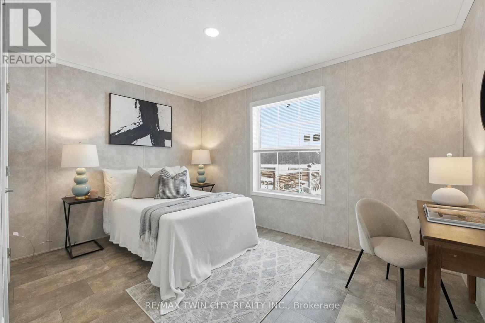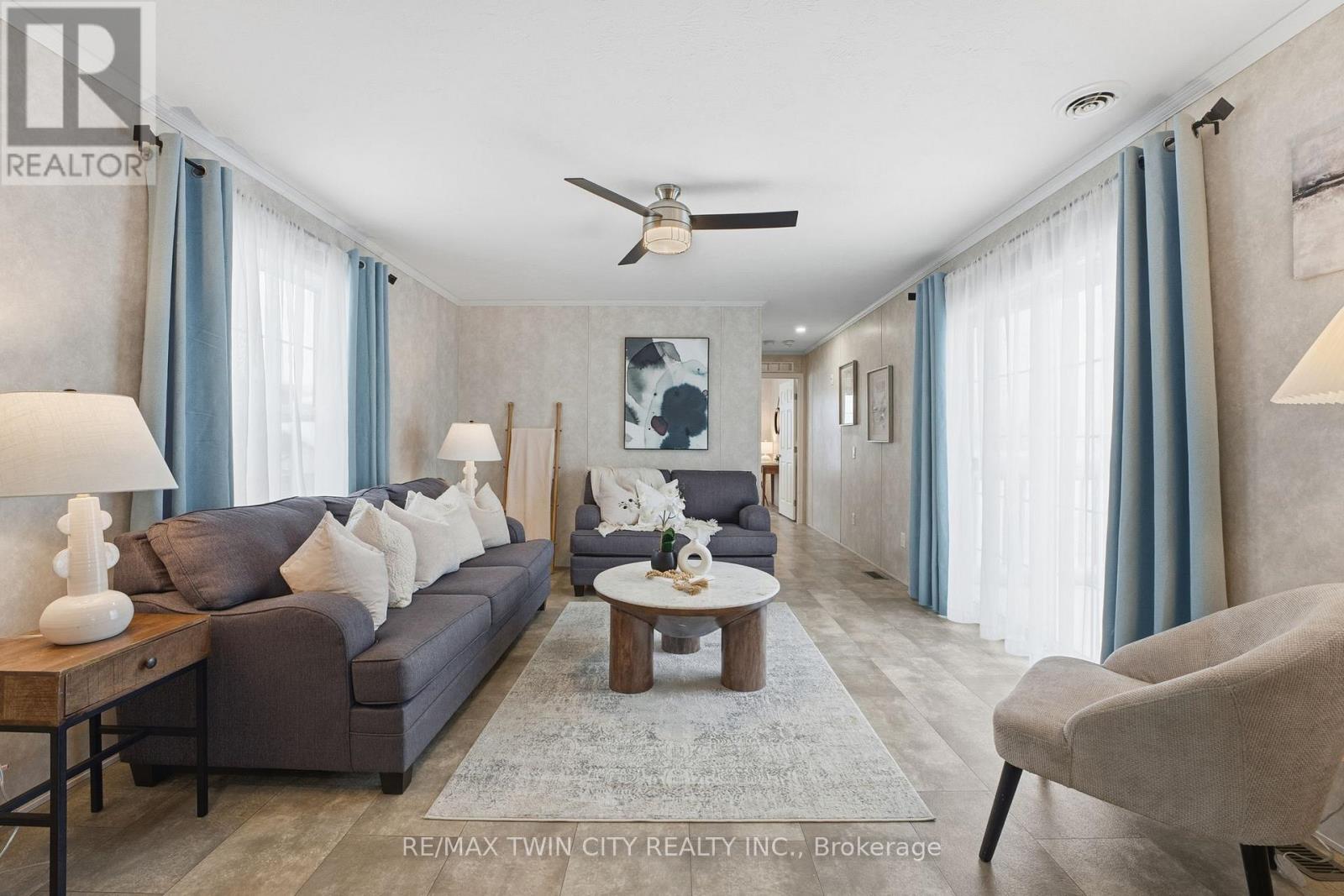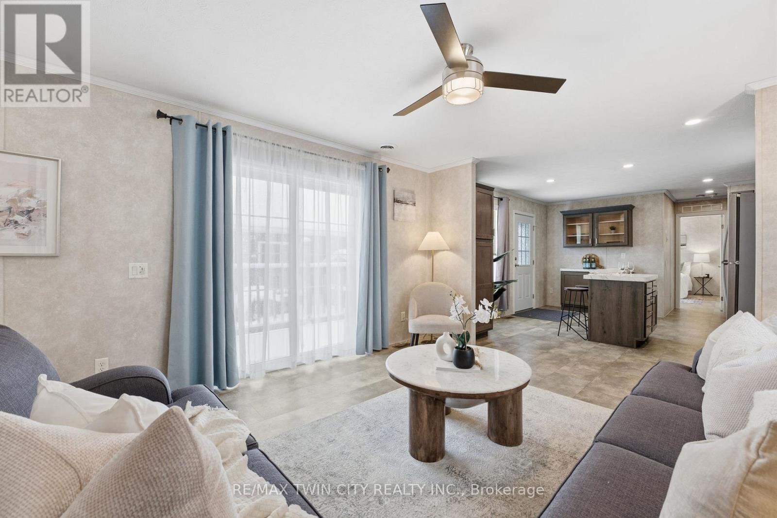 Experience refined, low-maintenance living in this beautifully designed newer modular home located in Twin Springs, perfectly suited for year-round enjoyment. Thoughtfully laid out with an airy open-concept design, the home is bathed in natural light from expansive windows, creating a warm and sophisticated atmosphere throughout. The stylish, carpet-free interior flows seamlessly into a well-appointed kitchen complete with a dishwasher, ideal for both everyday living and entertaining. Featuring two generous bedrooms and two full bathrooms, including a serene primary retreat with double closets and a private ensuite, this home offers comfort and privacy in equal measure. Step outside your sliding patio door to a spacious deck-an inviting extension of the living space-perfect for morning coffee or evening relaxation. With two dedicated parking spaces and a location in the charming town of Burford, just minutes from shops, dining, and essential amenities, this property presents an exceptional opportunity to enjoy quality, comfort, and effortless living without compromise. (id:4555)