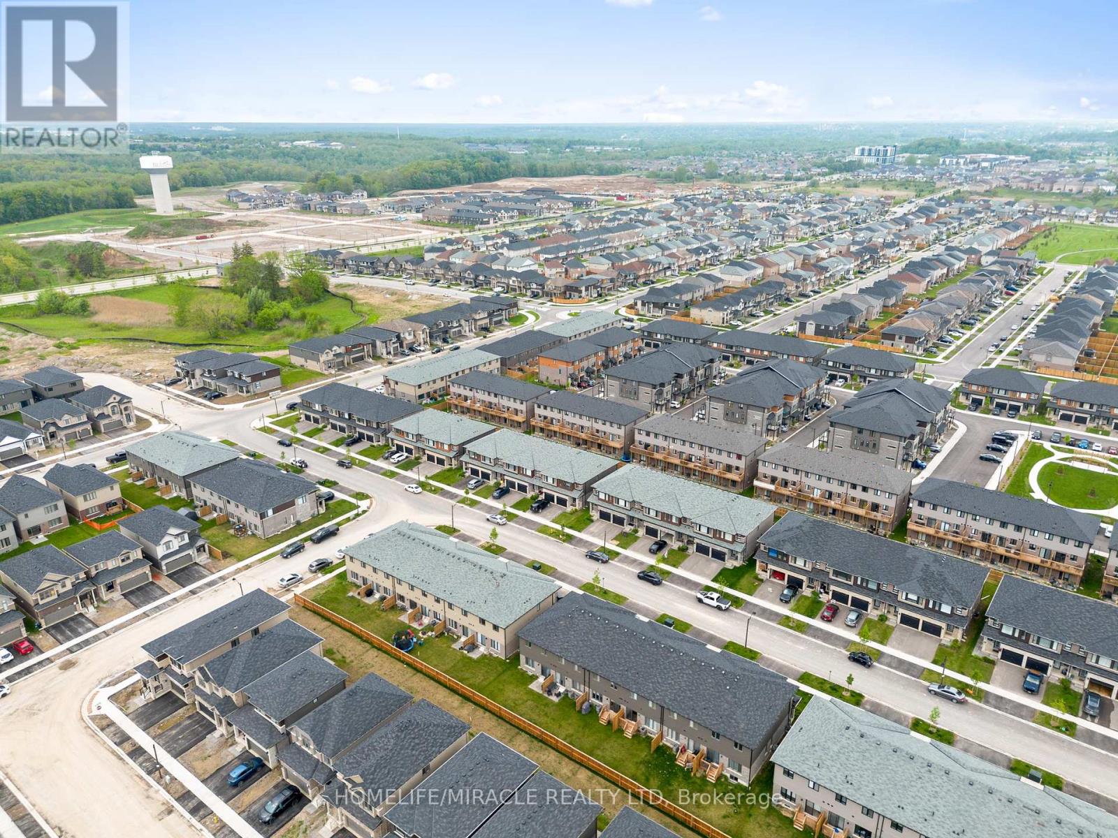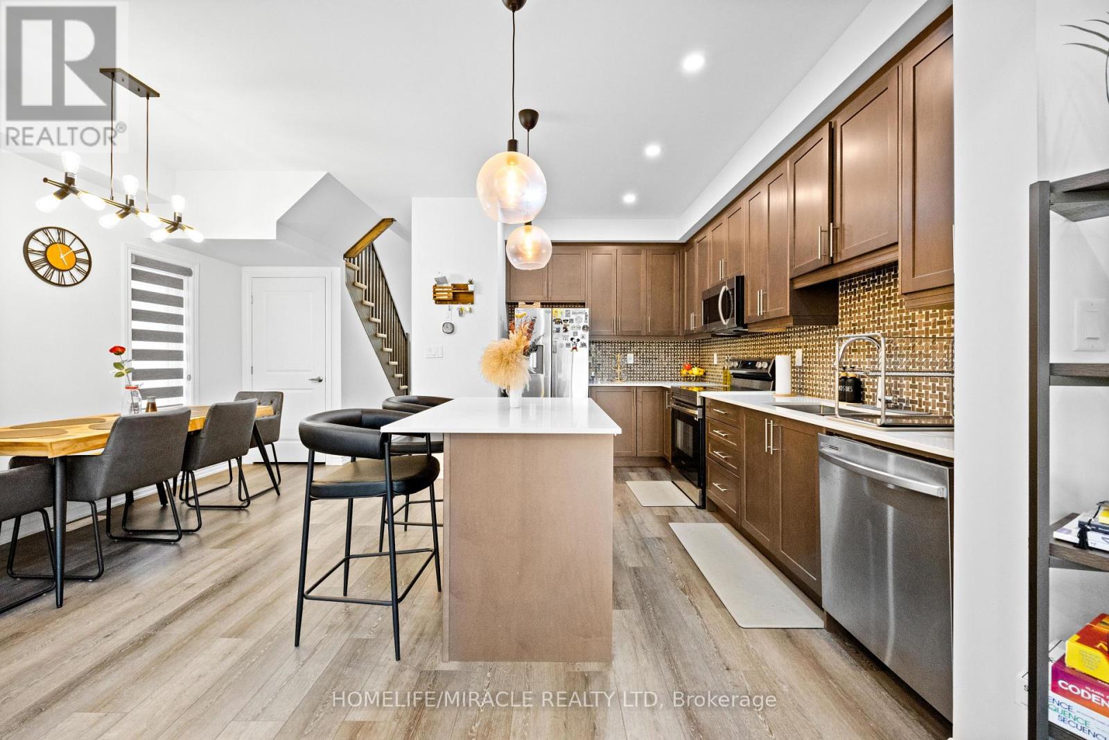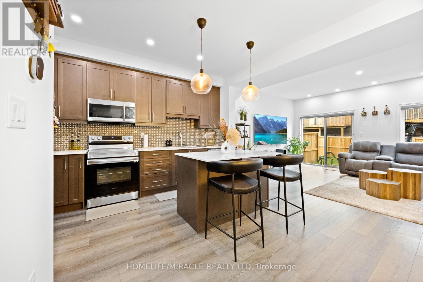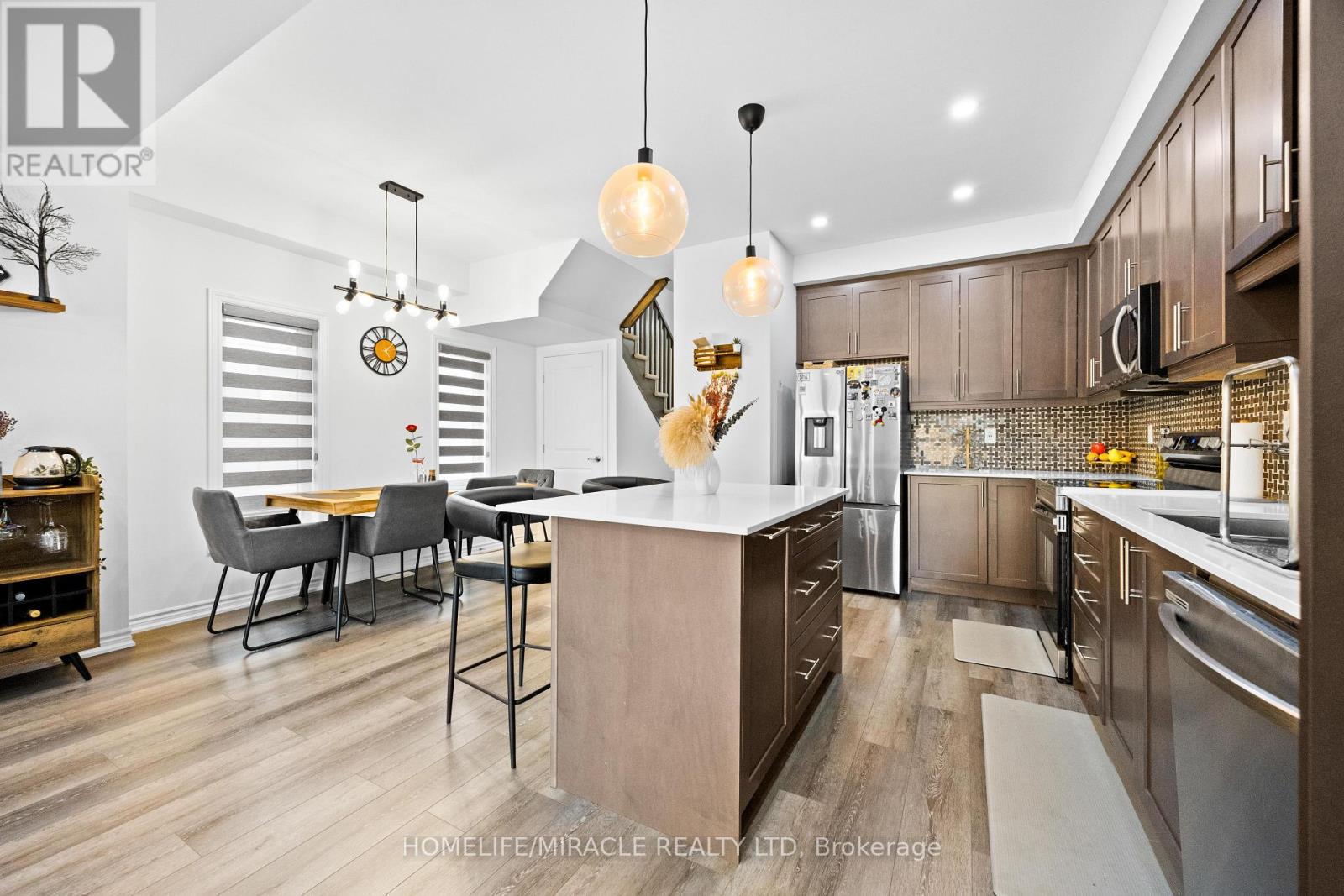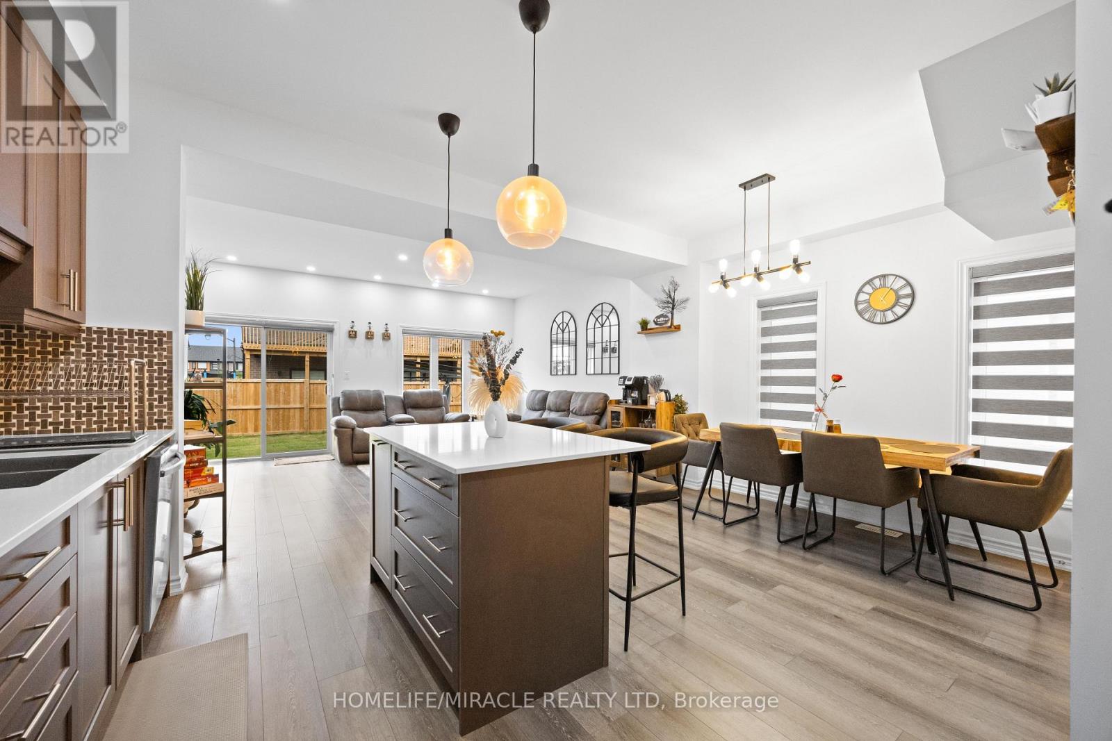 -Main Awesome End-unit Freehold Townhouse (feels like semi detached), Move In Ready! Corner Enhanced End Unit 1709 Sq Feet 2 Storey Freehold Townhouse Just Like Semi, In Sought Area Of brant West! 3 Bedrooms, 2.5Baths.Bright/Spacious Have Larger Windows For Natural Light Floor 9Ft Ceiling, Gorgeous Kitchen With Bigger Living & Dining Area, Quartz Counter, Deep Sinks. Must-See, 3 Years Old, Located in West Brantford community features a modern open-concept design with 9-foot smooth ceilings and laminate flooring throughout the main floor. The upgraded kitchen boasts quartz countertops, a stylish undermount sink, extended-height upper cabinets, a kitchen island, and a microwave space saver provision, along with brand-new stainless steel appliances, including a fridge, stove, and dishwasher. Beautiful entry leads to a large foyer, opening into a bright living room with a walkout to the backyard, filled with natural light from oversized windows, making it perfect for family gatherings or entertaining friends. The main floor also includes pot lights to enhance the space with warm, modern lighting. Upstairs, the primary bedroom offers a walk-in closet and a luxurious ensuite full washroom, while the second bedroom also includes a walk-in closet. A convenient second-floor laundry room comes equipped with a brand-new white front-loading washer and dryer. Located in a family-friendly neighborhood, this home is just minutes from top-rated schools, a community center, shopping, scenic trails, and major highways, with visitor parking and a kids' park conveniently situated in front of the house. Don't miss this incredible opportunity schedule a showing today! Furnace, A/C and Tankless hot water owned. (id:4555)