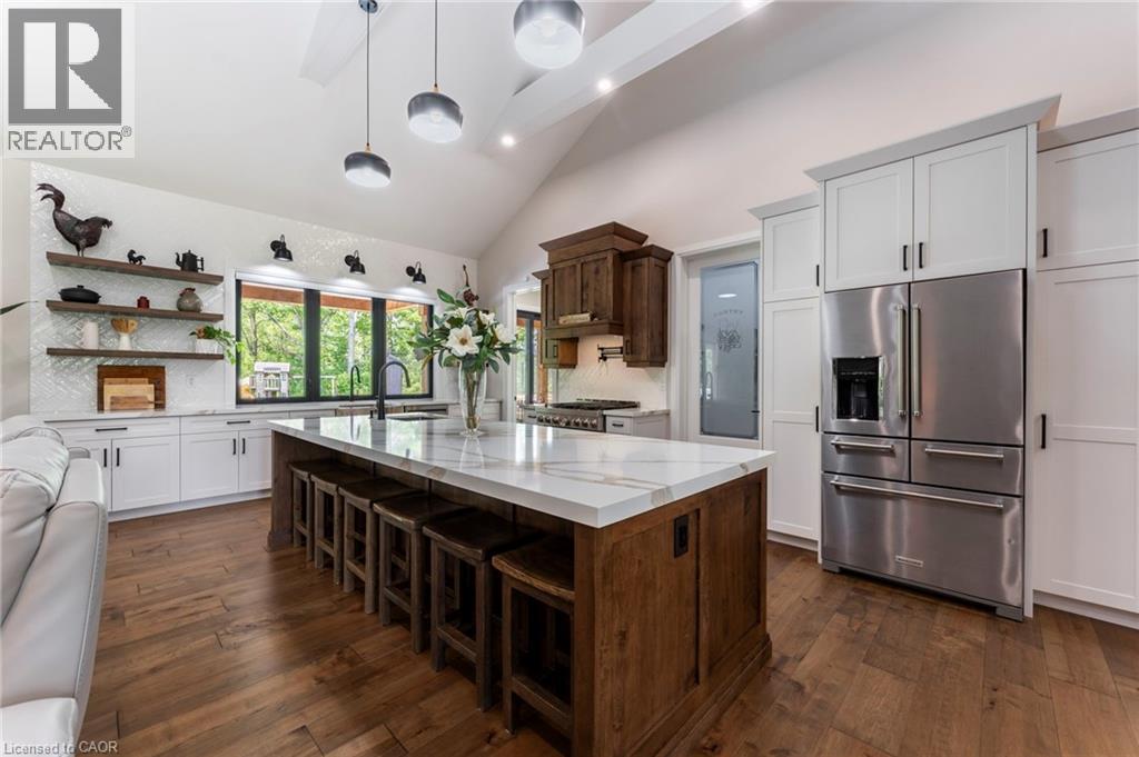 Your dream countryside retreat is here! Just minutes from every convenience, this custom-built modern farmhouse bungalow offers the perfect blend of luxury, comfort, and nature. Perched on nearly 6 private acres with breathtaking panoramic views of the Grand River and direct access to the Grand Valley Trail System, this 2023 masterpiece was designed for multi-generational living, income potential, and pure enjoyment. With over 6,000 sqft of finished living space, you’ll find 7 bedrooms, 6.5 baths, 3 kitchens, and 3 laundry rooms—a true haven for large families, blended households, or savvy investors. The main floor offers two separate living quarters with a total of 4 bedrooms, 4.5 baths, 2 kitchens, and2 laundry rooms, making it an entertainer’s dream and a family’s paradise. Step into the soaring 16' vaulted Great Room, paired with 10' ceilings in the dining area and 9' ceilings in the bedrooms, creating an open and airy feel. The chef’s kitchen boasts a 10' island, walk-in pantry, and custom cabinetry—perfect for hosting gatherings and making memories. Each of the 3 main bedrooms features a walk-in closet and private ensuite, including a tranquil primary retreat with spa-like finishes, direct deck access, and peaceful views. The main floor in-law suite is fully self-contained, offering its own kitchen, living room, spacious bedroom, and 4-piece bath—ideal for guests or family members wanting privacy. The lower level is just as impressive, with a separate entrance to a bright 1-bedroom + den suite (complete with bath, laundry, and kitchen), plus additional bedrooms, a rec space with wet bar, and storage galore. Outside, your private 490' driveway leads to pure bliss—an expansive tiered covered porch with Douglas Fir beams, a fully fenced LED-lit sports court, and a heated 3-car 800sqft garage! This isn’t just a house—it’s a lifestyle. Peaceful, private living with nature at your doorstep, yet only minutes from the shops, schools, and amenities you love. (id:4555)