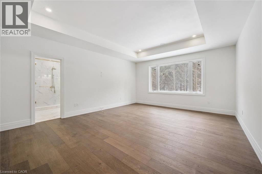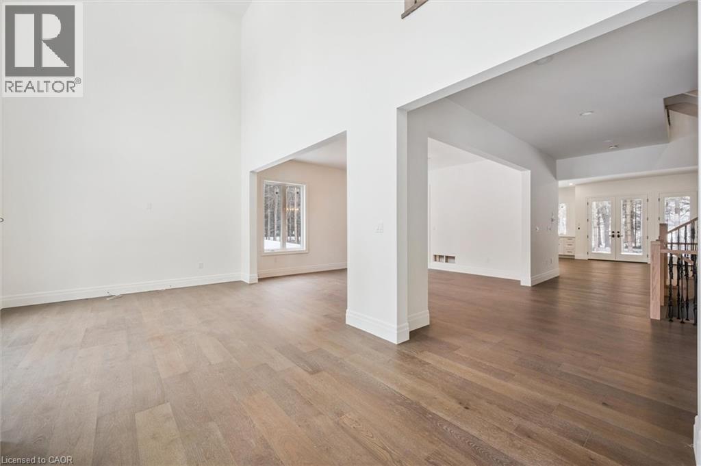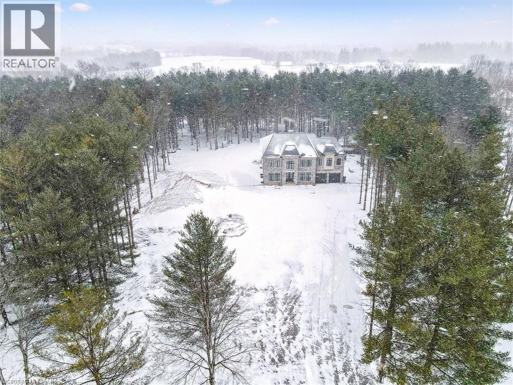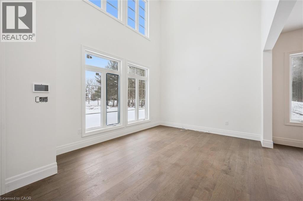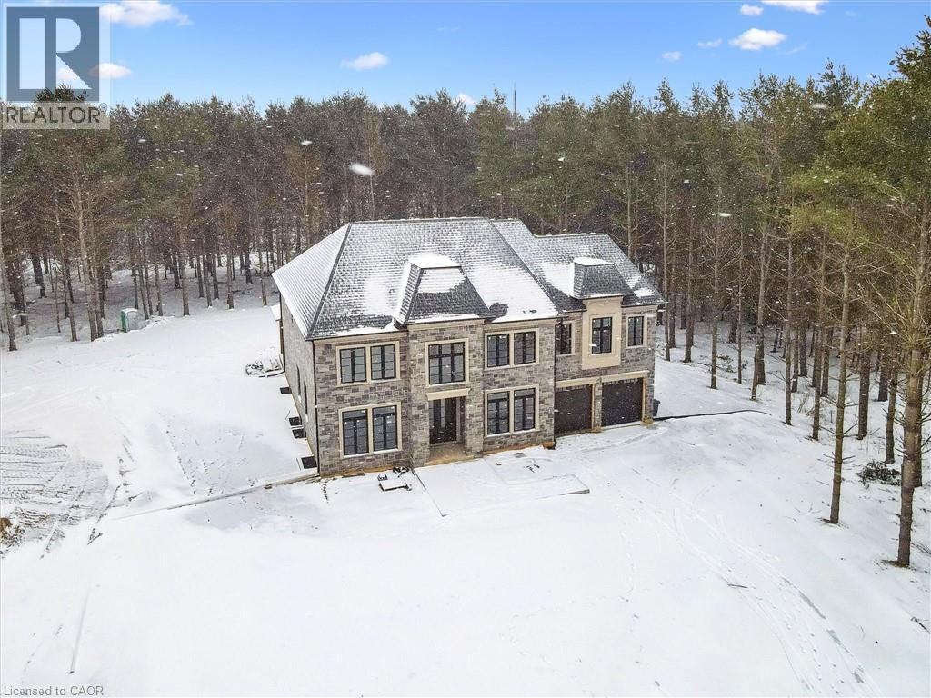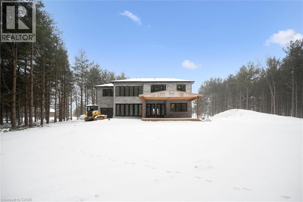 Tucked away in the quiet, tranquil outskirts of Brantford, this exceptional 5,000 sq. ft. new build sits on nearly 3 acres of land. Surrounded by towering evergreens and backing onto Fairchild Creek, 5 West Harris Rd. offers a rare sense of privacy and natural beauty—seamlessly paired with refined luxury living. The home features expansive living spaces with soaring cathedral ceilings, rich engineered hardwood flooring throughout, and modern finishes. Large windows frame breathtaking views of the private, wooded surroundings, creating a seamless connection to nature. Just off the front door, a dedicated home office provides a quiet workspace. A formal living room and separate formal dining room offer elegant spaces for entertaining, while the chef’s kitchen, designed for everyday living and gatherings, features high-end appliances, extensive cabinetry, a large centre island, a convenient servery, and an additional dining area opening effortlessly to the family room. Upstairs, four spacious bedrooms each feature their own private ensuite. The primary suite is a true retreat, complete with a generous bedroom, spa-inspired ensuite featuring a freestanding tub, a massive walk-in shower, and an expansive walk-in closet with a skylight that pours natural light into the space. The full basement provides a blank canvas to tailor to your lifestyle—ideal for a home theatre, gym, bar, or games room. Step outside to a pool-sized backyard with a covered outdoor living area, perfect for relaxing or entertaining while immersed in nature. (id:4555)