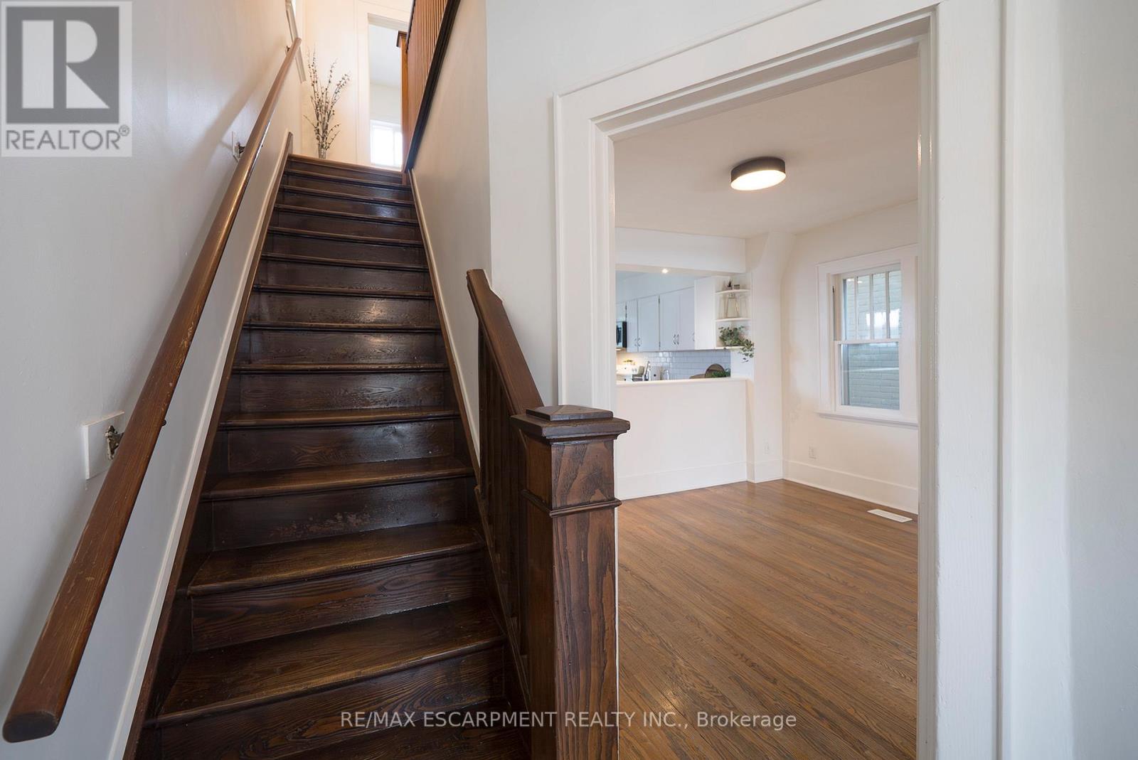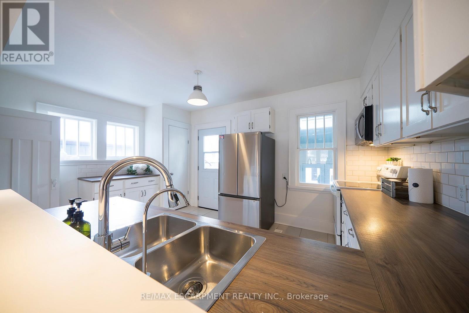 Welcome home to 65 1/2 Dundas Street in Brantford's Terrace Hill neighbourhood. This classic 2-storey home has been thoughtfully updated while maintaining its original character. The freshly painted, carpet-free interior offers 3 bedrooms, 2 bathrooms and a finished walk-up basement. The home features a classic solid red brick exterior and new front and back doors (2026). The front entry opens to a welcoming main level finished with hardwood flooring that continues through the living and dining areas. The sunny kitchen features an updated fridge and dishwasher, double sink with RO water tap, subway tile backsplash, ample cupboard space and an over-the-range microwave. A large kitchen pantry and coffee bar create a practical and well-organized workspace. Just beyond the kitchen, a newly finished mudroom with additional storage provides convenient backyard access from the lower level. Hardwood flooring continues on the second floor, offering 3 bedrooms and a 4-piece bathroom. The finished basement includes a large recreation room and bar, new vinyl flooring (2026), and a 3-piece bathroom with new flooring and toilet (2026). Plumbing is roughed in for a future basement bar or sink if desired. A walk-up from the rec room provides direct access to the backyard. The fully fenced yard offers a private outdoor space with a deck and staircase completed in 2021, along with a back garden door (2021). The yard also features a covered patio (2021) with ceiling fan and retractable privacy screen. Additional features include a skylight (2021), newer appliances including washer, dryer and fridge (2022), low-maintenance vinyl windows throughout most of the home, and an owned RainSoft water softener with reverse osmosis drinking water system. Perched at the top of Dundas Street Hill, this move-in ready home is conveniently located close to schools, parks, transit, Brantford General Hospital and everyday amenities. (id:4555)