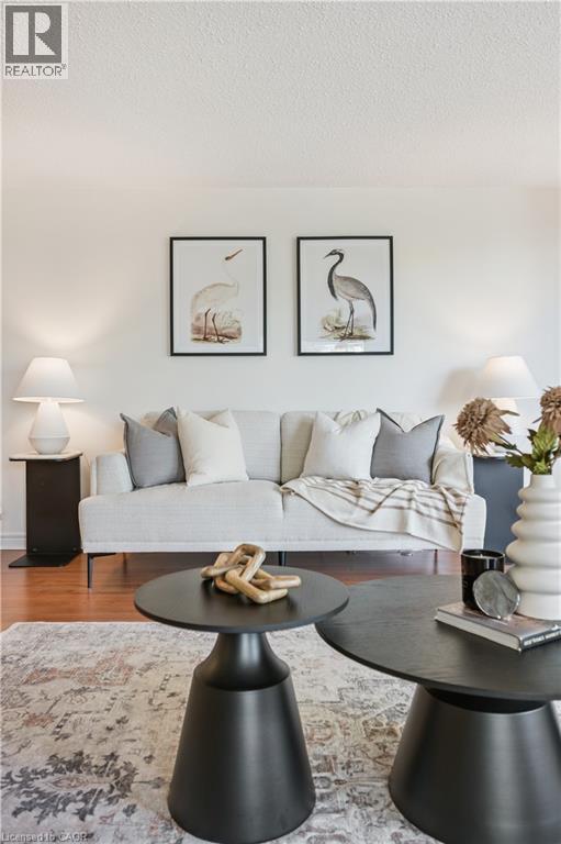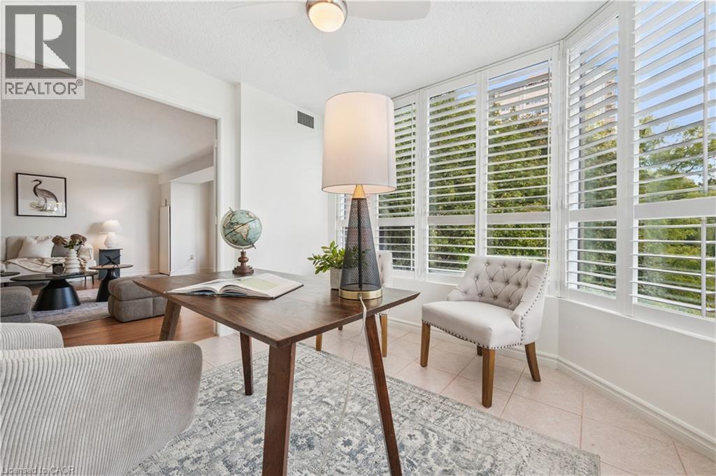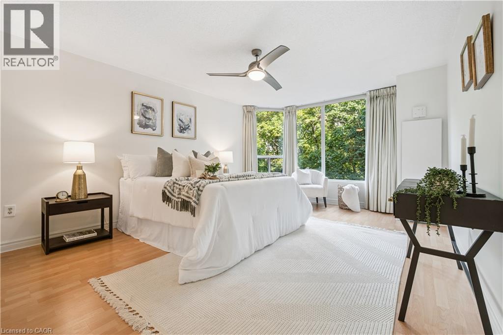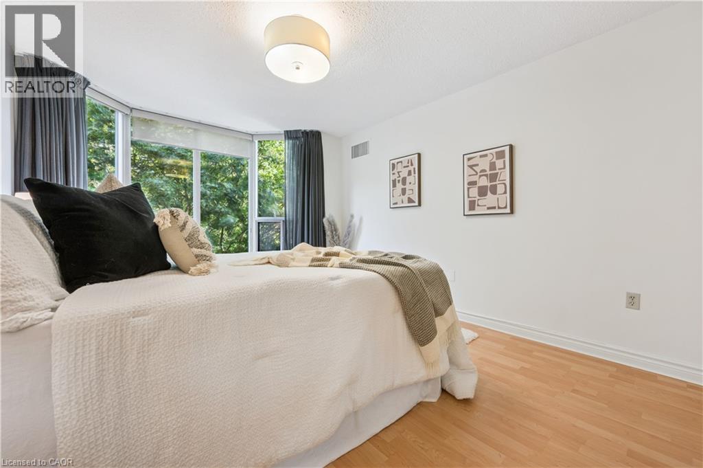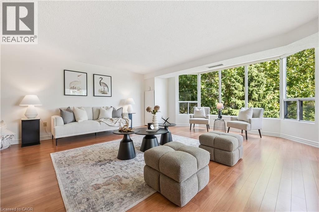 Welcome to boutique living at Village Gate, in one of Burlington’s most sought-after Lakeshore areas. This 2 bed plus den, 2 bath corner suite offers over 1,500 square feet of thoughtfully planed living space with a quiet treed setting and peaceful views of the manicured grounds, Rambo Creek and Lake Ontario. Designed for style and functionality, the updated kitchen features quartzite counters, stainless-steel appliances, glass subway tile backsplash, under cabinetry lighting, a moulded tray ceiling, pot lights, and a breakfast bar. The open concept living and dining areas enjoy eastern exposure, filling the space with natural light through the tree-lined windows and the generous layout grants enough room for multiple seating areas to entertain comfortably. An adjacent den with French doors, California shutters and glimpses of the lake provides an ideal space for a home office, reading room or dinette. The primary suite is equipped with a large walk-in closet, custom organizers and a 5-piece ensuite with marble vanity, his and her sinks, standalone shower, and tiled jetted tub. Additional highlights include a spacious second bedroom, a 3-piece bath with glass shower, side by side in-suite laundry, a front coat closet, custom walk-in pantry, built-in closet organizers, and a separate storage locker. Residents enjoy the benefits of underground parking, ample visitor parking, and condo fees inclusive of all utilities, cable, and internet. The updated lobby, meticulous grounds, well-managed community and quiet atmosphere from its exclusive 39 suite capacity make living at Village Gate a pleasure. Located within walking distance to downtown shops, cafés, restaurants, Spencer Smith Park, the waterfront trail, hospital, and major highways, this residence offers a refined, low-maintenance lifestyle with every convenience at your doorstep. (id:4555)