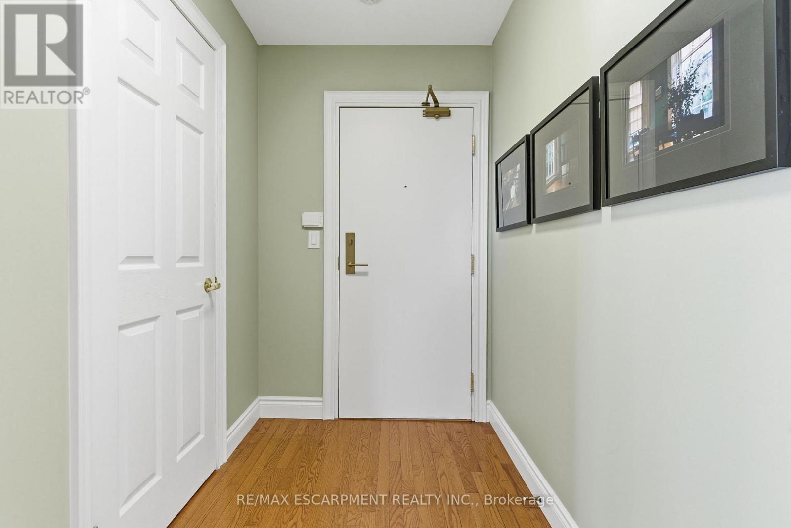 Experience upscale urban living at its finest in this executive-style corner suite located in one of downtown Burlington's most iconic condominium residences. Perfectly positioned directly across from Lake Ontario, this exceptional property offers an unparalleled walkable lifestyle just steps to the waterfront, Burlington Pier, seasonal festivals, award-winning restaurants, boutique shopping, Spencer Smith Park, and all downtown amenities. Spanning approximately 1,445 sq. ft., this spacious and beautifully appointed unit captures stunning east, south, and west views, filling the home with natural light throughout the day. Thoughtfully designed for both comfort and elegance, the layout features two balconies, ideal for enjoying morning coffee at sunrise or unwinding at sunset with spectacular lake vistas. The open concept kitchen and living area creates a warm and inviting space for entertaining, complemented by an additional den/office area that was opened to enhance flow and maximize living space. A formal dining room framed by windows overlooks the Burlington Pier, offering a breathtaking backdrop for gatherings. This 2-bedroom, 2-full-bath suite showcases classic crown mouldings, hardwood floors, and quality finishes throughout. The primary suite offers a serene retreat with generous closet space and an elegant ensuite. With its prime location, spacious layout, and timeless design, this exceptional residence combines sophisticated condominium living with the best of Burlington's vibrant waterfront community. A rare opportunity not to be missed. 1 Parking Space and 1 Locker included. (id:4555)
