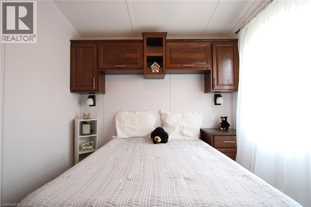 Welcome to Lost Forest - #5 Tamarac! Discover a low-maintenance lifestyle in this stunning custom designed 2 bedroom, 2-bath modular home with cathedral ceilings and stunning family sized kitchen with warm decor and a flowing layout. Located in the desirable gated community of Lost Forest Park and built just 12 years ago, it offers 1,046 sq. ft. of bright, open-concept living space. This home combines modern comfort with a welcoming design in a gorgeous setting that far exceeds other types of ownership at an affordable price. The spacious kitchen features plenty of cabinetry including pull out drawers in the pantry, a large dining area and opening to a cozy living room complete with an entertainment wall unit with electric fireplace. Enjoy your morning coffee or relax at sunset on the large deck with 3 access doors to the your home including sliding doors that lets the natural light brighten your home. There is ample storage within plus a handy oversized garden shed to utilize as well. Additional highlights include a built in desk in the 2nd br, tall toilets, solid wood doors, a generator and parking for 2 vehicles on a concrete pad. Lost Forest Park residents enjoy outstanding amenities including an inground pool, community centre/pavilion, pickle ball court, an area to enjoy horse shoes, a play area for the kids and walking trails. The low monthly fee of $550 conveniently covers the land lease, water, property taxes and year-round maintenance. (fees are subject to increase for new owners.) Septic charge of $100 approx per 6 month. Located just minutes from shopping in Waterdown and nearby Carlisle, dining, golf courses and major highways. This is the perfect blend of comfort, convenience, and community. Make the move today and start living the lifestyle you deserve! (id:4555)
