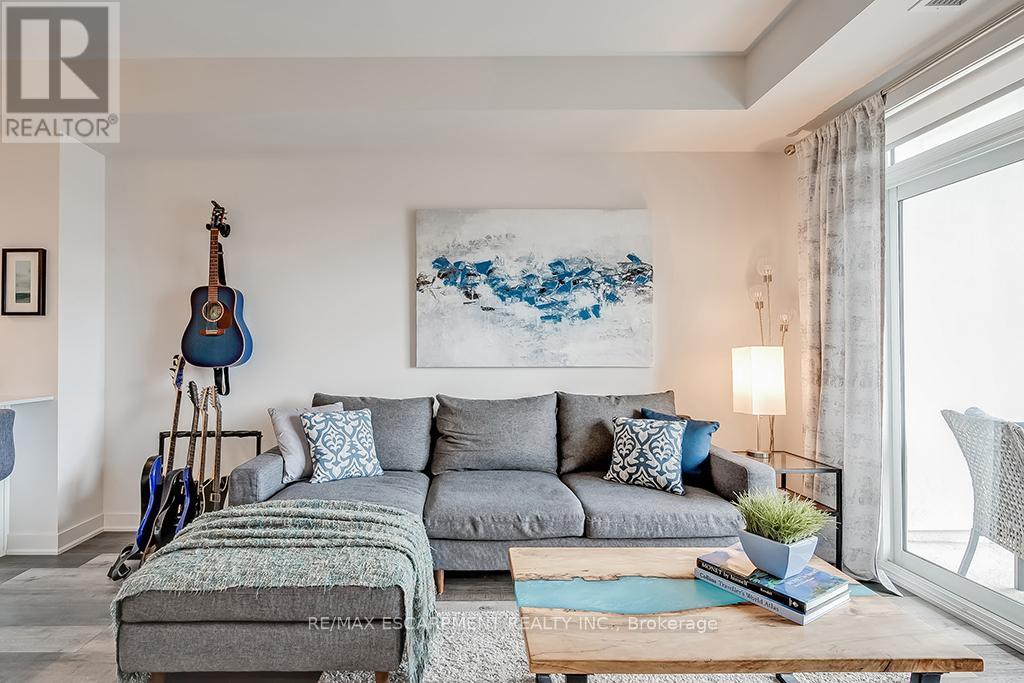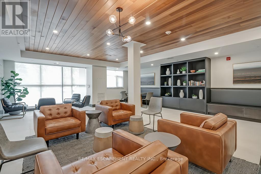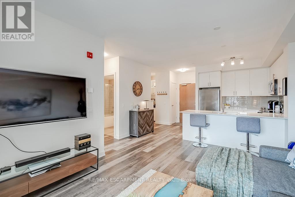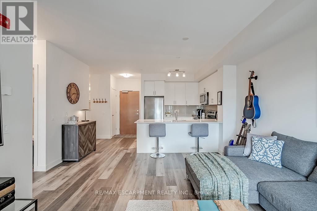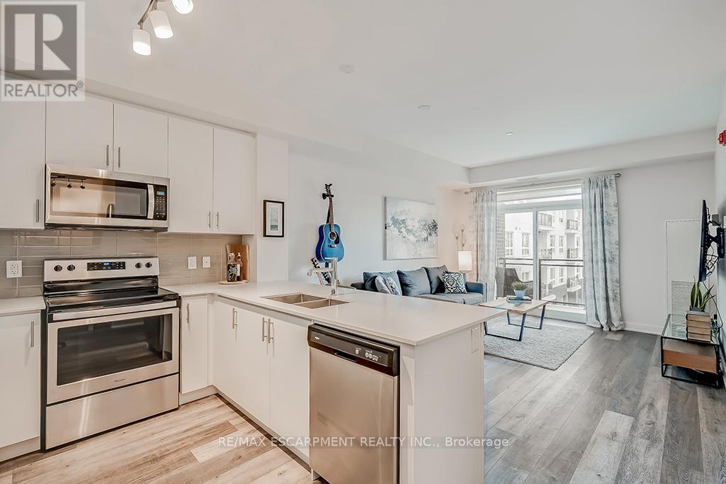 Stunning one bedroom + den suite at Affinity in Aldershot! Custom kitchen with quartz, stainless steel appliances, breakfast bar and glass subway tile backsplash. Open concept living with 9' ceilings, in-suite laundry, 4-piece bathroom and spacious private balcony. Steps to the GO station, RBG, marina, library, schools and Burlington Golf & Country Club. One underground parking space and one storage locker on unit level. Building amenities include loads of visitor parking, electric car charging station, rooftop terrace with BBQs, gym, yoga room and party room! (id:4555)