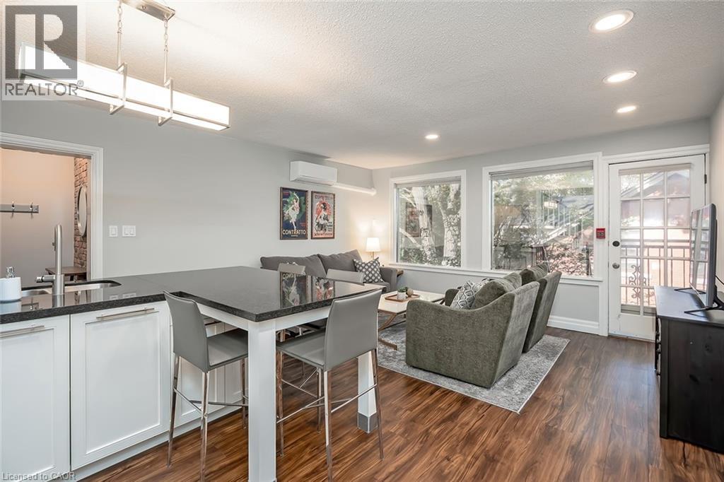 This charming and cozy 1-bedroom, 1-bath, two storey (loft) suite located in a historic boutique building, just one block from the lake and Spencer Smith Park. Furnished or unfurnished, this bright and spacious suite offers a welcoming open-concept layout featuring a comfortable living space and modern kitchen with white cabinetry, granite counters, peninsula with seating for 4 and ample pantry storage. The living room includes large sofa, swivel chairs and Smart TV overlooking the private courtyard with mature gardens, shared BBQ and outdoor seating. Upstairs you’ll find a serene primary bedroom with neutral colour palette, skylights, nightstands, and two walk-in closets, plus a cozy office nook and additional seating area. The spa-inspired bathroom includes a glass shower/tub combination and modern vanity. Additional features include shared coin laundry on the lower level and 1 dedicated parking space. Ideally located steps from Burlington’s waterfront, Spencer Smith Park, boutique shops, restaurants, and major highways (QEW, 403, 407) as well as the GO station. A 1-year lease is preferred. No smoking, no pets. (id:4555)