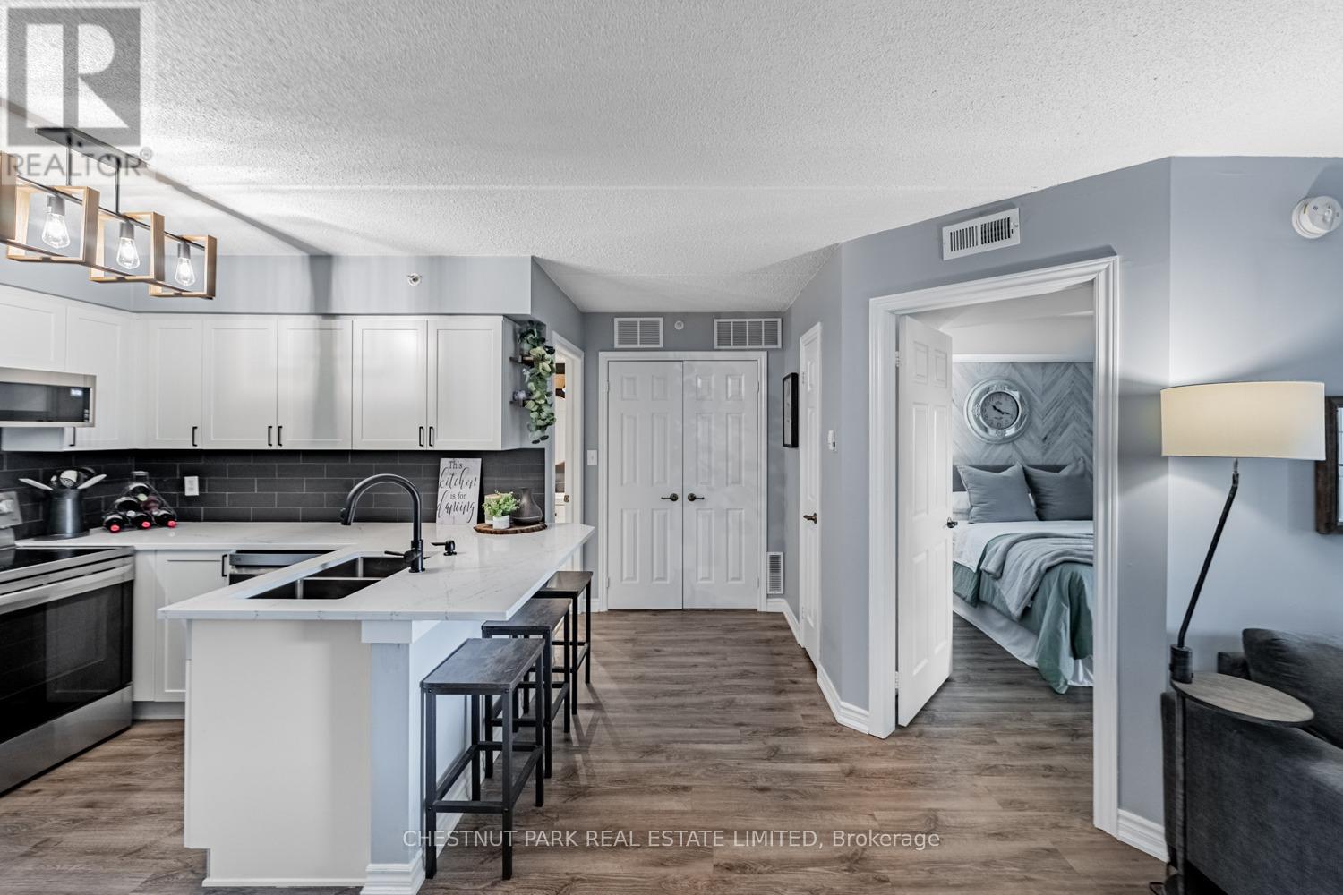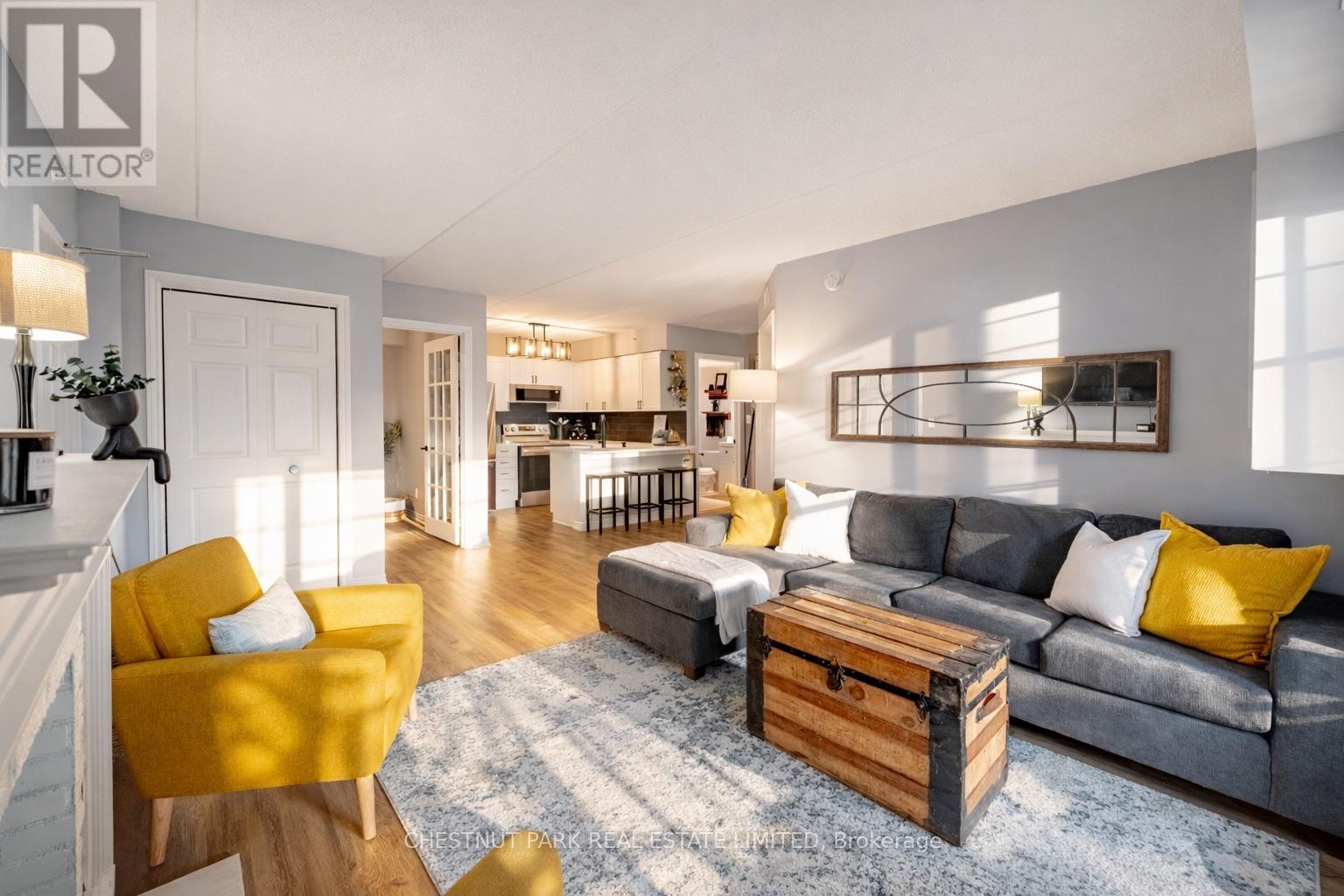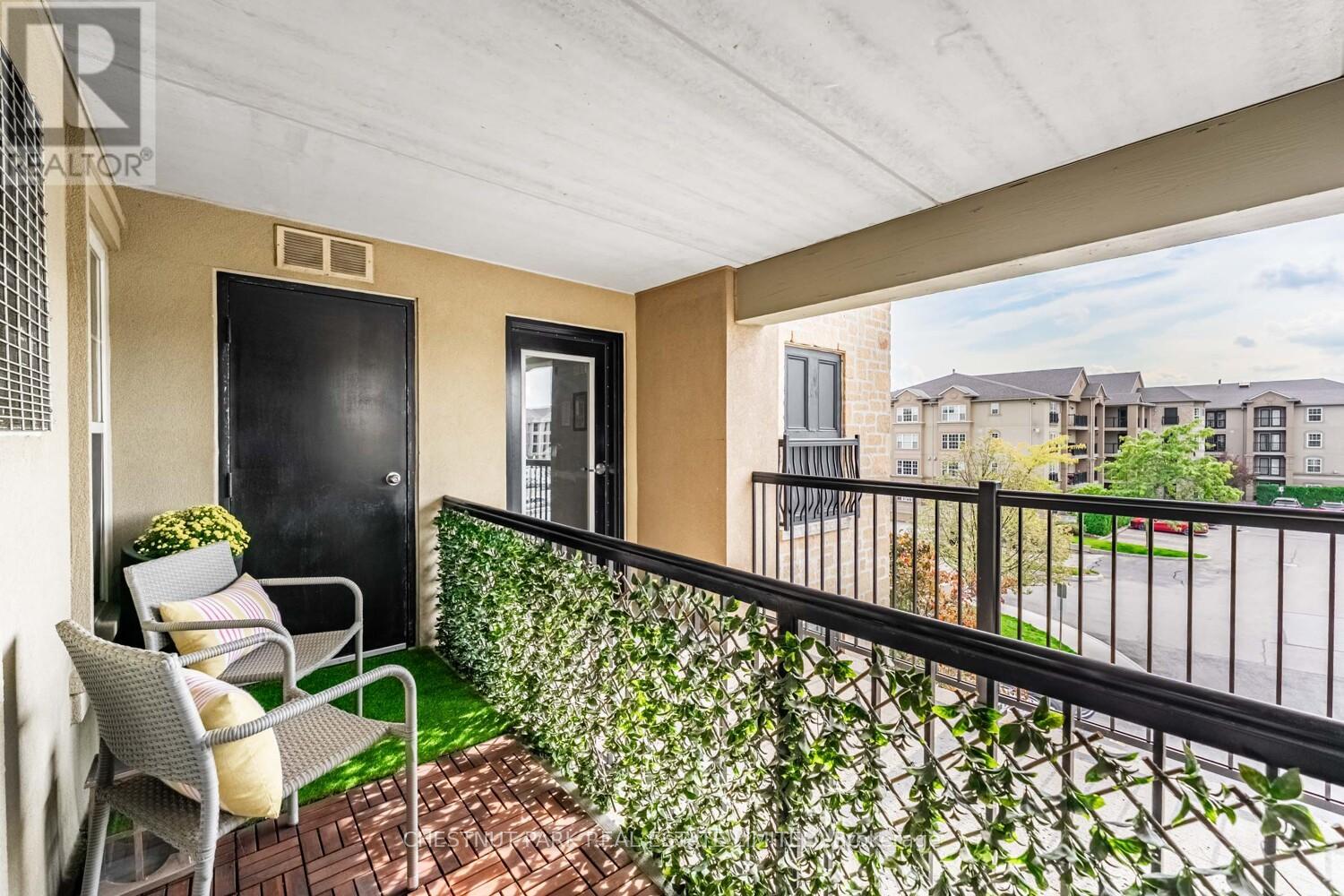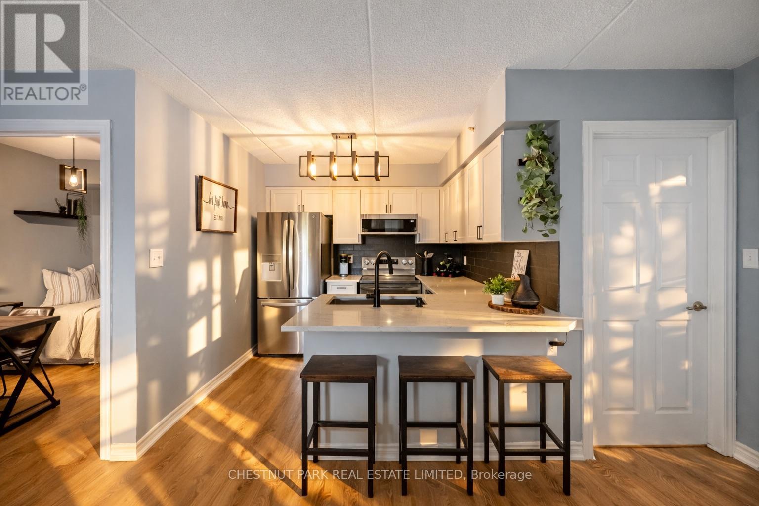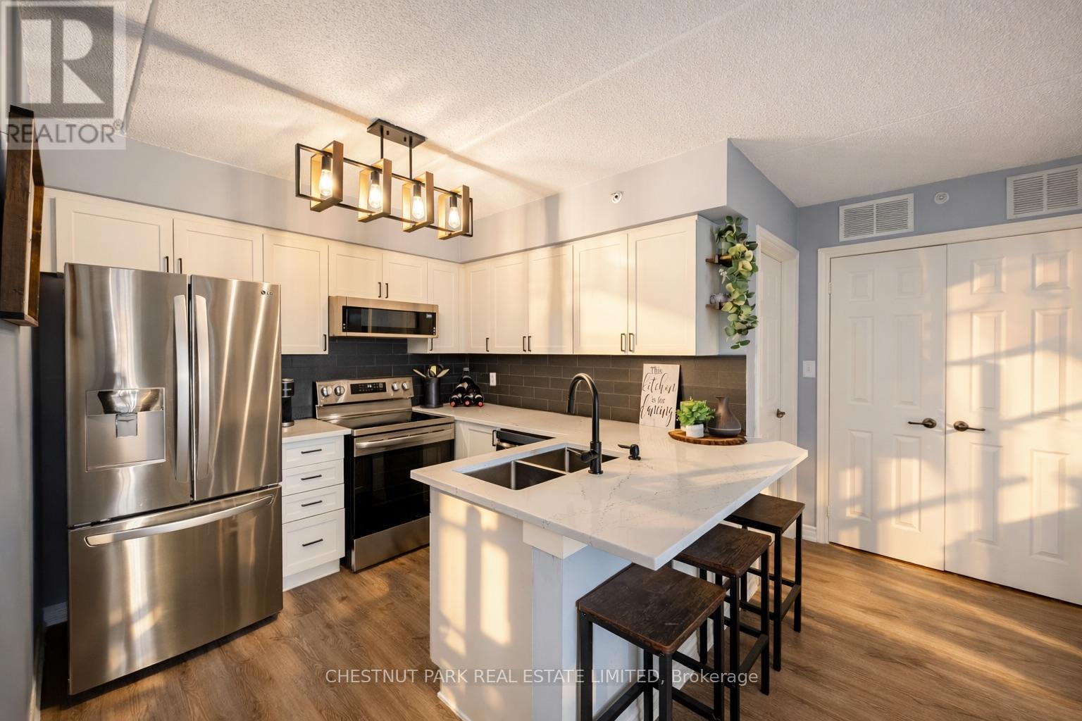 This well appointed and spacious 1-bedroom + den suite offers a fantastic layout in one of Burlington's most desirable communities. The open-concept living and dining area is filled with natural light, featuring large windows and a walk-out to a private balcony -perfect for morning coffee or evening relaxation. The kitchen boasts modern appliances, ample cabinetry, and a breakfast bar for casual dining. A versatile den provides the ideal space for a home office or guest area. The generously sized primary bedroom includes a double closet for ample storage, while the 4-piece bathroom is well-appointed and practical. Enjoy the convenience of in-suite laundry, one underground parking space, and two private lockers! The building offers excellent amenities, including a fitness room, party/meeting room, and plenty of visitor parking. Located in a quiet, well-managed complex just minutes from shops, restaurants, schools, parks, and major highways, this home is perfect for first-time buyers, downsizers, or investors alike. Move-in ready and full of charm, don't miss your opportunity to own in Orchard Uptown! (id:4555)