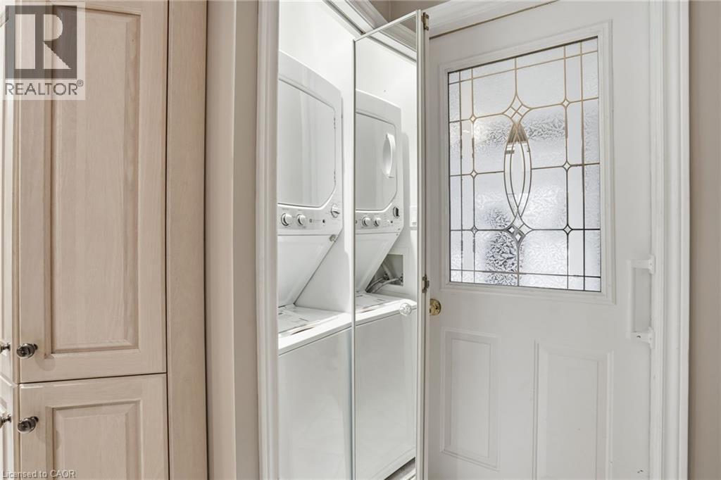 BUNGALOW main-floor-living STACKED townhome with spectacular private setting backing onto GREENSPACE with walkout to gazebo and brand-new extended deck. Amazing outdoor privacy tucked away in solitude at the rear of this exclusive complex, yet mere moments from everything, this centrally located, well maintained MAIN LEVEL stacked end unit offers a low maintenance lifestyle for folks who don’t want to compromise on size, style or comfort. Snow removal for driveway and steps, landscaping and exterior upkeep are all part of the comprehensive maintenance program; and if freedom to travel is a requirement, this home is completely ‘LOCK AND LEAVE’. This unit enjoys a spacious and comfortable open concept living area, easy-care flooring with a multitude of windows that embrace the outdoors, and a lovely GAS FIREPLACE sitting at the heart of it all. The gourmet kitchen features stone counters, breakfast bar, and stainless appliances. Located strategically on the main level is a large primary bedroom with stunning newly finished 3-piece ensuite with granite and marble tile in the huge walk-in shower. A new stackable washer & dryer combo completes ‘everything-you-need’ in main level convenience and is adjacent to the DIRECT GARAGE ENTRY. The finished lower level is ready to be claimed as your office, den, gym, or bed-sitting room with 3 pc ensuite, large shower and AMPLE STORAGE throughout. There is a sump pump with battery back-up in the unit for moisture/flood security. Features include windows and doors (’25), Ensuite bath (’23), Washer/Dryer (’25), newer high-efficiency furnace and A/C (2015 approx), and gazebo plus retractable awning. This unique home is walking distance to restaurants, cafes, shopping, banks, library, park, the WATERFRONT, and great access to highways 407, QEW, 403 and 401. Simply, a location with convenience that cannot be beat. Please note some photos are virtually staged. All inclusions in 'as in' condition. (id:4555)