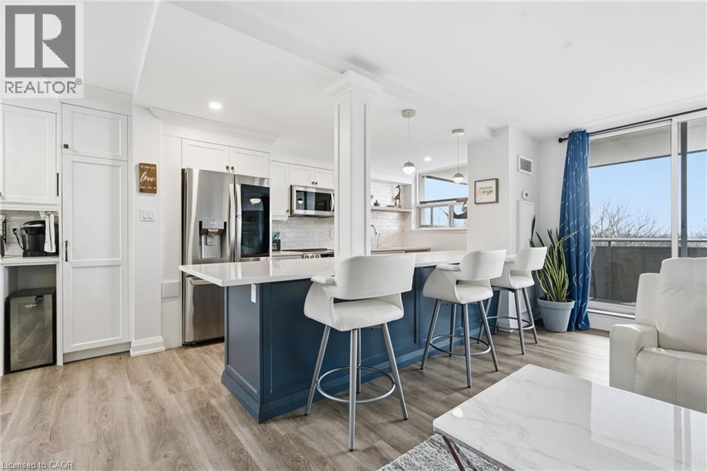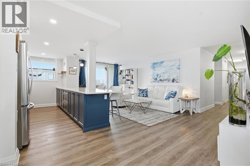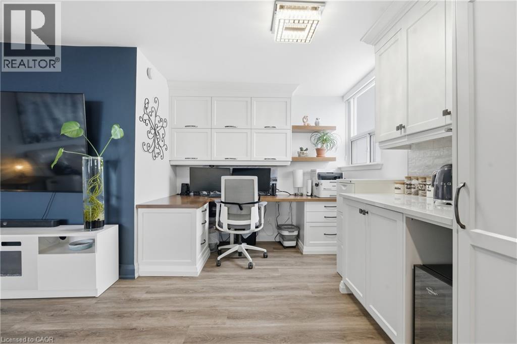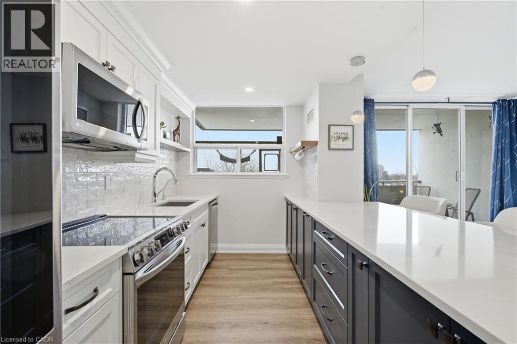 Unbelievable value with condo fees that include heat, hydro, water, gas, cable, internet, and full building maintenance! Then there's the indoor pool, gym, library, two woodworking shops, three bicycle rooms, car wash, underground parking, and a vibrant community that hosts euchre, bridge, Christmas dinners, and more. A convenience store is located directly across the street.This stunning suite has been extensively renovated with a COMPLETE $125,000 renovation in 2022 and is truly move in ready. The custom high-end kitchen is stunning, featuring high end multi-tone cabinetry, quartz countertops, deep upgraded sink and faucet with bar seating, LG appliances, and a dedicated coffee/tea/alcohol barista bar. Both bathrooms have been beautifully updated with high end vanities, finishes and an oversized shower. Gorgeous flooring throughout includes an upgraded noise reduction underlay for added comfort. A gorgeous home office has been built in, complete with matching cabinetry and a built-in desk that complements the kitchen perfectly. And there is still room to put in a table when needed. Both bedrooms are generously sized, with the primary bedroom offering a walk-in closet and a 2 pc ensuite both with chandeliers. In suite laundry and an exceptionally handy in-suite storage room add to the functionality of this space. Upgraded light fixtures throughout including the storage room. Oversized balcony facing Lake Ontario. Gorgeous 20 minute walk to Lakeshore Blvd. Spacious, modern, and impeccably finished, this suite is located close to downtown, with easy highway access and an abundance of shopping nearby. Ample visitor parking in the rear of the building and clean, well-lit underground parking for the the owner. All appliances are 3 years old. (id:4555)