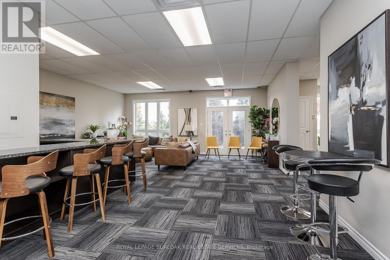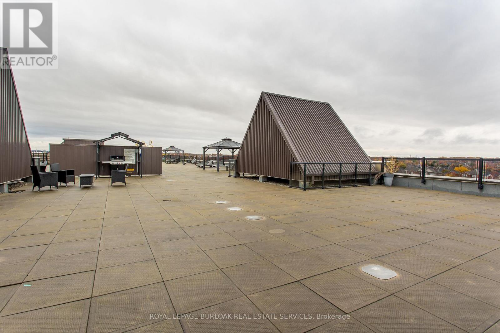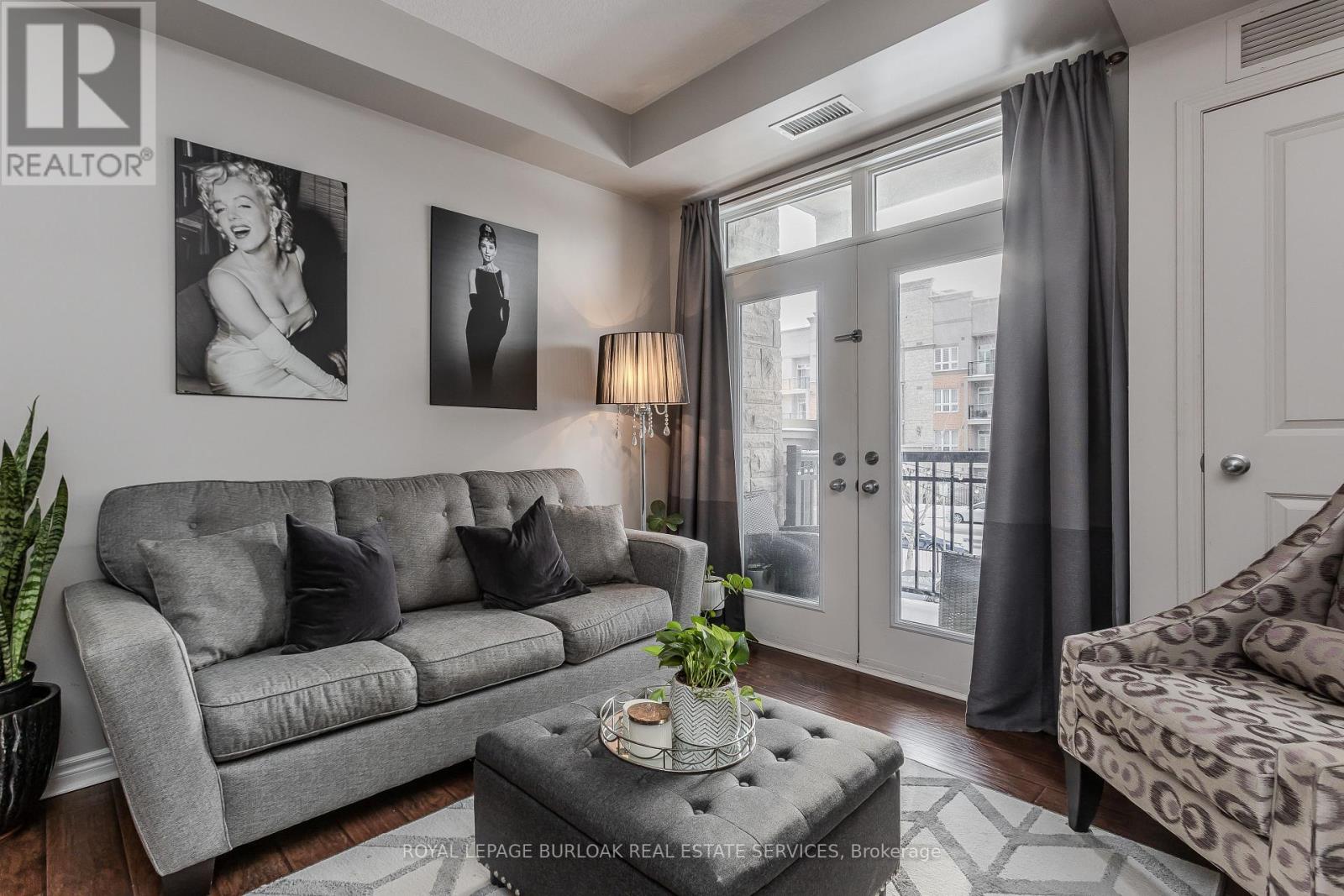 Welcome to effortless condo living in a highly desirable community that perfectly blends modern comfort with an unbeatable lifestyle location. Ideal for nature lovers, professionals, and commuters alike, this beautifully maintained condo is set just minutes from Bronte Creek Provincial Park, where scenic trails and green space invite you to unwind year-round. Everyday conveniences are close at hand with nearby schools, shopping, and dining, while easy highway access makes commuting simple and efficient. Step inside to a bright, open-concept interior designed for both style and function. Hardwood flooring flows throughout the unit, complemented by high ceilings that create an airy, welcoming atmosphere. The upgraded kitchen is a standout, featuring sleek granite countertops, a contemporary tile backsplash, stainless steel appliances, and a spacious island with breakfast bar seating-perfect for casual dining, entertaining guests, or morning coffee. The living room is filled with natural light and opens to a private west-facing balcony, offering a peaceful outdoor retreat and the perfect spot to enjoy sunset views. A dedicated dining area adds flexibility for hosting friends or enjoying relaxed meals at home. The spacious bedroom serves as a comfortable retreat, complete with a tray ceiling and a large window that allows natural light to pour in. A well-appointed 4-piece bathroom offers clean, modern finishes, while the convenience of in-unit laundry enhances everyday living. One parking space is included, with the opportunity to rent additional parking if needed. Residents also enjoy access to excellent building amenities, including a party room with kitchenette-ideal for celebrations and gatherings-and a generous rooftop terrace with BBQs, perfect for summer entertaining or relaxing outdoors. Offering low-maintenance living in a prime location surrounded by nature and urban conveniences, this condo delivers comfort, lifestyle, and value in one exceptional package. (id:4555)