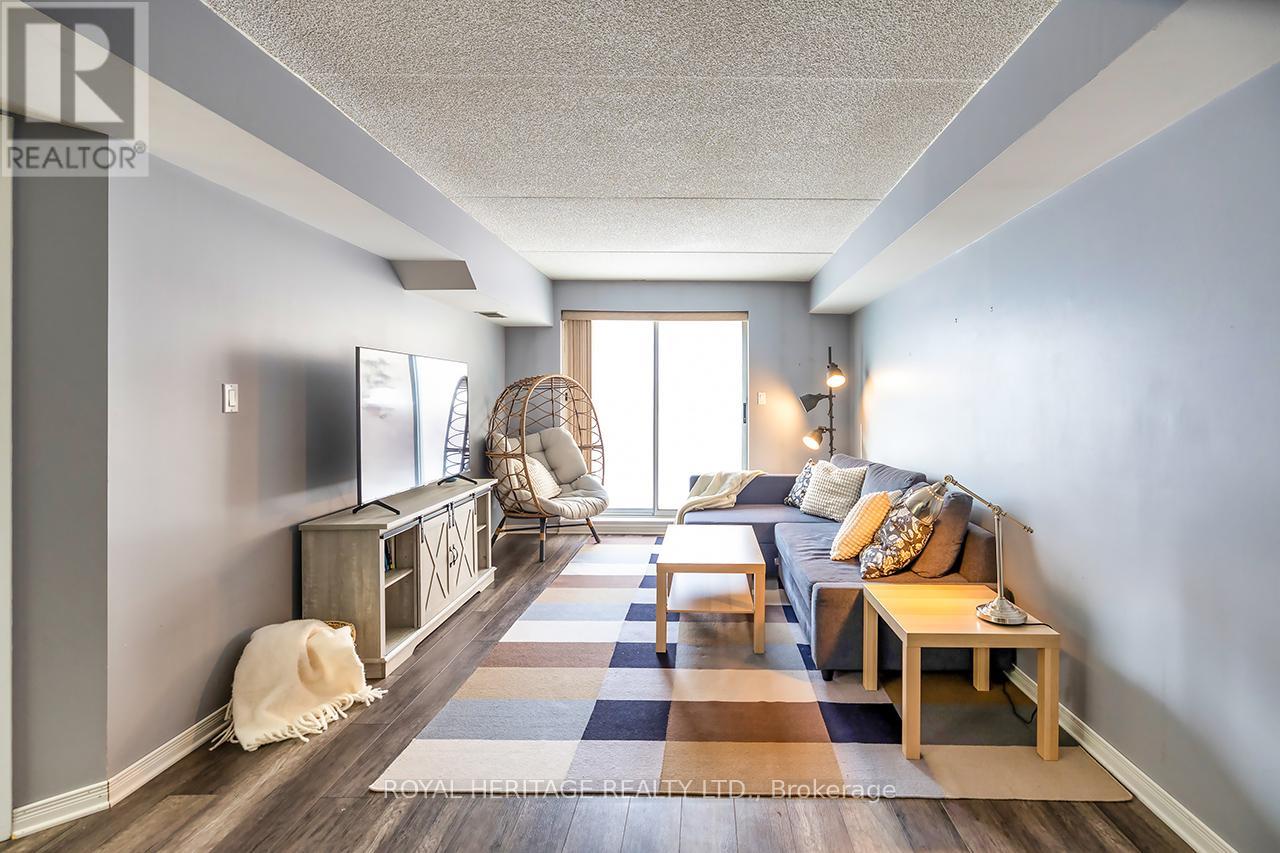 If these walls could talk, they'd tell the story of easy living in the heart of Walker's Square. This well-maintained 1 bedroom, 1 bathroom condo invites you in with a bright, open concept layout and a west facing walkout terrace that soaks in warm afternoon light. Life naturally gathers around the updated kitchen, where newer stainless steel appliances (2022), refreshed cabinetry, and a breakfast bar overlook the living and your soon-to-be dining spaces, perfect for quiet mornings or casual evenings. The thoughtfully updated bathroom, fresh paint, and new air conditioning unit (2021) add to the comfort and care felt throughout the home. The spacious primary bedroom offers a peaceful retreat with a closet and glowing natural light as the day winds down. Just outside the door, a conveniently located storage locker adds ease, while exclusive underground parking and amenities such as a fitness room, party/ meeting room, car wash station, and community BBQ area speak to a lifestyle well lived. Set within landscaped grounds and a well-cared-for building, this main floor unit is close from grocery shopping, parks, and everyday essentials, with quick access to the 403, QEW, and 407. A place where memories have been made and where your next chapter is ready to begin. (id:4555)