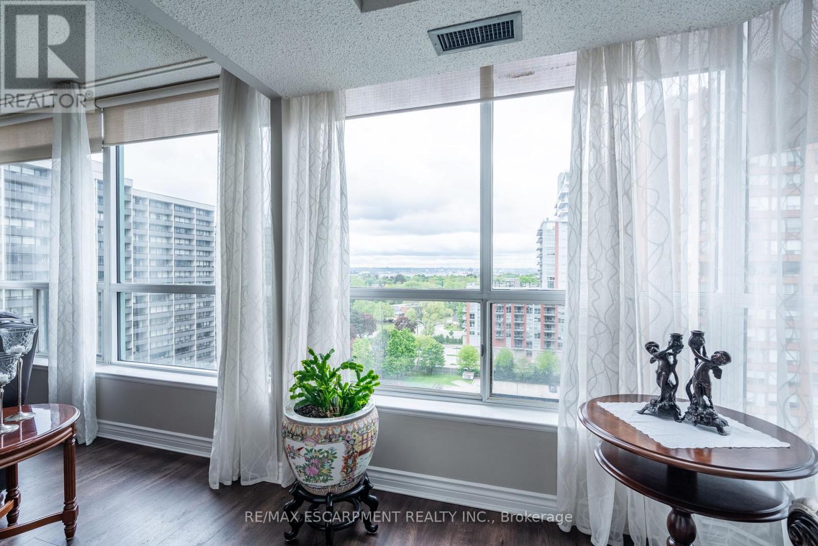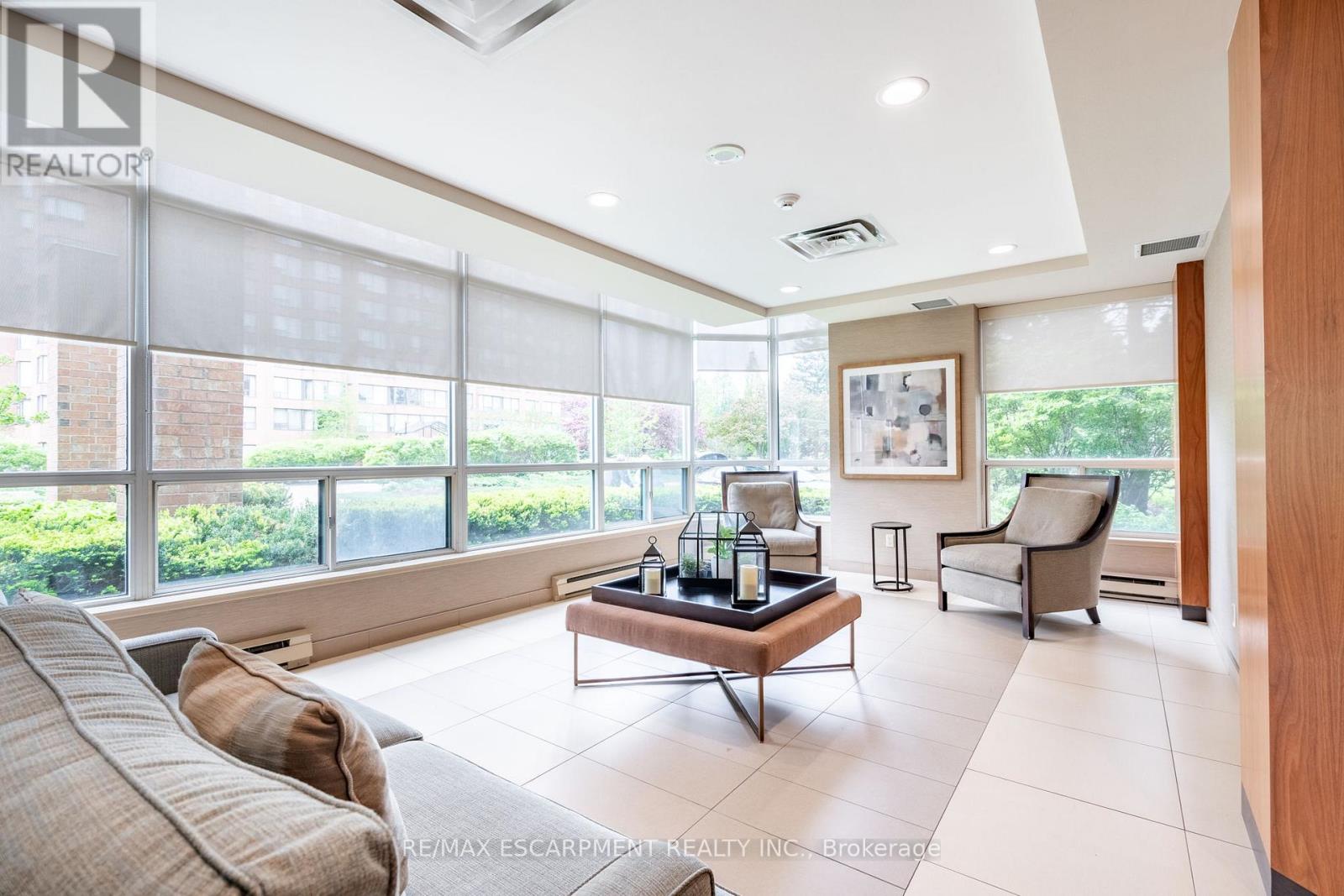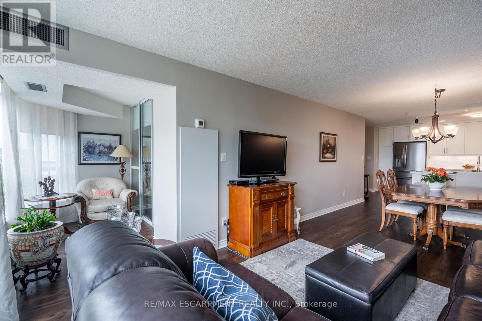 Welcome to an exceptional opportunity to own a beautifully appointed two-bedroom + den, two-bathroom suite in one of Burlington's most prestigious addresses. Set in Burlington's vibrant south core, residents enjoy unparalleled access to the lakefront, scenic parks, fine dining, boutique shopping and top-tier healthcare at nearby Joseph Brant Hospital - all just minutes from your door. Spanning approximately 1,130 square feet, this thoughtfully designed residence offers refined living with a seamless blend of comfort and sophistication. The spacious primary suite features a private four-piece ensuite, while the expansive open-concept living and dining areas provide an ideal setting for entertaining. The stylish eat-in kitchen is enhanced by granite countertops and a charming dinette - ideal for enjoying your morning coffee with panoramic views. Freshly painted and finished with engineered wood flooring throughout, the suite is bathed in natural light and showcases breathtaking views of the Bay and the Escarpment, creating a truly exceptional, elevated living experience. The Grande Regency is an meticulously maintained, smoke-free and pet-free building known for its discreet luxury and first-class amenities, including: 24-hour concierge and security, outdoor pool and sun deck, tennis and racquetball courts, state-of-the-art fitness Centre, sauna and private library, rooftop terrace with BBQ lounge and stylish party room and well-appointed guest suites. All-inclusive condo fees cover utilities, high-speed internet, cable and one underground parking space - delivering effortless convenience in a building celebrated for its exceptional service and lifestyle. RSA. (id:4555)