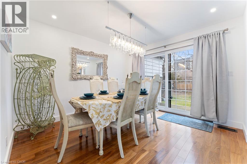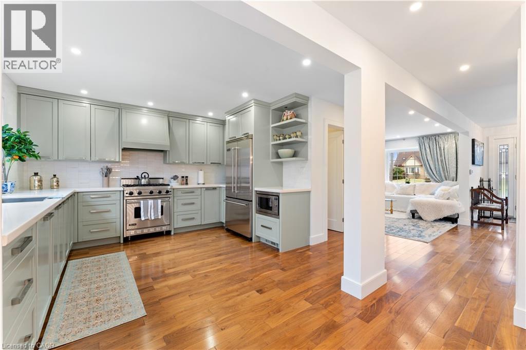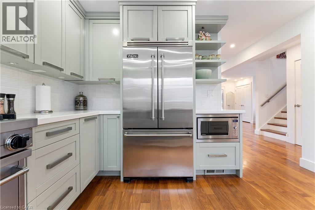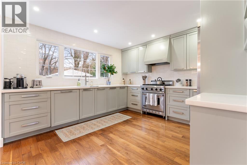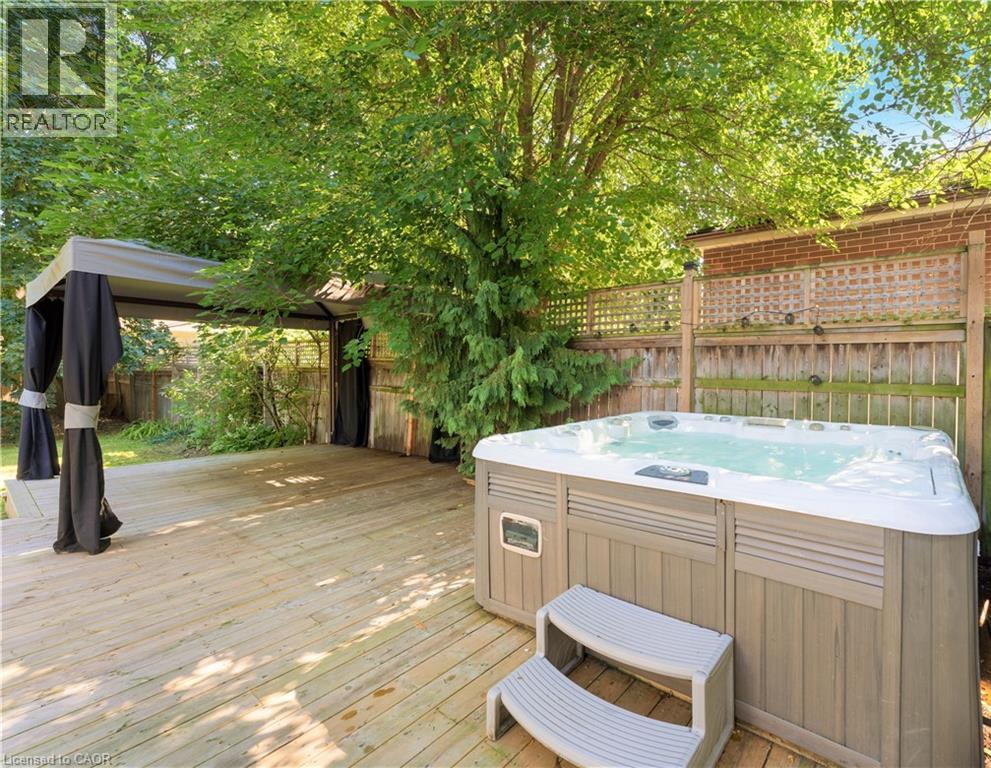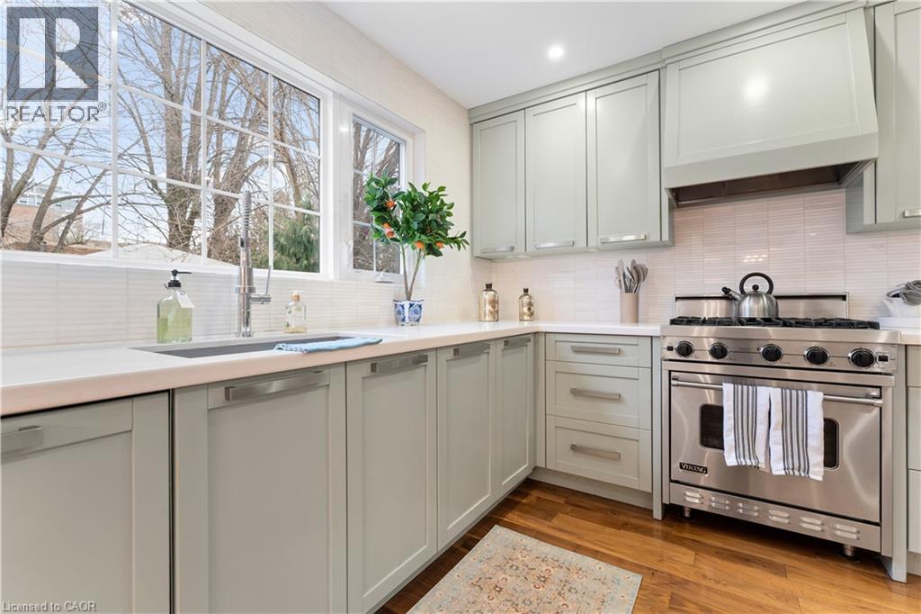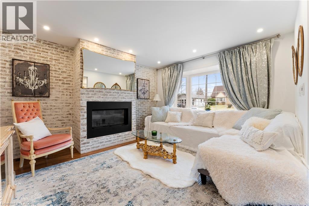 Walk to downtown and the lake from this beautifully renovated home on a quiet cul-de-sac. Set on an oversized 150-ft deep private lot, the property features mature perennial gardens and an interlock walkway leading to the front entrance. The open-concept main floor offers large windows, a gas fireplace, and a custom kitchen equipped with premium Viking appliances, including a gas range, dual-door refrigerator, panelled dishwasher, and built-in microwave. Patio doors off the dining area open to a private backyard with a custom wood deck and generous lawn surrounded by mature trees. Upstairs are two spacious bedrooms and a fully renovated 4-piece bathroom. The finished basement includes a separate entrance, kitchen space, open layout, and laundry, offering excellent flexibility. Ideally located within walking distance to Spencer Smith Park and Brant Street's shops and restaurants, with quick access to the QEW, Mapleview Mall, and daily amenities. (id:4555)