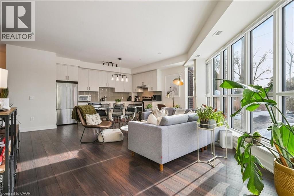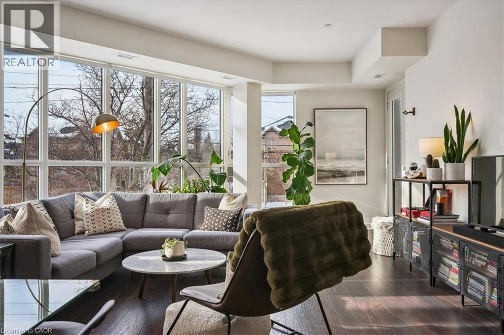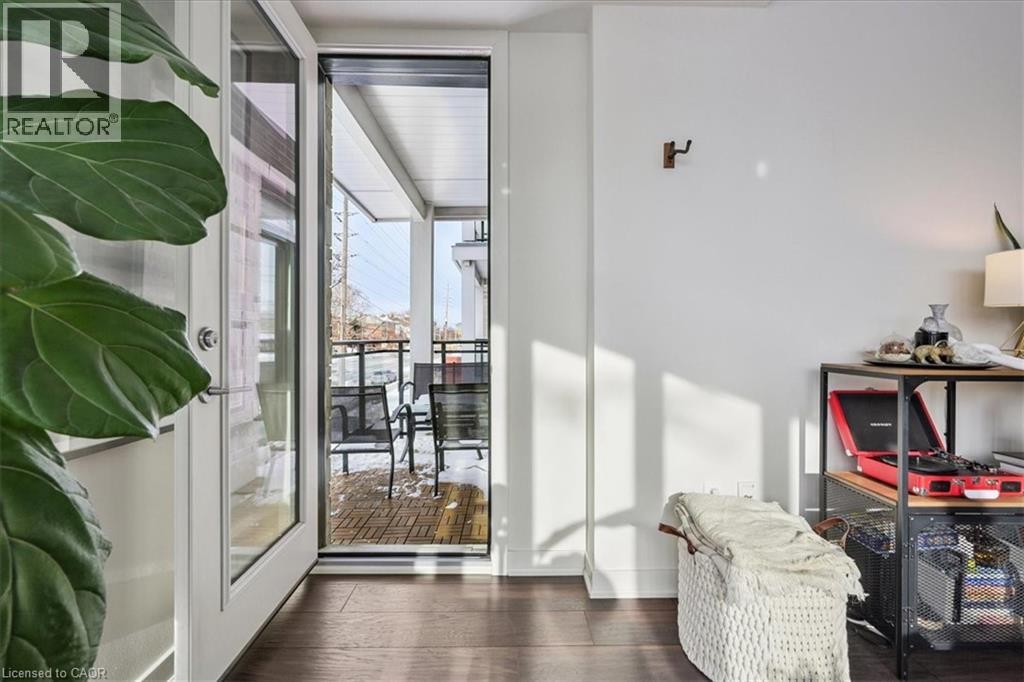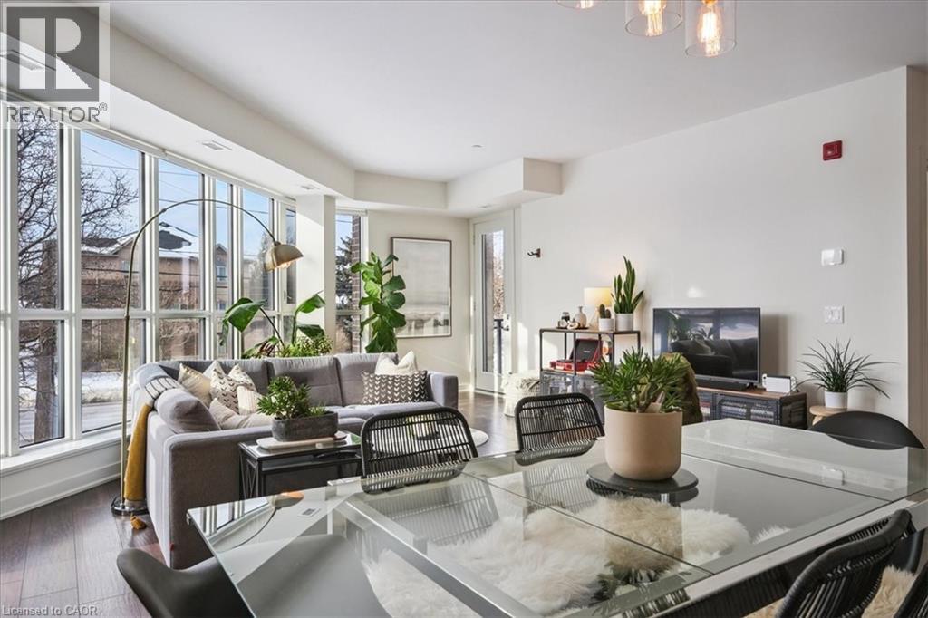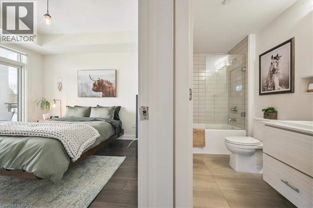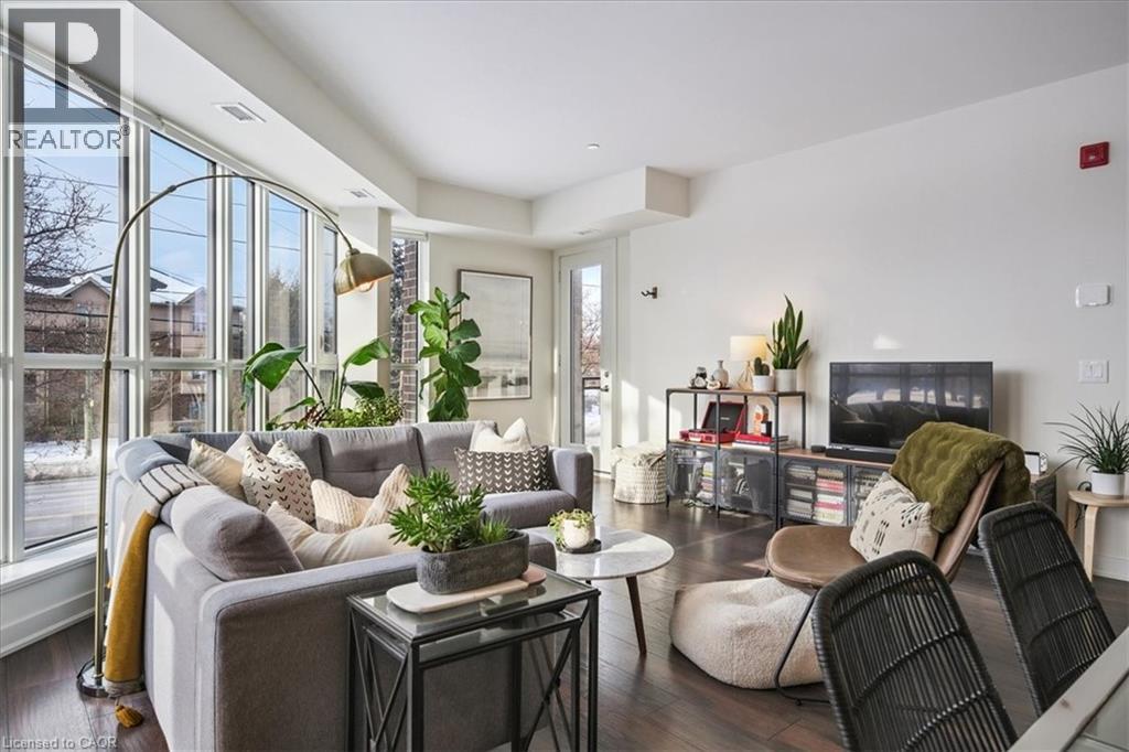 Floor-to-ceiling, wall-to-wall windows fill this stunning corner unit with natural light, creating a bright and airy space that truly sets it apart in this boutique low-rise building. The open layout is enhanced by 9-ft ceilings, wide plank hand-scraped flooring, and a welcoming foyer with plenty of storage. The sleek kitchen boasts quartz countertops, a glass backsplash, and modern appliances, while the spa-like bathroom features imported porcelain tile and ensuite privilege. Enjoy high-end roller blinds throughout, including blackout in the bedroom, plus walkouts to the spacious balcony from both the living room and bedroom. Built by Rosehaven Homes in 2020, this community offers exceptional amenities: a fitness and yoga studio, business centre, party room, rooftop terrace with BBQs, gardens, and fire pit, plus bike storage, visitor parking, and a dedicated dog area. The location is unbeatable just a short walk to Aldershot GO, shops, cafes, LaSalle Park, and the RBG, with quick highway access to the 403, QEW, and 407. (id:4555)