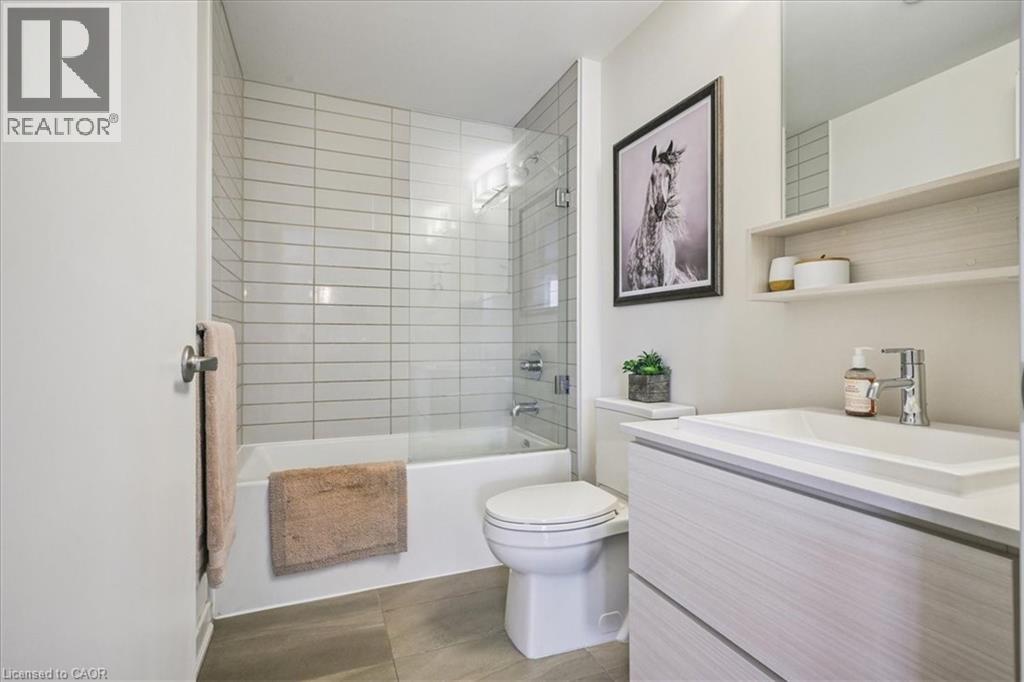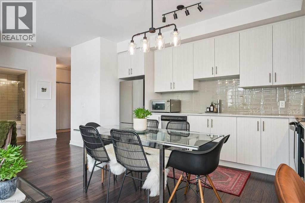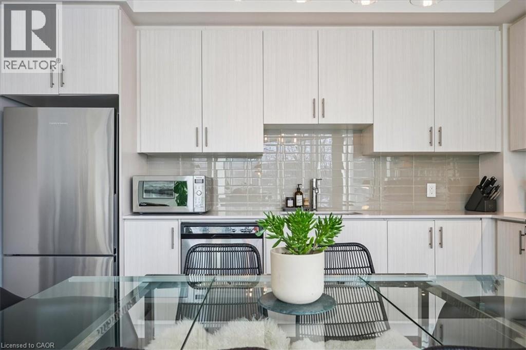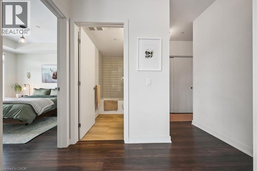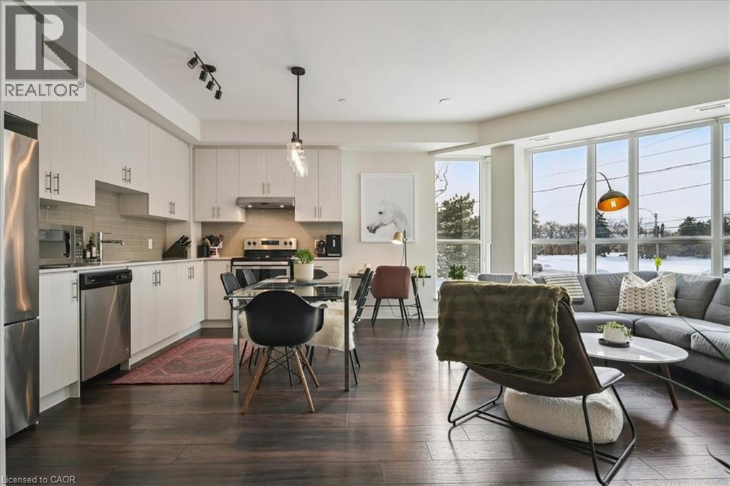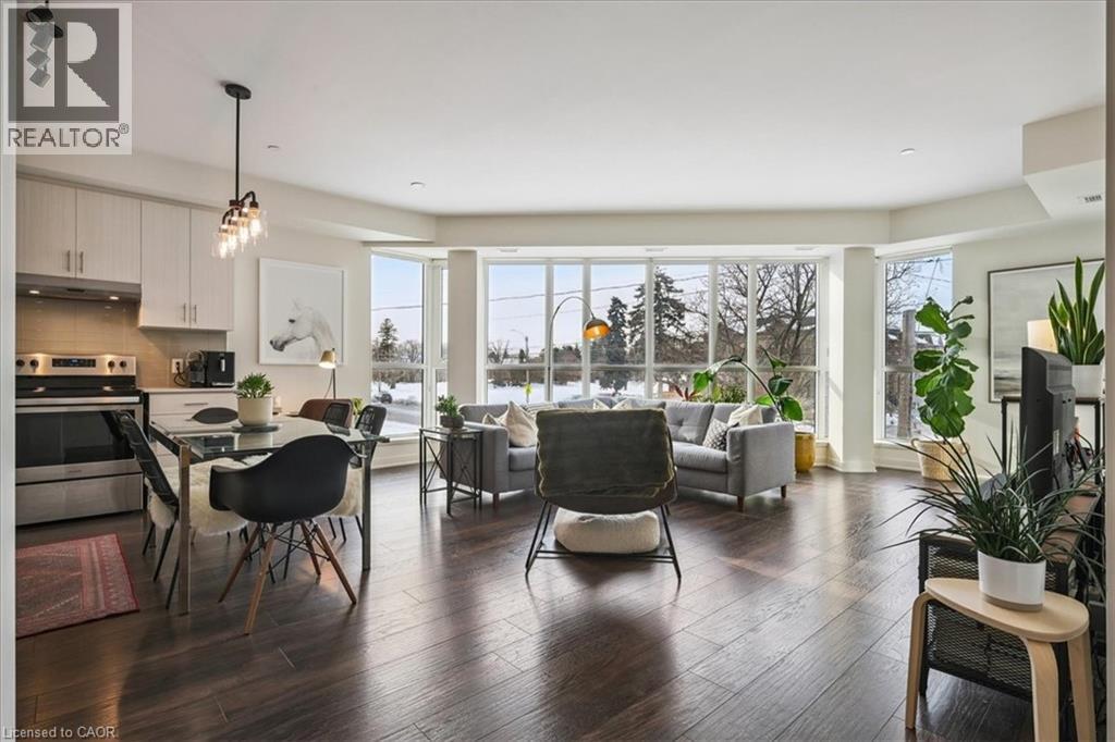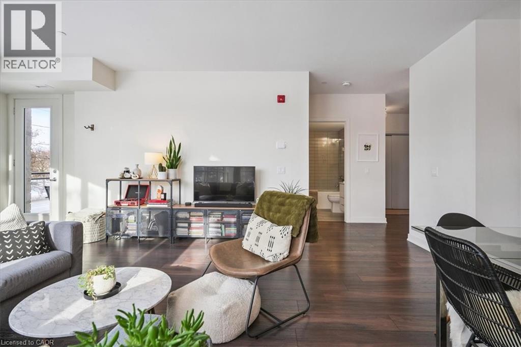 Floor-to-ceiling, wall-to-wall windows fill this stunning corner unit with natural light, creating a bright and airy space that truly sets it apart in this boutique low-rise building. The open layout is enhanced by 9-ft ceilings, wide plank hand-scraped flooring, and a welcoming foyer with plenty of storage. The sleek kitchen boasts quartz countertops, a glass backsplash, and modern appliances, while the spa-like bathroom features imported porcelain tile and ensuite privilege. Enjoy high-end roller blinds throughout, including blackout in the bedroom, plus walkouts to the spacious balcony from both the living room and bedroom. Built by Rosehaven Homes in 2020, this community offers exceptional amenities: a fitness and yoga studio, business centre, party room, rooftop terrace with BBQs, gardens, and fire pit, plus bike storage, visitor parking, and a dedicated dog area. The location is unbeatable just a short walk to Aldershot GO, shops, cafes, LaSalle Park, and the RBG, with quick highway access to the 403, QEW, and 407. (id:4555)