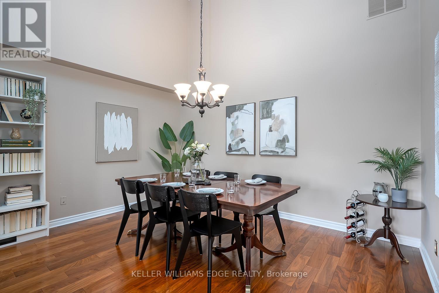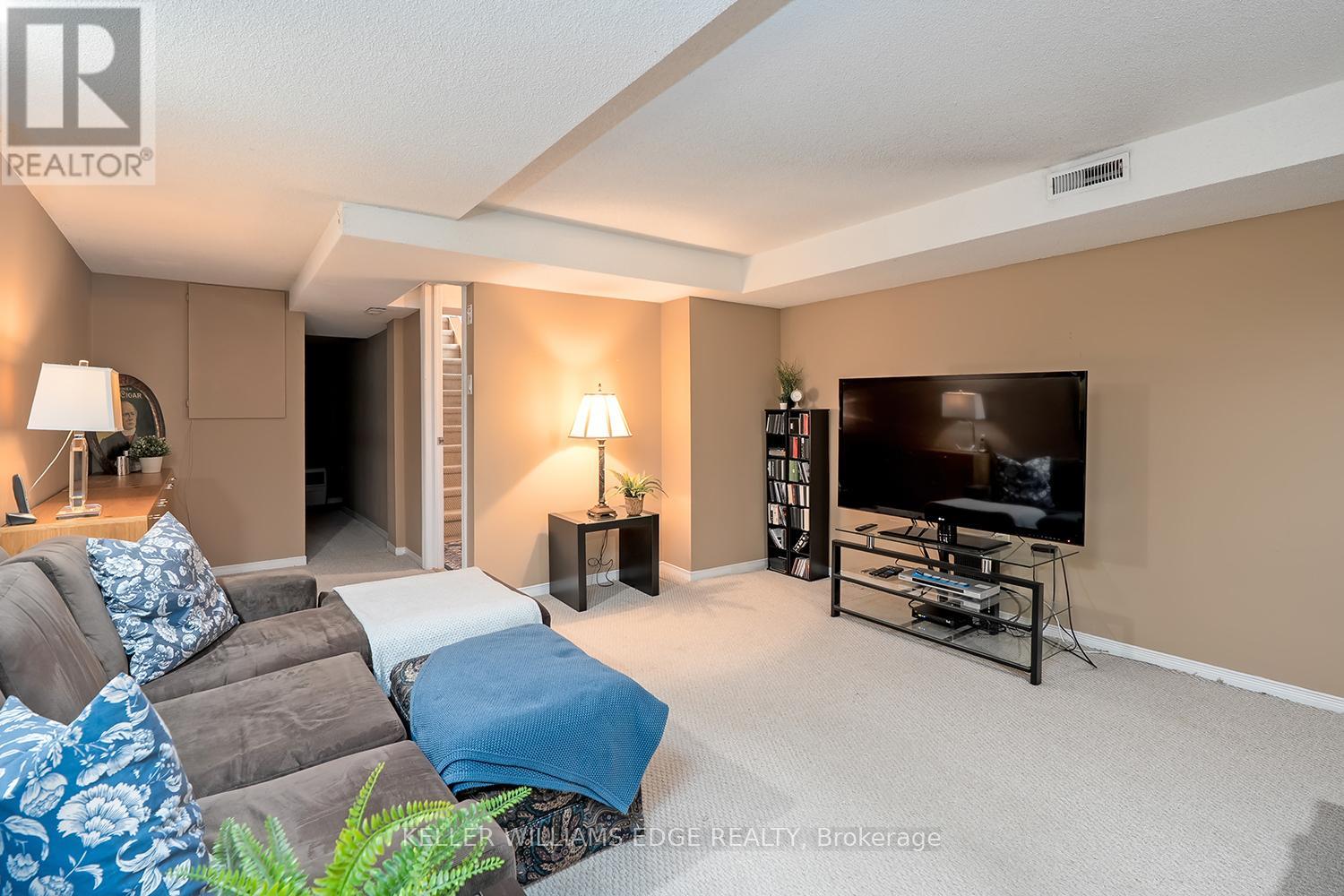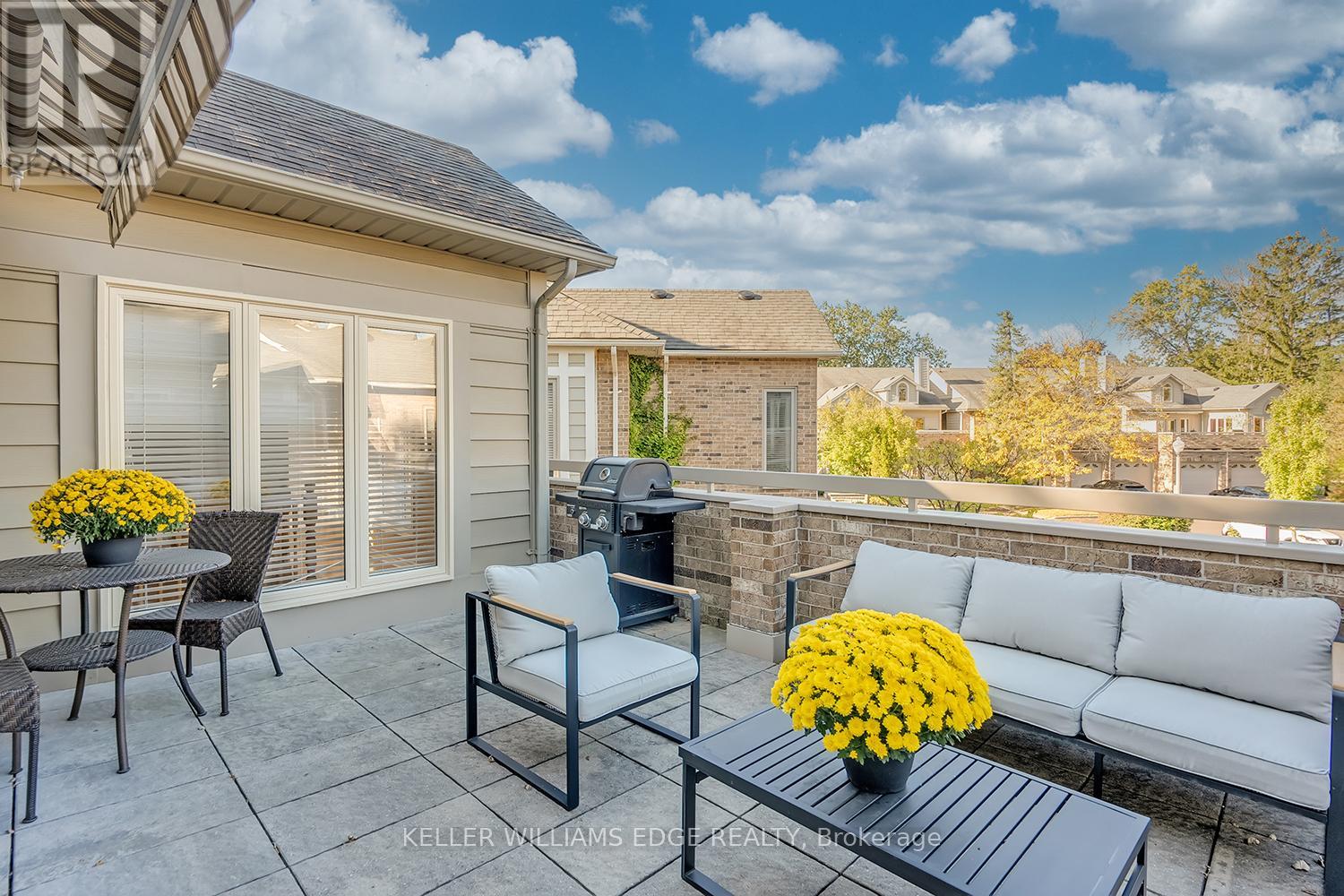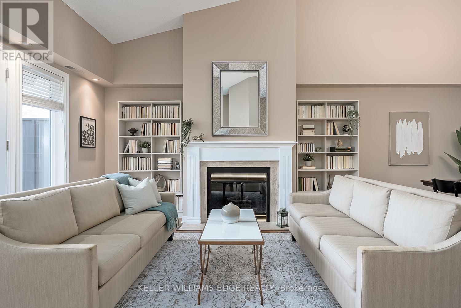 Welcome to The Terraces, a prestigious and seldom-offered enclave nestled in one of Burlington's most desirable neighbourhoods; Roseland. This bright end-unit townhome offers just over 1,900 sq. ft. of beautifully finished living space, featuring 2 bedrooms, 2 bathrooms, and an open-concept layout that blends comfort with timeless style.The spacious living and dining room is filled with natural light and highlighted by soaring vaulted ceilings, rich walnut flooring, and a cozy gas fireplace. French doors lead to your private terrace with an awning - an ideal spot to unwind outdoors, whether enjoying a quiet morning or a peaceful evening.The cheerful kitchen provides ample counter space and storage, while the main-floor primary suite is a true retreat with a 4-piece ensuite and generous his-and-hers closets. A second bedroom with a walk-in closet offers flexible space for guests or a home office, with convenient access to the main 3-piece bath. Main floor laundry further enhances the ease of everyday living.Downstairs, the fully finished basement adds valuable bonus space with a recreation room, den, and rough-in for an additional bathroom. Inside entry from the attached garage and plenty of visitor parking complete the package.With snow removal right to your door, landscaping, and exterior maintenance all taken care of, this home offers the ultimate in worry-free living - perfect for those seeking a simplified lifestyle without giving up space or quality.Ideally located close to downtown Burlington, the waterfront, parks and trails, shopping, and highway access, this immaculate home delivers exceptional comfort, convenience, and community in an unbeatable Roseland setting. (id:4555)