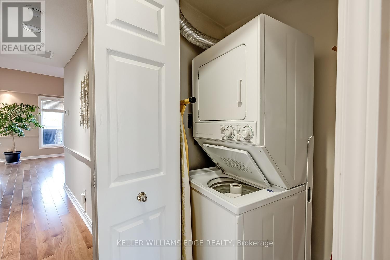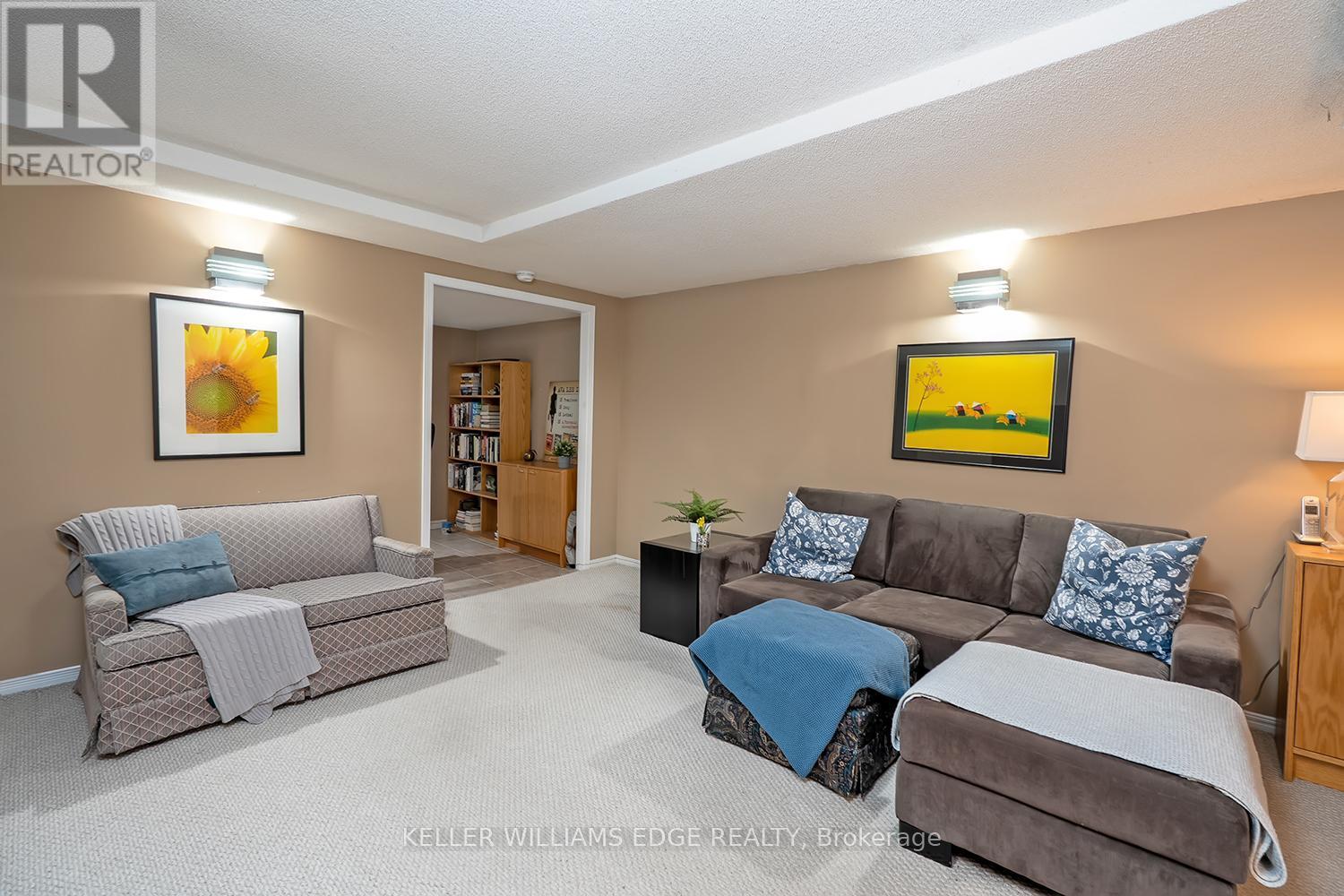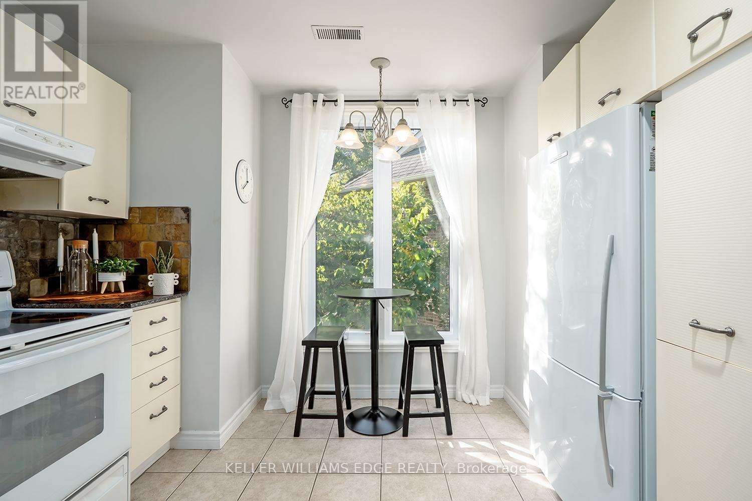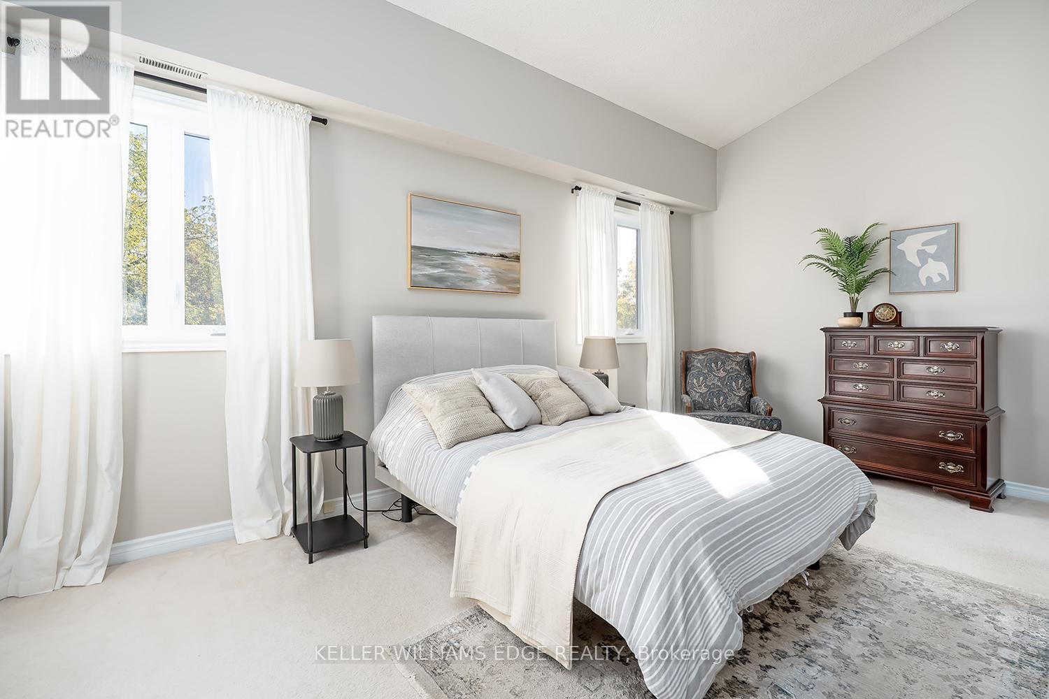 Welcome to The Terraces, a prestigious and seldom-offered enclave nestled in one of Burlington's most desirable neighbourhoods; Roseland. This bright end-unit townhome offers just over 1,900 sq. ft. of beautifully finished living space, featuring 2 bedrooms, 2 bathrooms, and an open-concept layout that blends comfort with timeless style.The spacious living and dining room is filled with natural light and highlighted by soaring vaulted ceilings, rich walnut flooring, and a cozy gas fireplace. French doors lead to your private terrace with an awning - an ideal spot to unwind outdoors, whether enjoying a quiet morning or a peaceful evening.The cheerful kitchen provides ample counter space and storage, while the main-floor primary suite is a true retreat with a 4-piece ensuite and generous his-and-hers closets. A second bedroom with a walk-in closet offers flexible space for guests or a home office, with convenient access to the main 3-piece bath. Main floor laundry further enhances the ease of everyday living.Downstairs, the fully finished basement adds valuable bonus space with a recreation room, den, and rough-in for an additional bathroom. Inside entry from the attached garage and plenty of visitor parking complete the package.With snow removal right to your door, landscaping, and exterior maintenance all taken care of, this home offers the ultimate in worry-free living - perfect for those seeking a simplified lifestyle without giving up space or quality.Ideally located close to downtown Burlington, the waterfront, parks and trails, shopping, and highway access, this immaculate home delivers exceptional comfort, convenience, and community in an unbeatable Roseland setting. (id:4555)