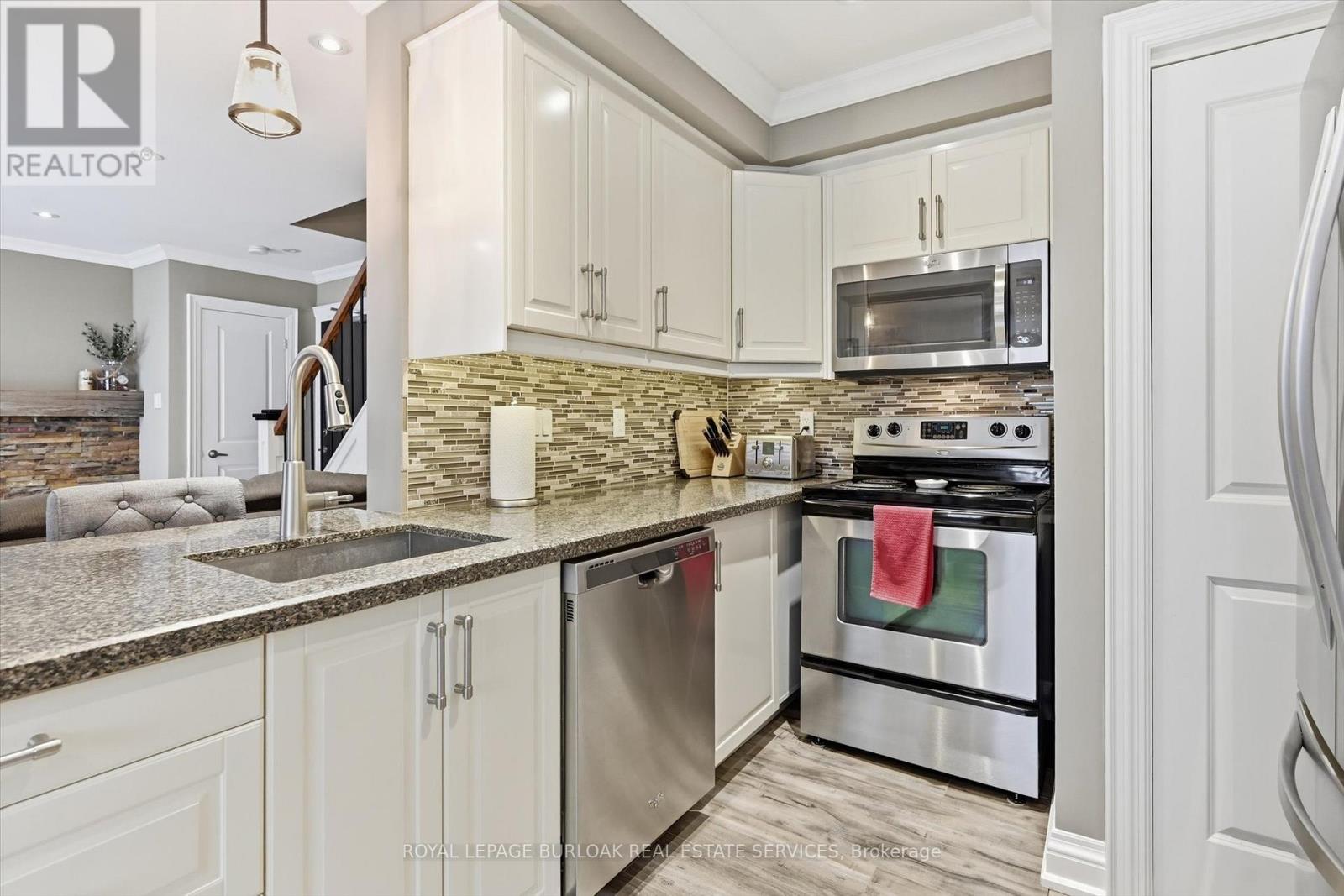 Spacious 2 bedroom townhome located in desirable south Burlington. Perfect for for first time home buyers, professionals, and downsizers. This home has been recently renovated to maximize living space and comfort. The entrance welcomes you to a bright and inviting main floor with cozy accents. The Living room features a decorative brick wall complete with electric fireplace and beam mantel. The Kitchen features plenty of storage with quartz counters and stainless steel appliances. Finished space under the stairs offers potential for home office or reading nook. A separate dining area is perfect for family dinners or entertaining. Patio doors provide walk-out access to a private fenced backyard. The second level features two generous bedrooms filled with natural light, an updated 4-piece bathroom, and a separate laundry/storage room with brand new washer/dryer unit. Low-maintenance living - condo fees include water, landscaping of common areas, and snow removal. Well maintained building has separate laundry room for owners and includes visitor parking. Incredible location close to the lake, Centennial trail, downtown, highways, shopping and public transit. Ready to move in! (id:4555)