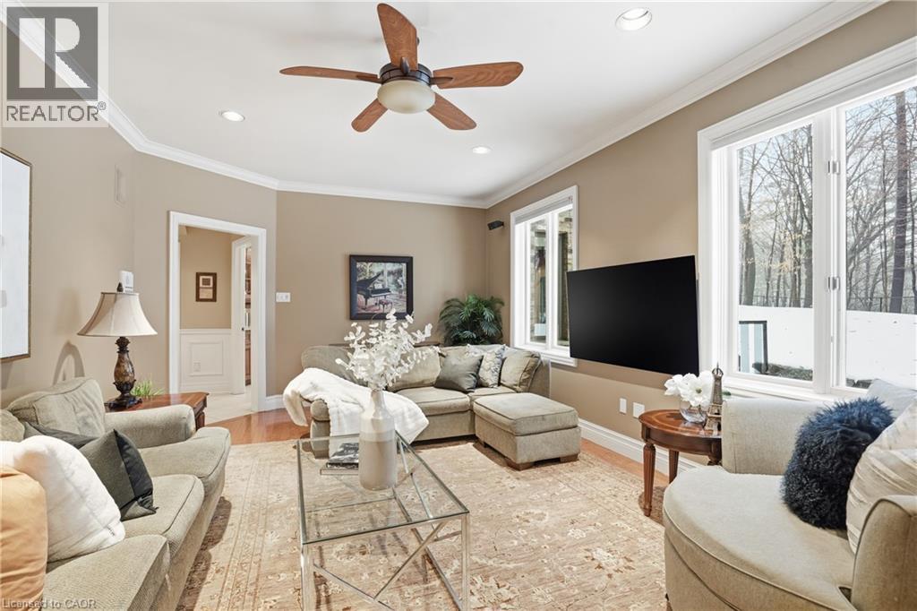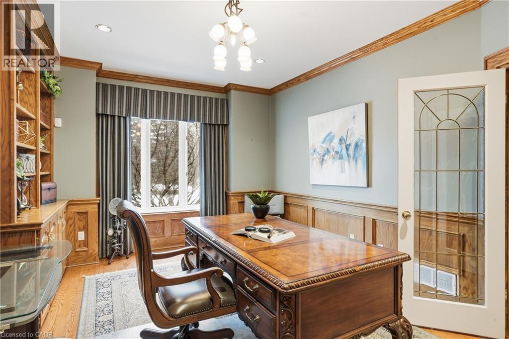 Welcome to a truly enchanting ravine estate in Burlington’s prestigious Tyandaga neighbourhood. With over 6,300 sq ft of beautifully finished living space set on an extraordinary 102’ x 220’ wooded lot, this executive residence blends timeless elegance with impressive scale and rare privacy, bordered by nature with no neighbours on two sides. A stately brick facade, triple car garage with parking for 9 vehicles, and sweeping paver driveway create a graceful arrival. Inside, soaring 9’ ceilings, rich hardwood floors, crown moulding, custom wainscoting and classic French doors evoke a sense of grandeur while remaining warm and inviting. The fully renovated Gravelle Woodworking chef’s kitchen is a showpiece, featuring solid maple cabinetry, granite countertops, premium appliances, a beverage bar and a sunlit breakfast area overlooking the tranquil ravine. The family room, centred around a striking stone gas fireplace and framed by panoramic views, feels like the heart of the home, while formal living and dining rooms offer elegant spaces for unforgettable gatherings. Upstairs reveals 4 spacious bedrooms, 4 bathrooms and a dedicated office, including a serene primary retreat with bay window, custom walk-in closet and spa-inspired 6-piece ensuite with peaceful ravine vistas. The fully finished lower level offers a private in-law suite with 2 bedrooms, ensuites, a full kitchen, laundry and multiple living areas—ideal for multi-generational living. Outdoors, unwind on the composite deck surrounded by ambient lighting, a stone fountain, irrigation system and gated ravine access. A rare and captivating blend of space, refinement and natural beauty in one of Burlington’s most coveted enclaves—truly a must see to fully appreciate. (id:4555)