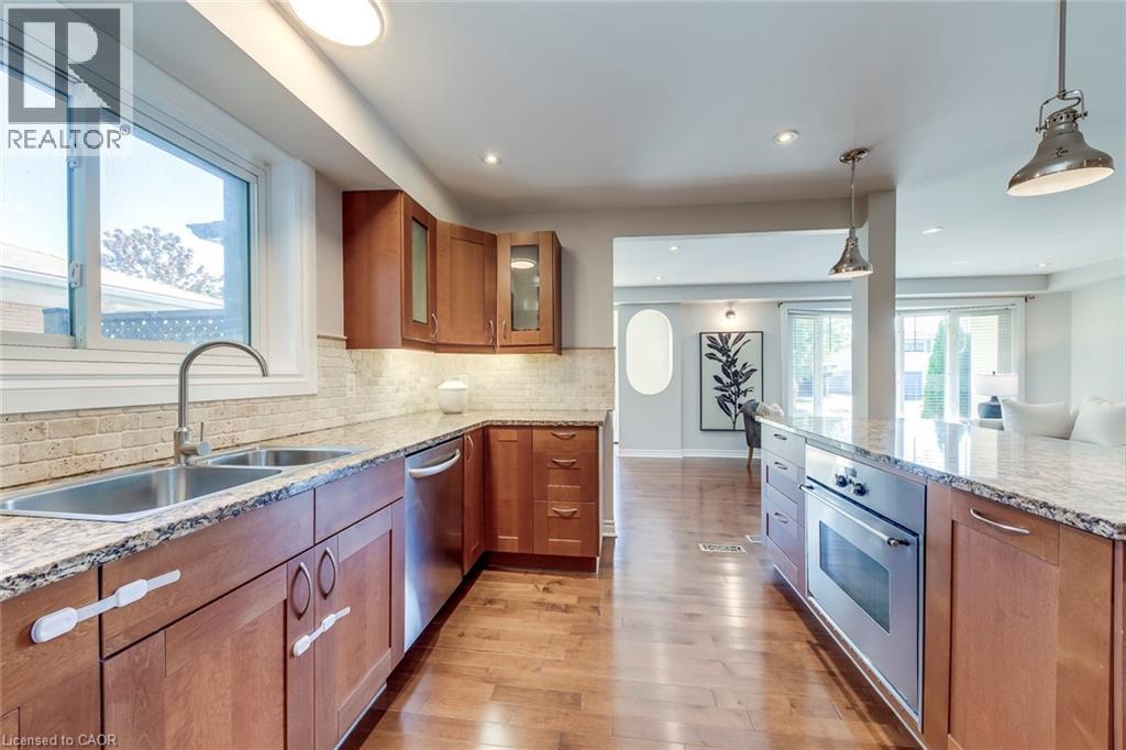 This spacious 3+1 bedroom, 4-bathroom custom-built home sits on a quiet street in Burlington’s sought-after Pinedale, just minutes from parks, schools, shopping, and major highways. Offering nearly 2,680 sqft above grade plus a fully finished basement, it’s ideal for growing families. The modern stucco exterior with large windows adds striking curb appeal. Inside, the main floor features an open-concept layout with a bright living room and a large eat-in kitchen showcasing hardwood cabinetry, a generous island, stone counters, and premium stainless steel appliances. The upgraded laundry/mud room provides access to both the garage and backyard. A raised second level impresses with soaring cathedral ceilings, massive windows, and a versatile family/dining space. An elegant open-riser staircase leads to the third floor with a luxurious primary suite offering wall-to-wall custom closets, oversized windows, and a spa-like ensuite with glass shower. Two additional bedrooms share a renovated 4-piece bath. The finished basement boasts above-grade windows, a spacious rec room with wet bar, a fourth bedroom, and full bath. Outdoors, the backyard offers space to relax or entertain amid mature trees and established landscaping. The location is unmatched—15 minutes on foot to Fortinos, Shoppers, and Appleby Plaza restaurants; five playgrounds within walking distance; and easy access to Centennial Bikeway, downtown Burlington, the lakefront, Burloak Waterfront Park, and GO transit. Just a short drive to RioCan Centre with shops, restaurants, cinema, and a soon-to-open Costco. Recent upgrades include front and back decks stained (2025), interlock patio (2025), fridge (2024), washer (2022), and microwave (2022). (id:4555)