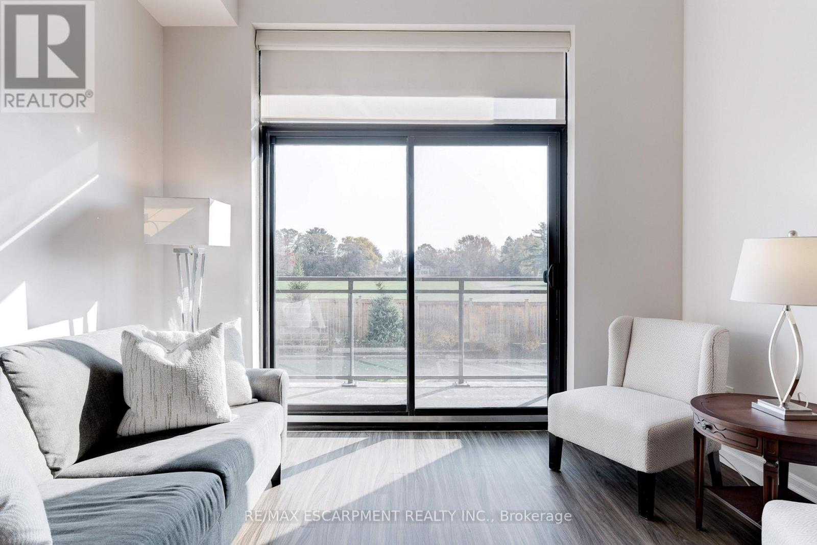 Welcome to the THE GARDENS BY MARANATHA a fully wheelchair accessible 55+ community in the heart of South Burlington. This spacious 1 bedroom plus den life lease suite offers 950 sq. ft. of bright, open-concept living. Features include a kitchen with stainless steel appliances and ample cabinetry, dining area and a living room with walkout to a south facing balcony overlooking views of mature trees and open green space. The primary suite offers a walk in closet and wheelchair accessible en-suite with roll in shower. A second 2 piece bathroom and in-suite laundry complete the unit. Amenities: lounge, coffee shop, workshop, fitness room, party room, meeting room, outdoor terrace, underground parking and lockers. Steps to shopping, parks, churches, transit, lakefront trails, hospital, senior centre, library, and downtown Burlington. Condo fees include insurance, maintenance, common elements, landscaping, heat, parking, snow removal, and water. (id:4555)