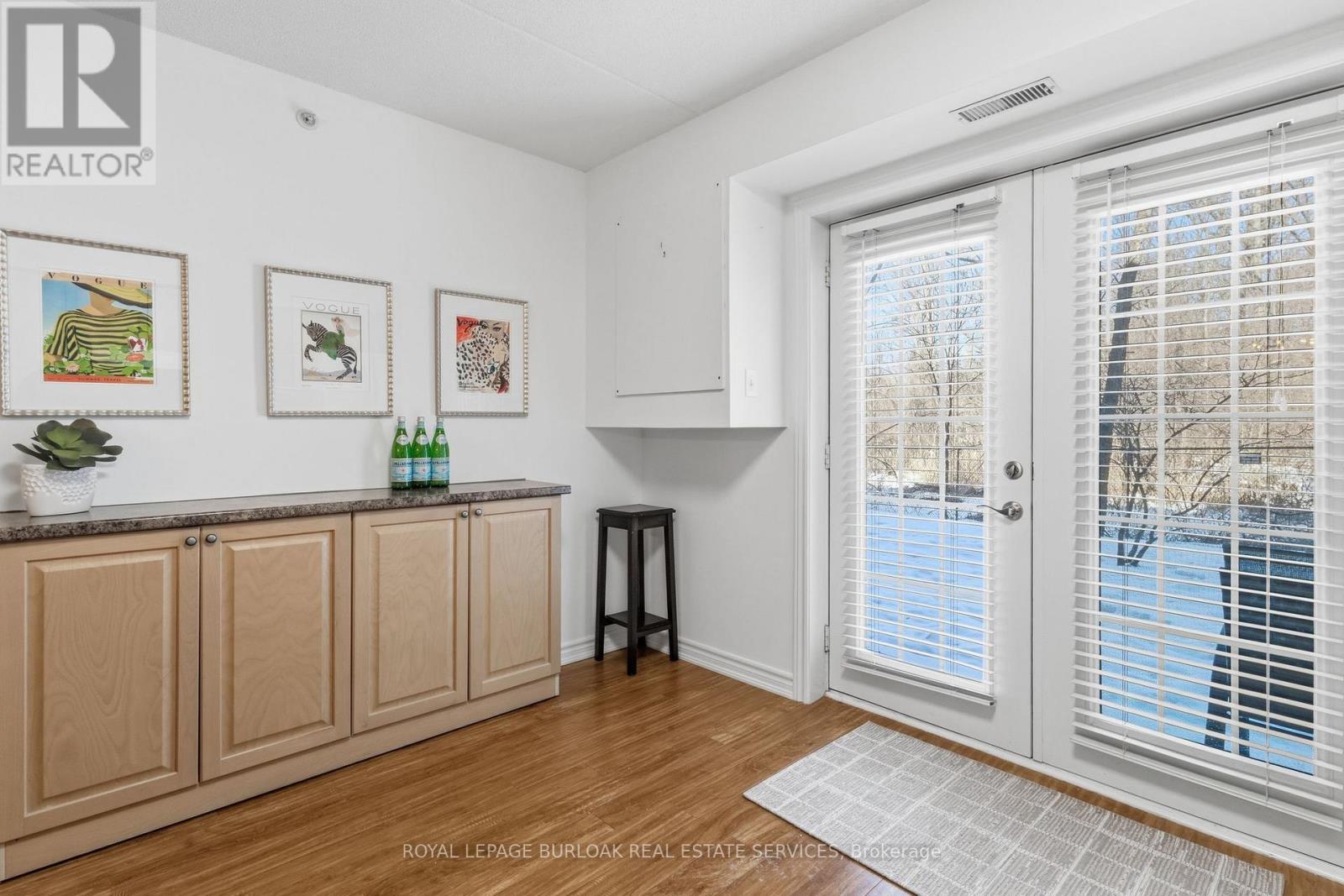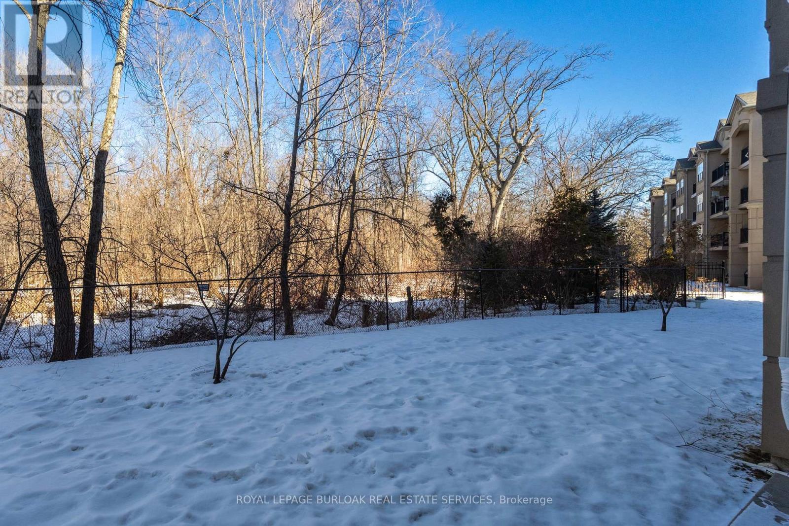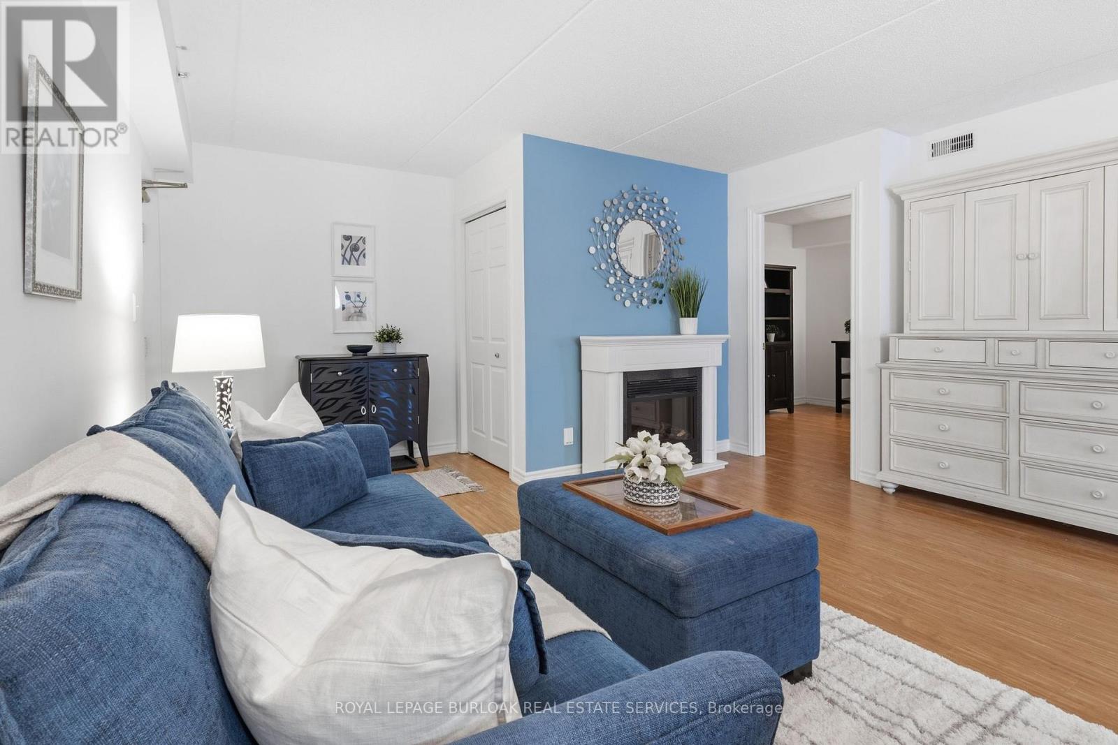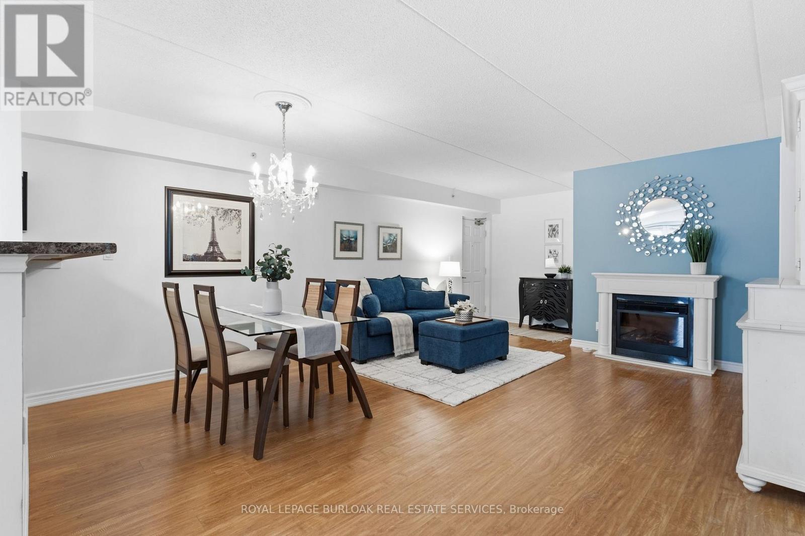 Spacious one-bedroom plus den, Hampton Model, in the highly desirable Uptown Orchard Condominium, offering over 800 sq. ft. of thoughtfully designed living space. This ground-floor suite features a walkout to a private patio backing onto a protected, treed ravine, the perfect setting for peaceful morning coffee or evening relaxation. Open-concept living and dining area, is complete with an electric fireplace, and flows seamlessly into the bright eat-in kitchen featuring ample cabinetry and generous counter space. The primary bedroom includes a double closet and a charming alcove ideal for enjoying the ravine views. The versatile den, complete with a walk-in closet, is ideal for a home office or guest bedroom. A four-piece bathroom conveniently incorporates an in-suite laundry. This suite includes one underground parking space and a storage locker. The clubhouse, just steps from your door, offers exceptional amenities including a gym, sauna, and party room with kitchen. Ample visitor parking is also available. Ideally located within walking distance to grocery stores, shops, restaurants, daycare, fitness centres, and public transit. Situated in North Burlington's Orchard community, with easy access to the GO Station, QEW, 407, and Bronte Park. Urban convenience meets tranquil ravine living. (id:4555)