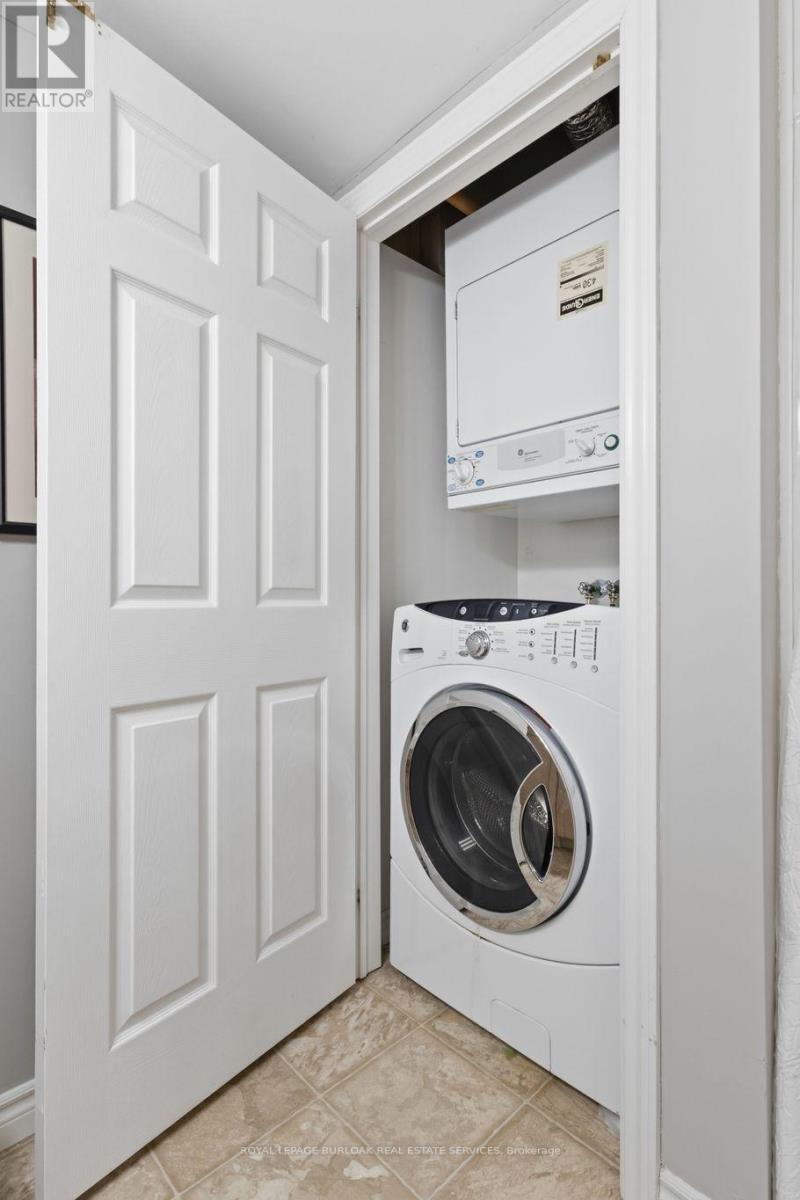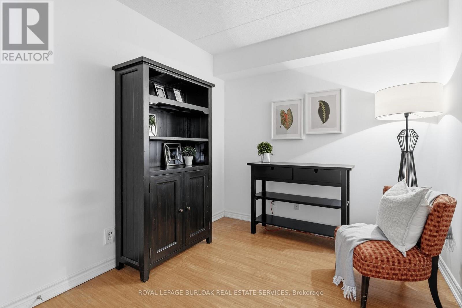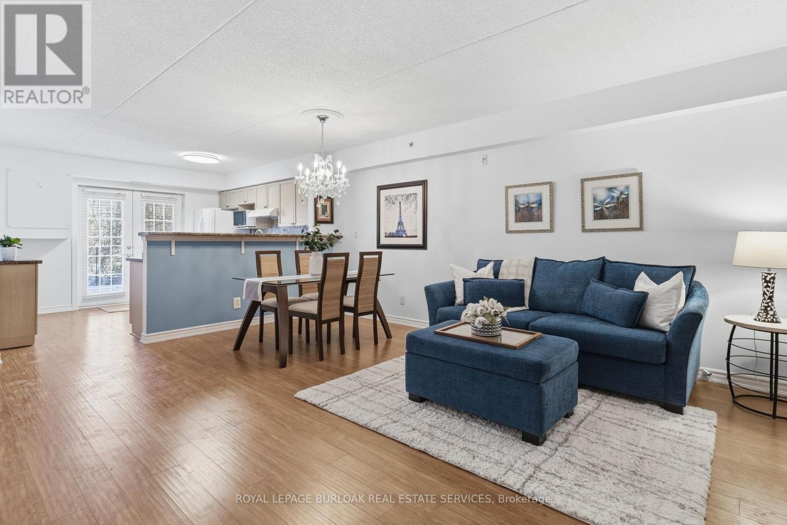 Spacious one-bedroom plus den, Hampton Model, in the highly desirable Uptown Orchard Condominium, offering over 800 sq. ft. of thoughtfully designed living space. This ground-floor suite features a walkout to a private patio backing onto a protected, treed ravine, the perfect setting for peaceful morning coffee or evening relaxation. Open-concept living and dining area, is complete with an electric fireplace, and flows seamlessly into the bright eat-in kitchen featuring ample cabinetry and generous counter space. The primary bedroom includes a double closet and a charming alcove ideal for enjoying the ravine views. The versatile den, complete with a walk-in closet, is ideal for a home office or guest bedroom. A four-piece bathroom conveniently incorporates an in-suite laundry. This suite includes one underground parking space and a storage locker. The clubhouse, just steps from your door, offers exceptional amenities including a gym, sauna, and party room with kitchen. Ample visitor parking is also available. Ideally located within walking distance to grocery stores, shops, restaurants, daycare, fitness centres, and public transit. Situated in North Burlington's Orchard community, with easy access to the GO Station, QEW, 407, and Bronte Park. Urban convenience meets tranquil ravine living. (id:4555)