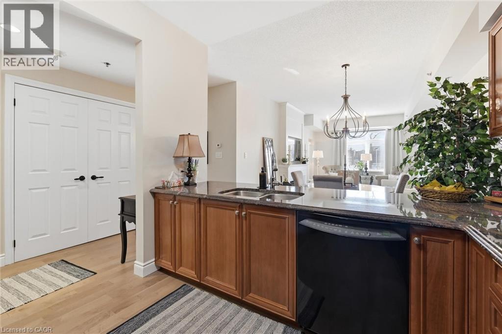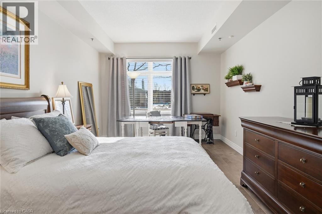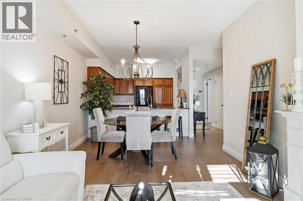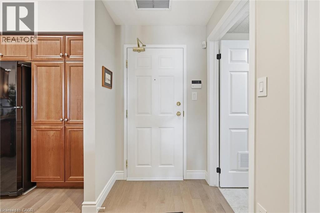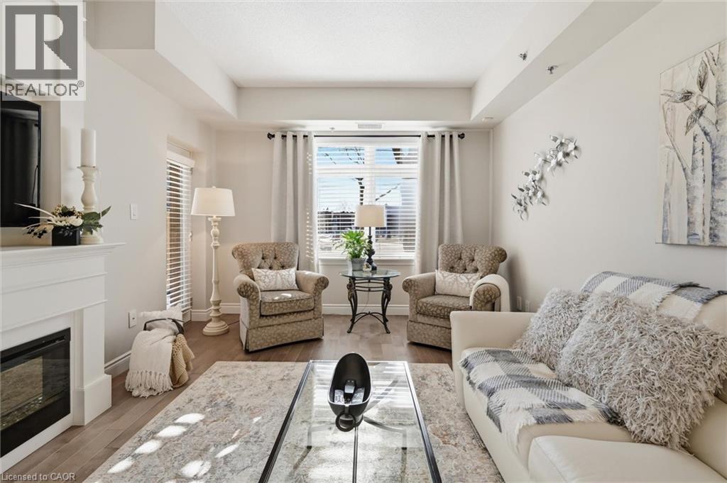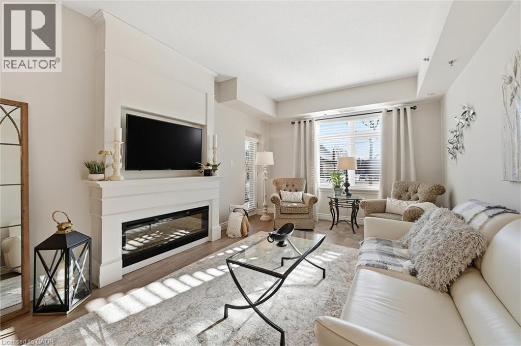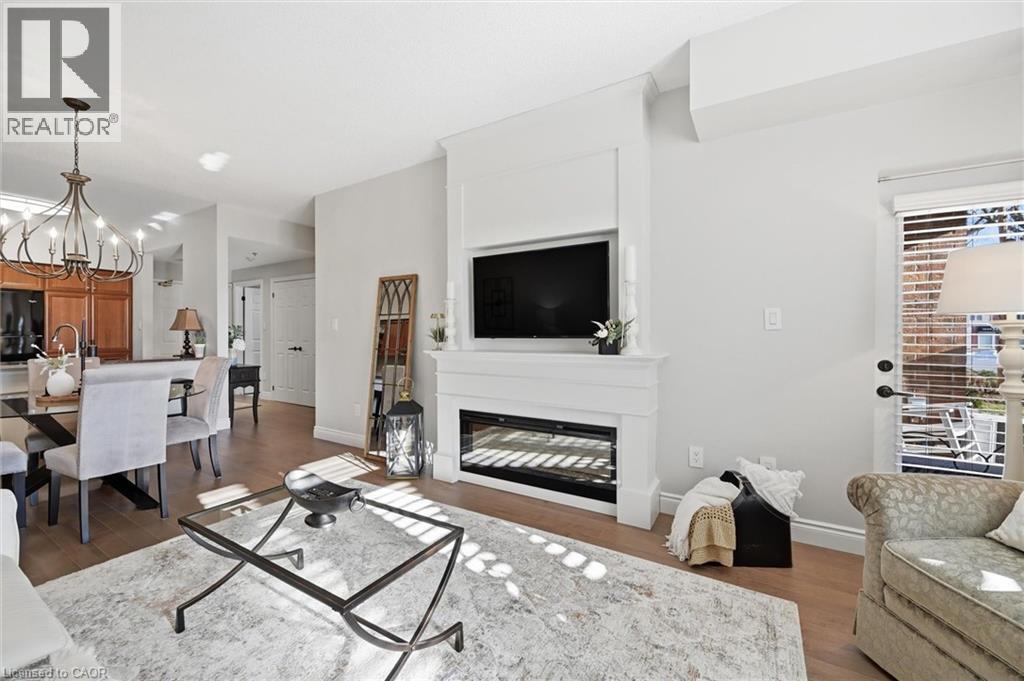 Beautifully updated 2 Bedroom, 2 Bathroom ground floor suite in The Dovercourt offering 1,186 sq ft of bright, functional living space with a private west facing terrace. This thoughtfully upgraded unit features new maple engineered hardwood flooring throughout, upgraded baseboards, modern black door hardware & a sleek electric fireplace with custom mantle. Fresh neutral paint throughout creates a clean, modern feel. The kitchen offers granite counters, upgraded lighting & generous cabinetry including a large pantry with custom pullout drawers designed for maximum organization and ease of access. The open concept living & dining area is filled with natural light from oversized west facing windows & walks out to a private terrace, perfect for relaxing or entertaining. Designed with comfort & ease in mind, the unit features 32 inch doorways & a spacious layout that allows for excellent flow throughout. Thoughtful storage has been incorporated into every closet, maximizing functionality without sacrificing space. A separate laundry room adds rare convenience along with additional storage, a feature not often found in condo living. The main bathroom has been updated with a new vanity & refreshed jetted tub, while the primary bedroom offers excellent closet space, a private ensuite & plenty of room for your favourite hobby, whether it’s puzzles, sewing, or a serene space for your morning yoga. Includes 2 parking spaces and 1 storage locker. One above ground parking space is ideal for quick trips or overnight guests. The second underground space is conveniently located close to the elevator with a 4ft x 9ft locker directly behind it for convenient everyday access. Well maintained low rise building in a prime Burlington location close to the GO Station, QEW, Royal Botanical Gardens, Burlington Golf & Country Club & everyday amenities. An exceptional opportunity for those seeking space, privacy, accessibility & convenience in a sought after community. (id:4555)