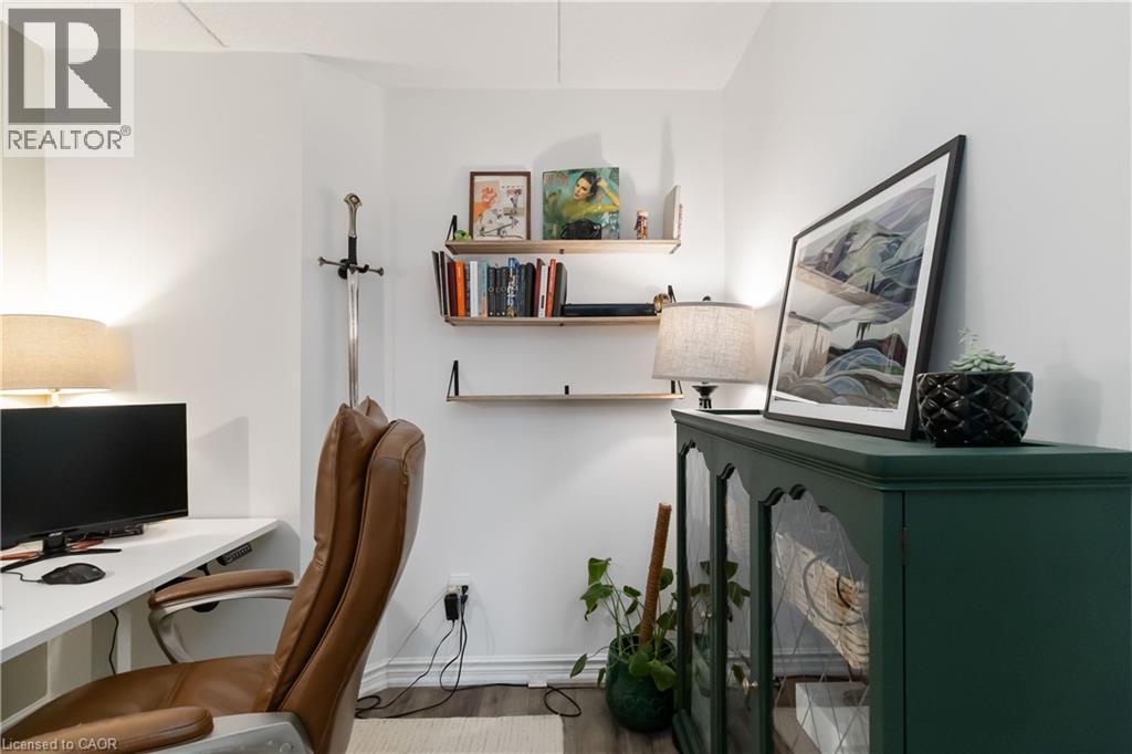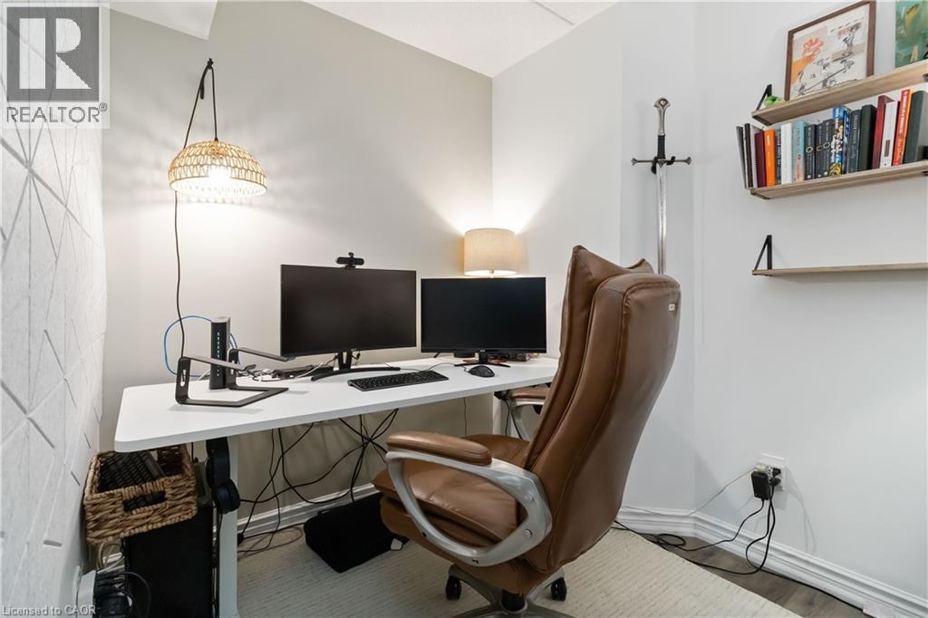 Welcome home to this beautifully appointed open-concept 1 bedroom plus den condo, privately nestled in the sought-after Headon Forest community of Burlington. Surrounded by mature trees and tranquil greenery, this bright and inviting one-bedroom plus den residence offers an exceptional blend of style, comfort, and convenience. Designed with modern living in mind, the spacious open-concept layout creates seamless flow between the kitchen, dining, and living areas ideal for both everyday living and entertaining. The peninsula-style kitchen serves as the heart of the home, offering generous counter space, additional seating, and a natural gathering place for casual meals or hosting guests. The sun-filled living area extends to a private covered balcony, providing a peaceful outdoor retreat to enjoy your morning coffee or unwind at the end of the day. The well-proportioned primary bedroom is complemented by a versatile den, perfect for a home office, guest space, or reading nook. A four-piece bath and convenient in-suite laundry enhance everyday functionality. Ideally located close to shopping, restaurants, parks, and everyday amenities, this residence offers refined condo living in one of Burlington’s most desirable neighbourhoods. (id:4555)