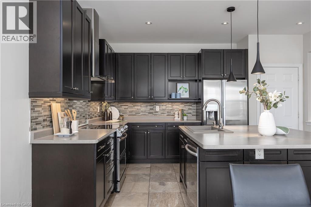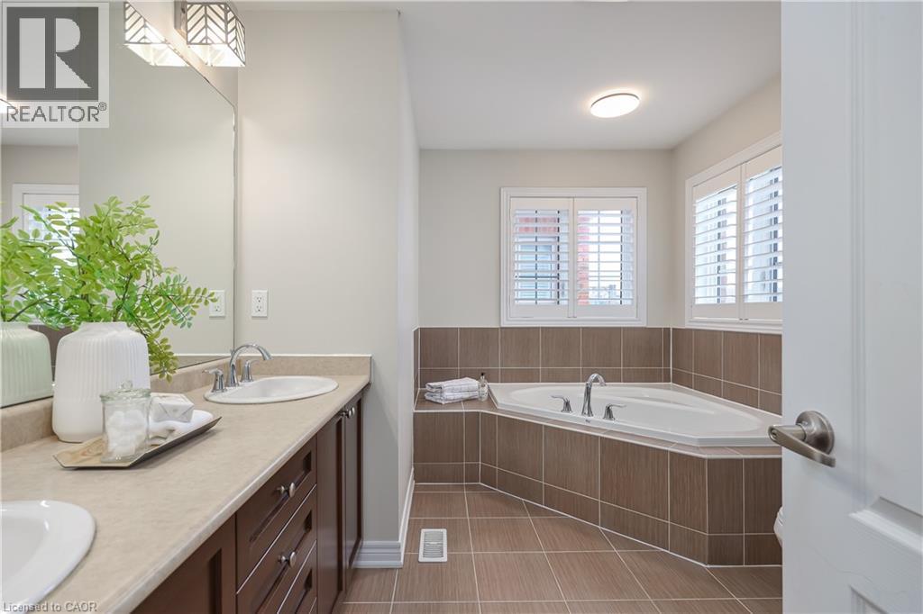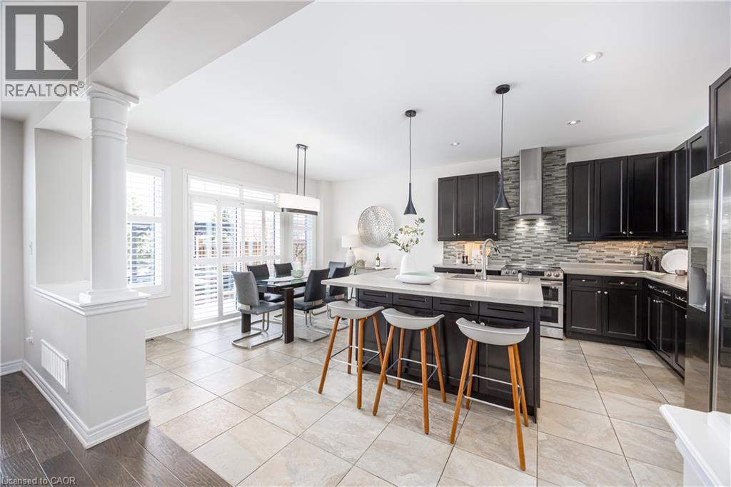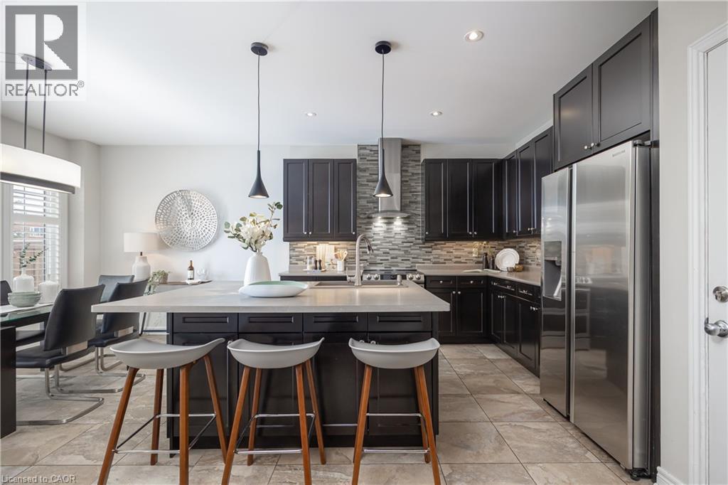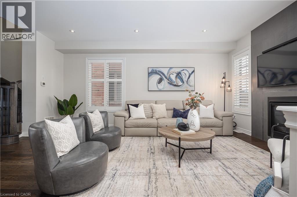 Nestled on a quiet and private street in sought-after Alton Village, this beautiful Fernbrook built home showcases the “Cornerstone” model, offering a beautifully designed layout that seamlessly blends comfort, style, and functionality. A double-door entry welcomes you into the open-concept main level, where 9-foot ceilings, hand-scraped hardwood flooring, pot lighting, and a gas fireplace with a custom feature wall that creates a warm and sophisticated ambience. The oak staircase with wrought-iron spindles adds an architectural element to the space. At the heart of the home is the chef-inspired kitchen, thoughtfully designed for both everyday living and entertaining. It features stainless steel appliances, upgraded cabinetry with ample storage, under-cabinet lighting, a stylish glass tile backsplash, and an impressive 5 ft x 6 ft oversized island—perfect for gathering with family and friends. The second level offers three spacious bedrooms and a bright, expansive family room that can easily be converted into a fourth bedroom if desired. The primary suite complete with a walk-in closet and a 5-piece ensuite featuring a glass shower and a relaxing soaker tub. Two additional generously sized bedrooms share a 4-piece bath, while the convenient upper-level laundry room adds everyday practicality. The basement features a 3-piece rough-in, cold room, and approximately 985 sq. ft. of additional space ready to be customized to suit your lifestyle. Step outside to your private, fully fenced backyard featuring a pergola and hot tub, backing directly onto a school and green space—providing both privacy and a serene setting for outdoor relaxation and entertaining. Perfectly located close to Burlington’s top-rated schools, parks, shopping, and amenities, this exceptional home offers the ideal blend of comfort and functionality. A must-see opportunity in one of Burlington’s most desirable communities. (id:4555)