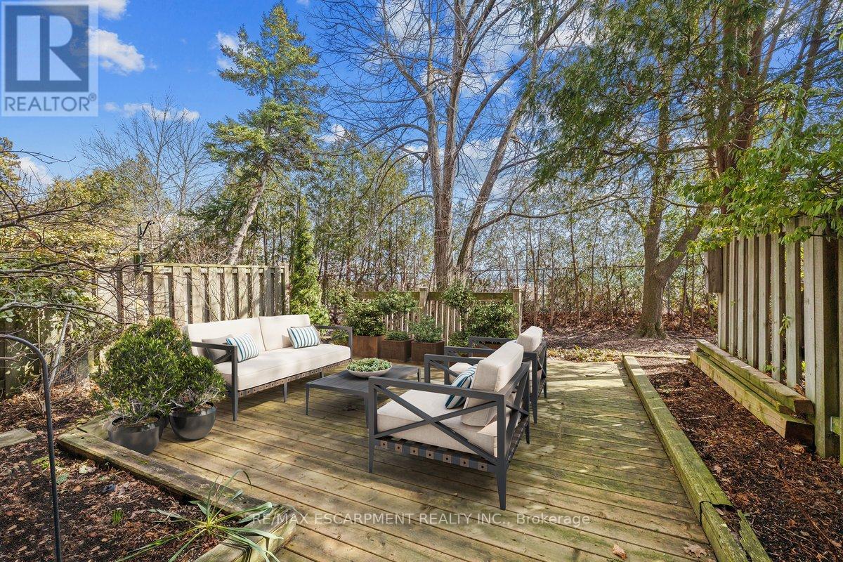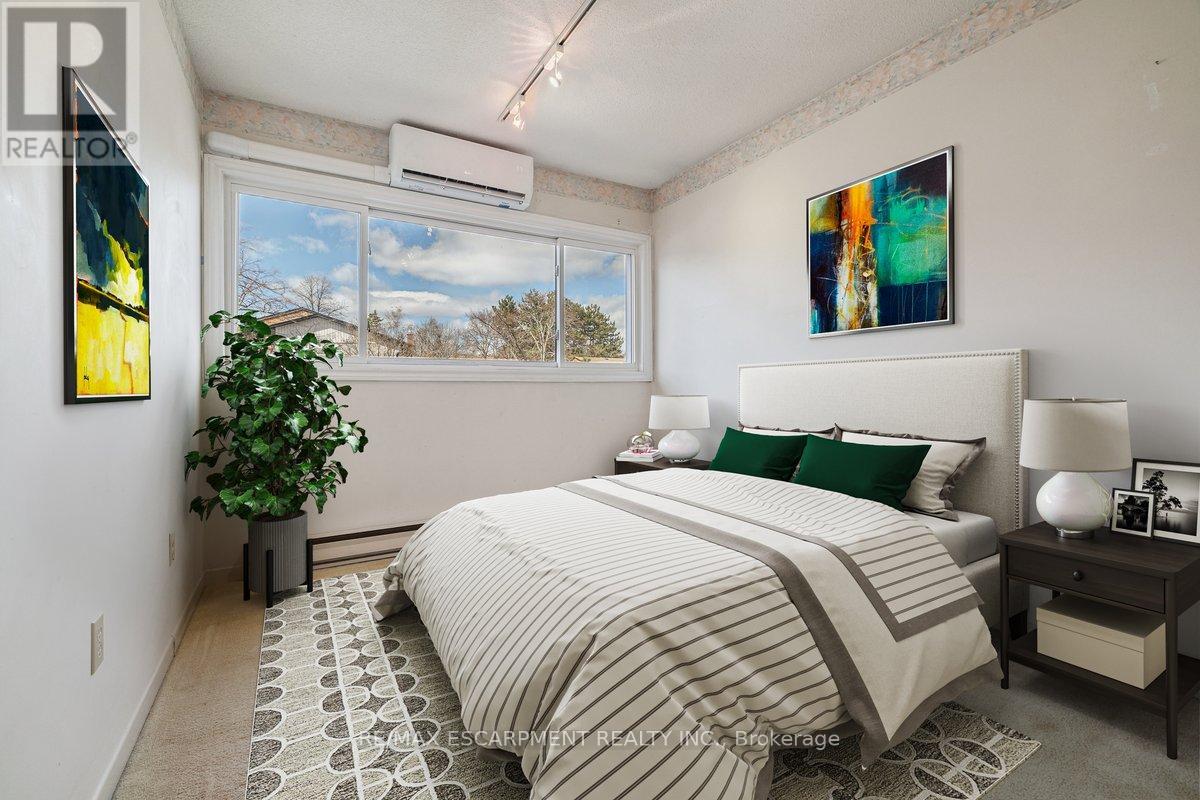Welcome to beautiful Tyandaga, and the sought after Tyandaga Mews townhome complex. This well featured home boasts a brand new (Feb 2026) energy efficient heat pump, providing central heating and cooling for the main floor and upstairs bedrooms, with supplementary baseboard and fireplace heating if needed. Dine in the newly decorated dining room, where an abundance of natural light streams in through the extra large window. The large freshly painted living room with cozy fireplace is perfect for entertaining. For outdoor relaxation, there is great choice, with one balcony off of the Primary Bedroom, another balcony off of the dining room, and in the finished basement, a walk out to a welcoming patio, all overlooking the natural beauty of the well treed grounds. During those hot summer days, enjoy the outdoor pool centrally located within the complex. Great shopping and dining, community parks, and Tyandaga Golf Course are all within a five minute commute. Easy access to QEW, 403 and 407 highways. Easy visitor parking on the street. Enjoy this low maintenance lifestyle, with condo fees including lawn care, snow clearing and repairs to major exterior components of the home. (id:4555)