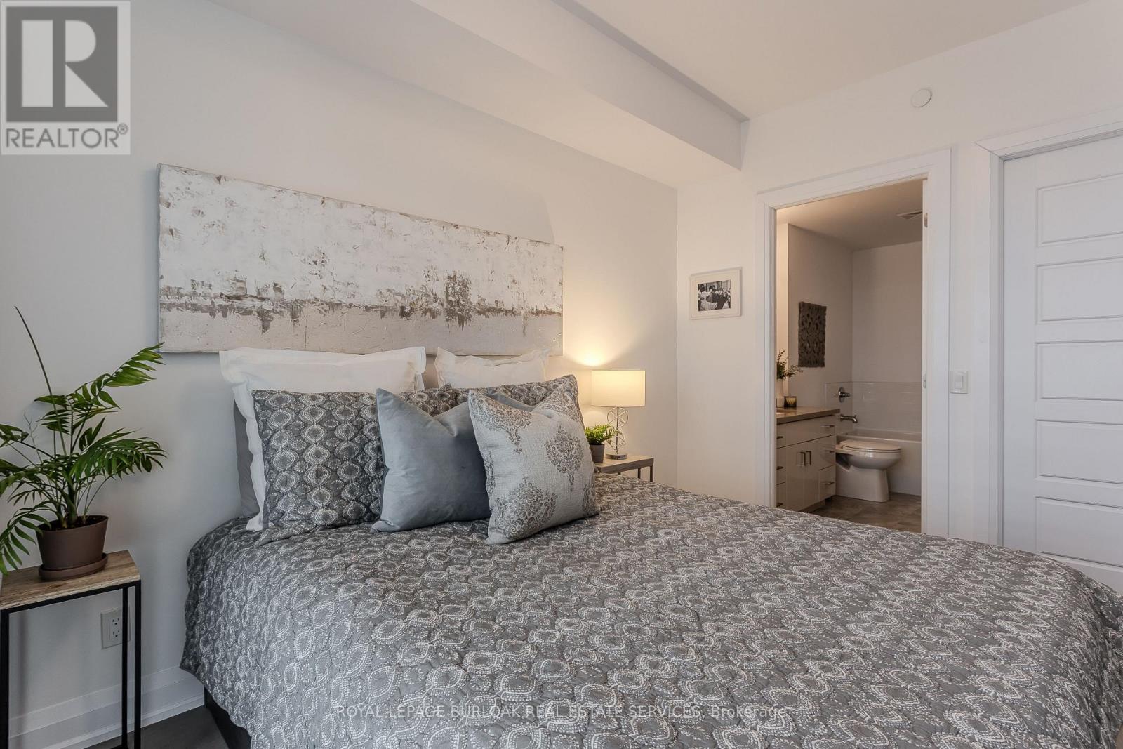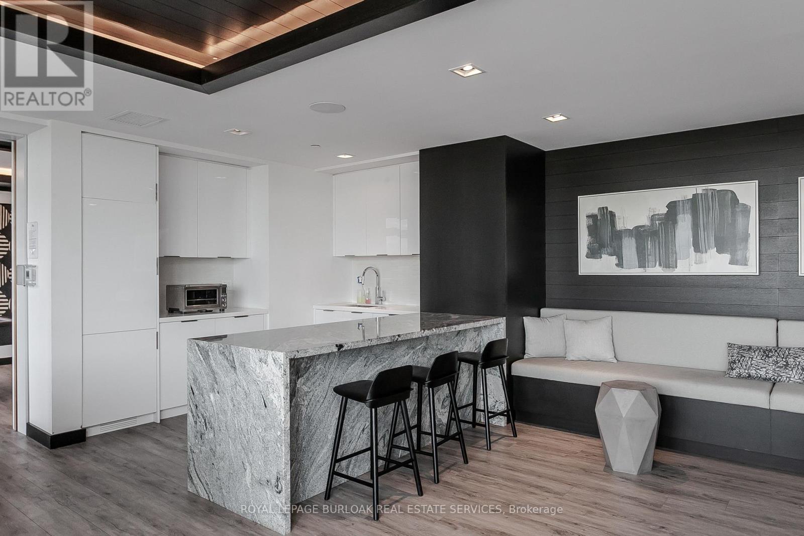 Experience elevated downtown living in one of Burlington's most sought-after residences. Set within the prestigious Berkeley Condos, this hotel-inspired suite offers a refined, low-maintenance lifestyle in the heart of the city-just steps from the waterfront, Spencer Smith Park,boutique shopping, top-rated restaurants, cafés, and vibrant year-round events. Whether it's morning walks along the lake or evenings outdowntown, this location delivers the ultimate lifestyle experience. Inside, 9' ceilings and rich hardwood flooring create a seamless, upscale feelt hroughout. The modern eat-in kitchen is designed to impress, featuring granite countertops, a tile backsplash, stainless steel appliances with range hood, and a spacious island with breakfast bar-perfect for casual dining or entertaining. The bright living room is anchored by an oversized window and walkout to a private balcony, where you can unwind with beautiful lake views as your backdrop. The primary bedroom offers a peaceful retreat, complete with a 4-piece ensuite featuring a walk-in glass shower and separate tub. An additional bedroom/ Den with stylish barn doors provides an ideal space for guests or a home office, complemented by a sleek 3-piece main bath with walk-in shower. This unit also includes one parking space, a super-sized locker conveniently located next to the parking space, plus an additional locker on the same floor-offering exceptional storage rarely found in condo living. Residents of this upscale building enjoy access to premium amenities including a 24-hourconcierge, fully equipped fitness centre, elegant party and games room, guest suites for overnight visitors, and a stunning rooftop terrace with breathtaking panoramic views of the lake and city skyline. An exceptional opportunity for professionals, downsizers, or anyone seeking a sophisticated, walkable lifestyle in one of Burlington's most vibrant and connected (id:4555)