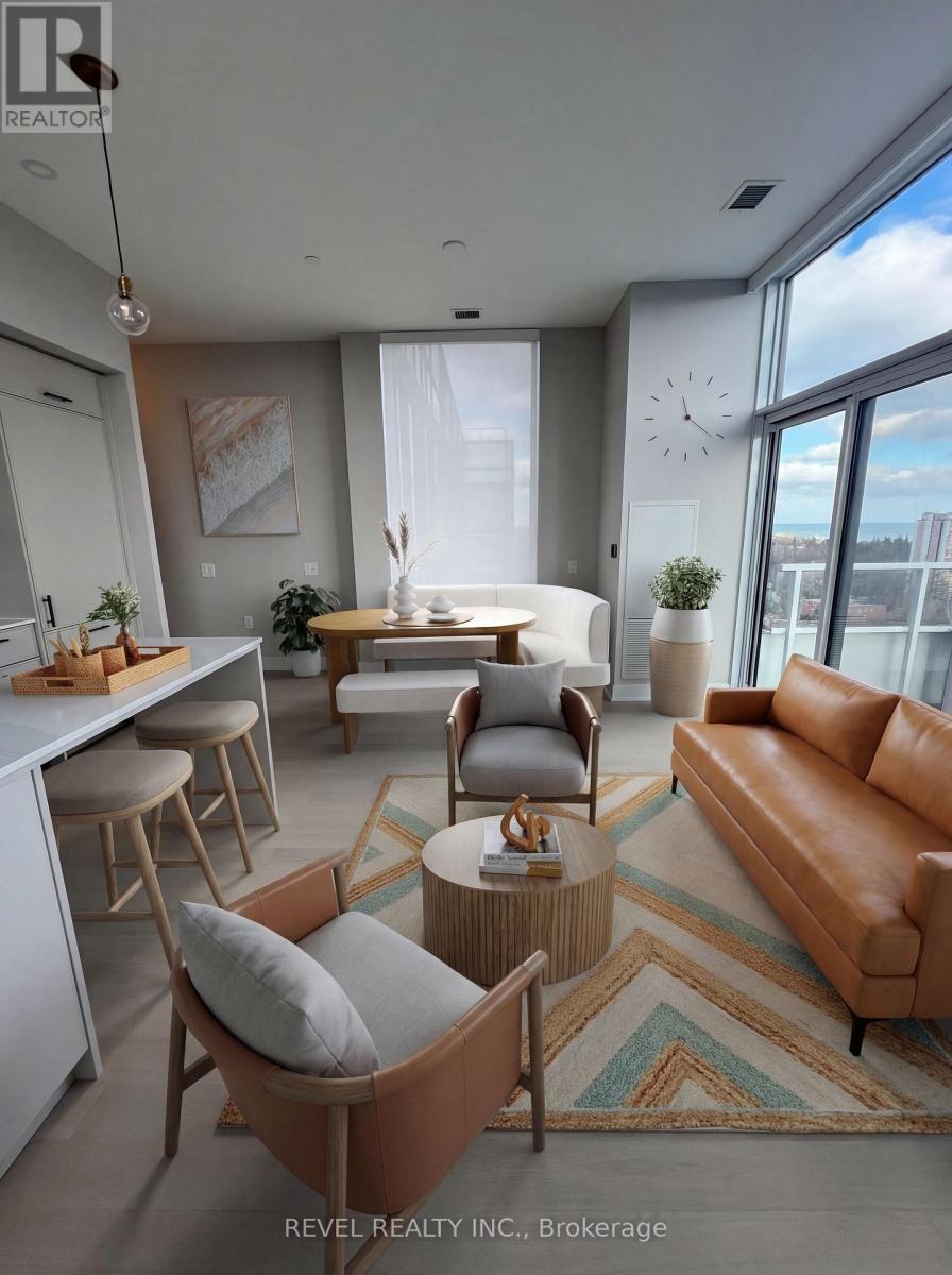 Welcome to elevated living in the heart of downtown Burlington. This brand-new, stunning boutique building offers a rare opportunity to lease a sophisticated corner suite spanning nearly 1,000 square feet. Thoughtfully designed, this 2-bedroom plus den, 2-bathroom home features stunning south exposures with beautiful views of Lake Ontario. Expansive 10-foot ceilings flood the space with natural light, highlighting the open-concept layout. The designer kitchen is outfitted with professional-grade appliances and premium finishes, perfect for both everyday living and entertaining. Window coverings include high-end remote-controlled roller shades, upscale upgrades throughout, and a balcony with a million-dollar view of Lake Ontario. This property includes one parking space with an electric vehicle charger and one locker. Residents enjoy access to exceptional amenities, including a fitness centre, lounge/party room, dog washing station, an outstanding rooftop terrace equipped with BBQs, and more. Ideally located just steps to the waterfront, dining, shopping, and all that downtown Burlington has to offer. This is a rare lease opportunity combining luxury, lifestyle, and convenience. PLEASE NOTE: pictures have been virtually staged and are a combination of unit 1108 and 1308, which have identical layouts (1308 has higher ceilings and 1108 has floor-to-ceiling windows). (id:4555)