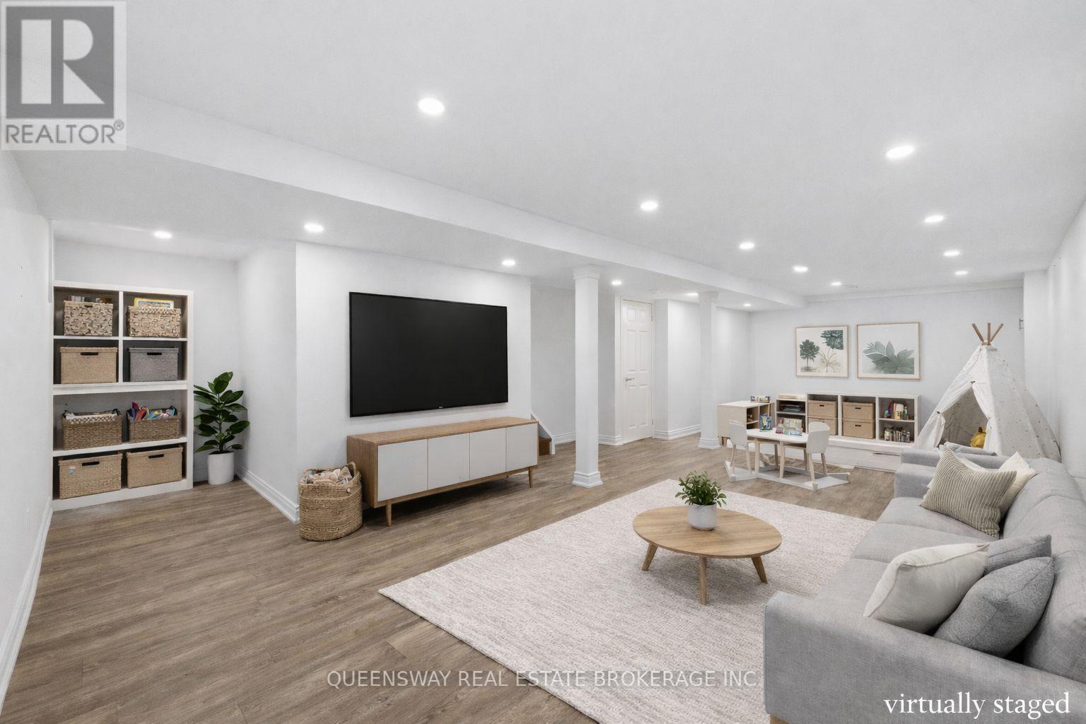 Located in Burlington's desirable Shoreacres lakefront community, this beautifully renovated end-unit townhome offers a great mix of space, privacy, and convenience. Surrounded by mature trees, it feels more like a semi-detached home and is ideal for families or tenants looking to live in a quiet, established neighbourhood .Fully renovated in 2021, the home features a bright, open-concept layout designed for comfortable everyday living. Enter through custom double doors into a spacious entryway. The kitchen includes quartz countertops, stainless steel appliances, and a large island with seating for four. The home offers three bedrooms, three bathrooms, plenty of storage, and a carpet-free layout for easy maintenance. Additional features include pot lights on the main floor and basement, quartz counters in all bathrooms, and blackout zebra blinds throughout. The fully finished basement provides extra living space-perfect for a family room, home office, or play area. Enjoy a private, enclosed backyard, along with the added convenience of three parking spaces .Located just steps to Nelson Park, Iroquois Park, Paletta Lakefront Park, and the Centennial Bike Trail, as well as top-rated schools in the Nelson district. Easy access to Highway 401 and nearby amenities. (id:4555)