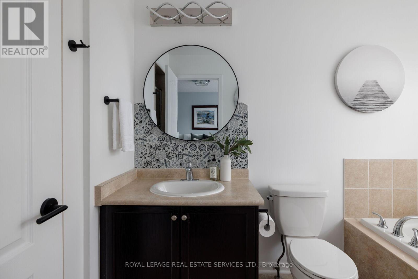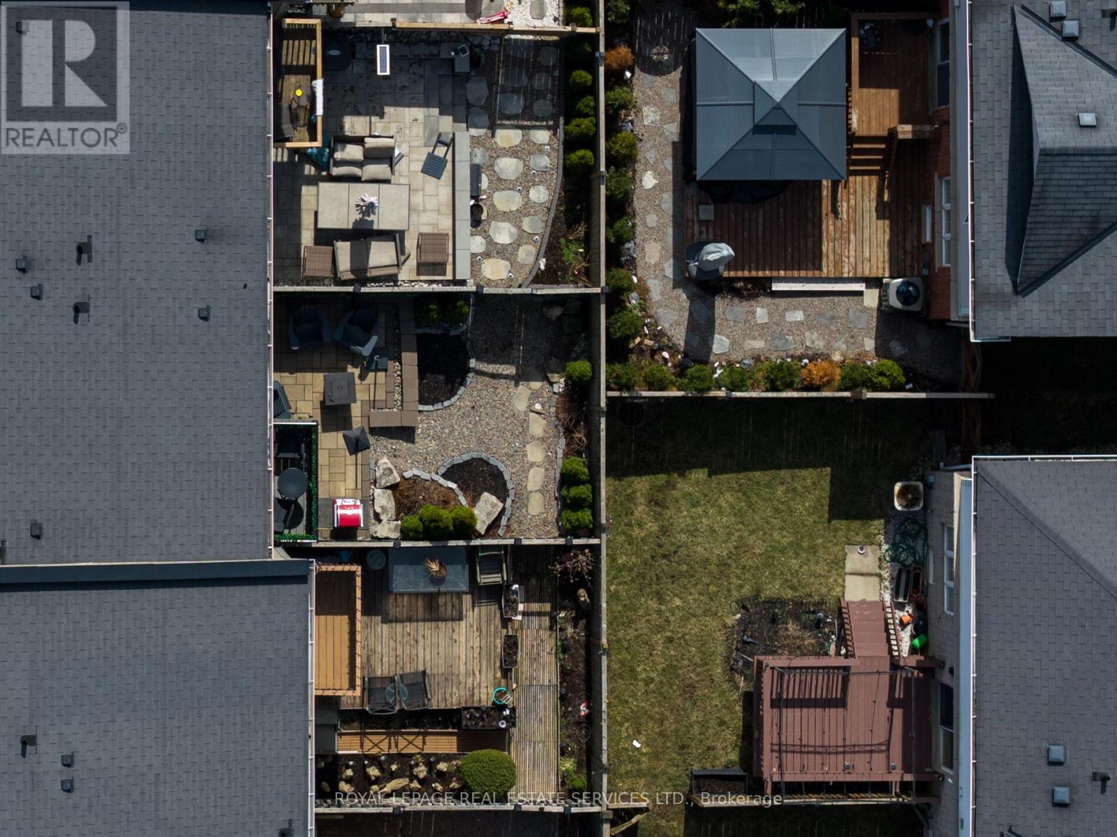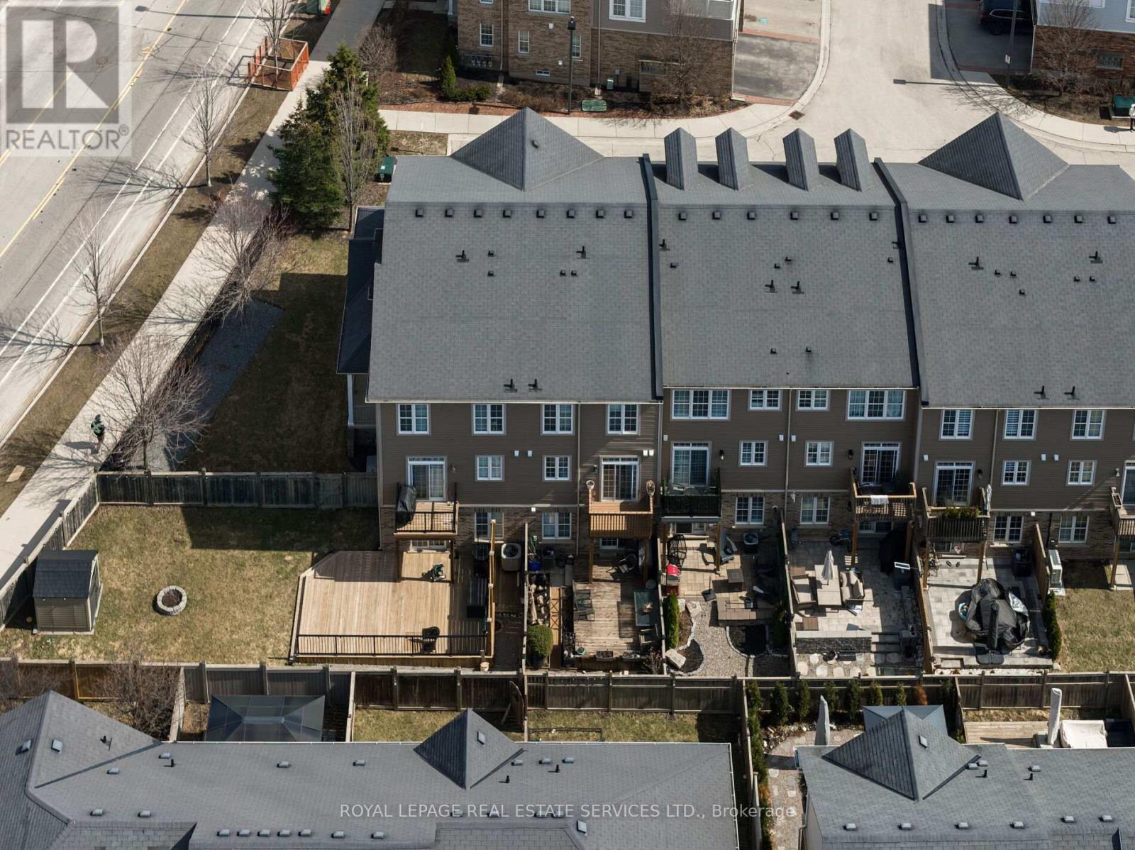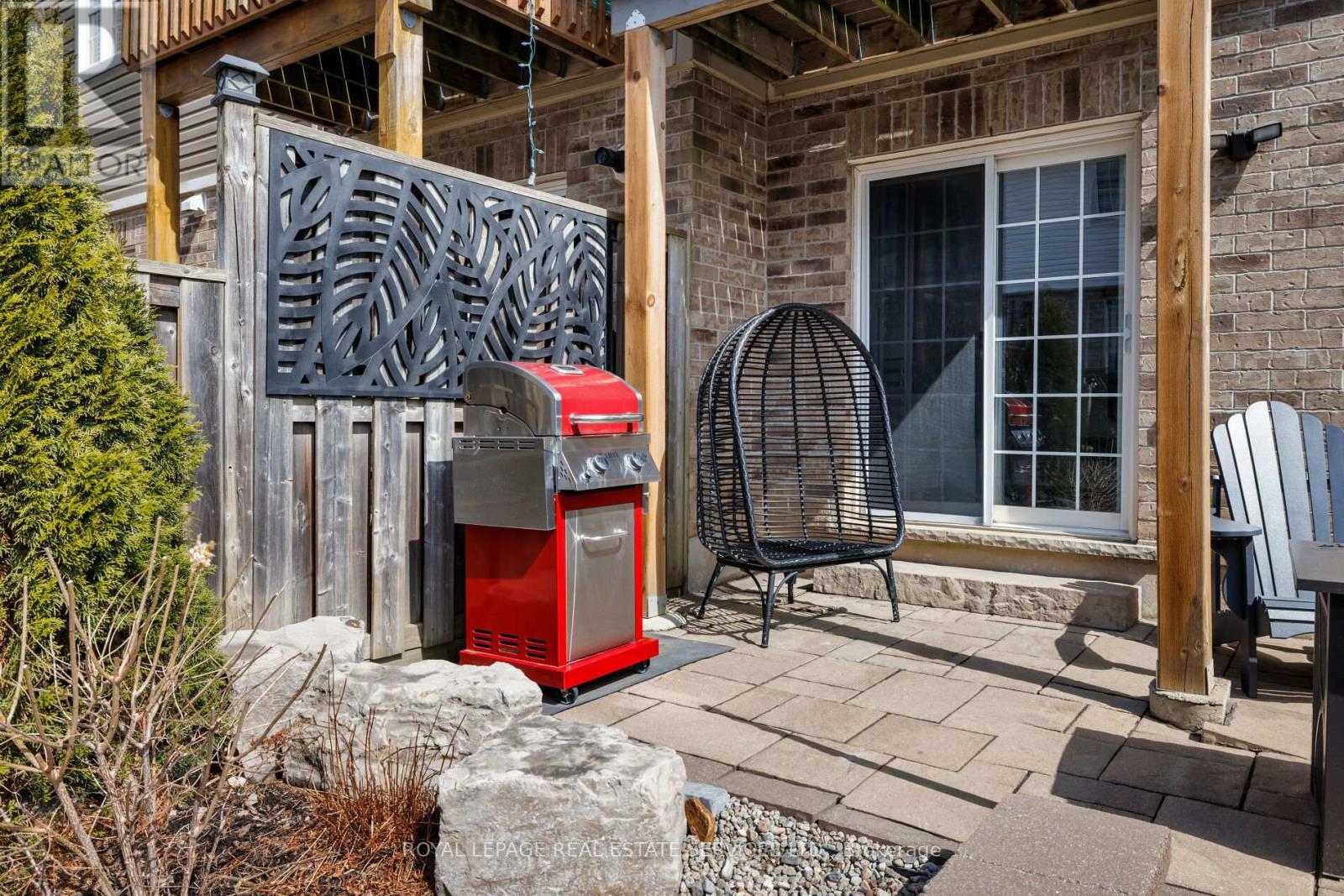 Impeccably upgraded and move-in ready, this stylish 3-bedroom townhome offers a refined blend of contemporary design and everyday comfort in the heart of Burlington's sought-after Alton Village. Perfectly suited for families, the home is just a short stroll to top-rated schools and close to shopping, restaurants, and highways. Expansive windows with California shutters bathe the interior in natural light, complementing high ceilings and modern pot lighting, creating an inviting, open, and spacious ambiance throughout. The thoughtfully designed layout features a walkout ground level leading to a private, fully fenced, low-maintenance backyard with a Zen-like feel and a large stone terrace-ideal for relaxing or entertaining. At the heart of the home, the beautifully refreshed eat-in kitchen (2021) showcases new quartz countertops, a contemporary backsplash, updated sink and stove, and a water line for the fridge, and a breakfast area with direct access to a newly upgraded balcony (2024) finished with composite decking and aluminum railings. The generous living and dining room features hardwood flooring, numerous pot lights, a feature wall, and a linear fireplace, perfect for entertaining in style. Quality upgrades and enhancements include an electric fireplace in the family room, and professional landscaping front and back (2024), professionally painted and updated lighting and door hardware throughout (2022), luxury vinyl plank flooring on the ground level, and renovated main bathroom (2021), and hardwood added upstairs. A true turnkey opportunity offering style, function, and an exceptional lifestyle. Fabulous home! (id:4555)