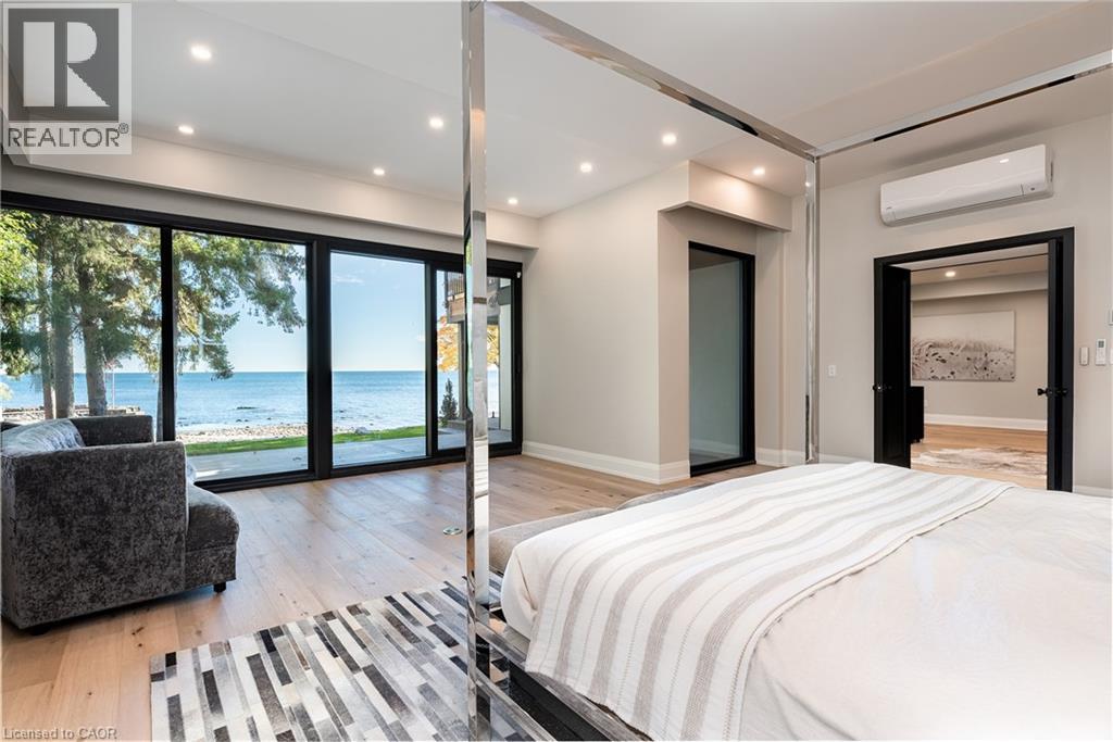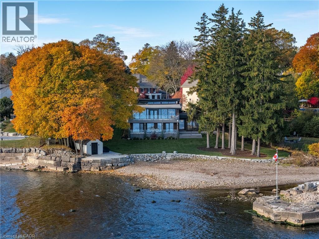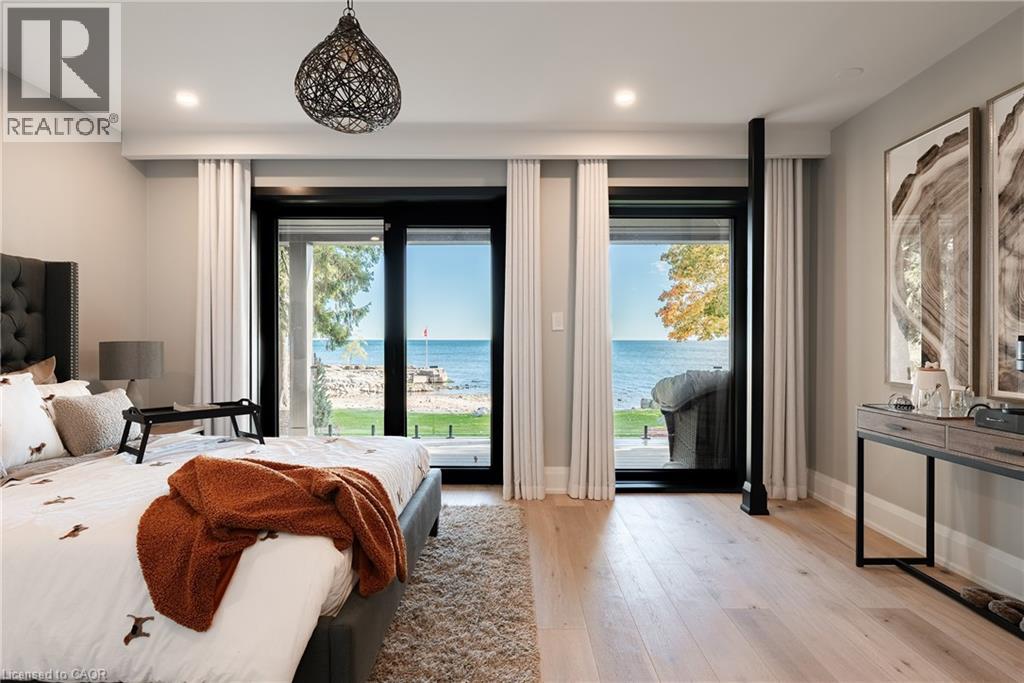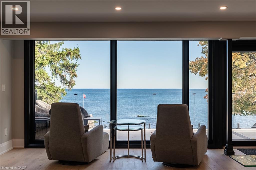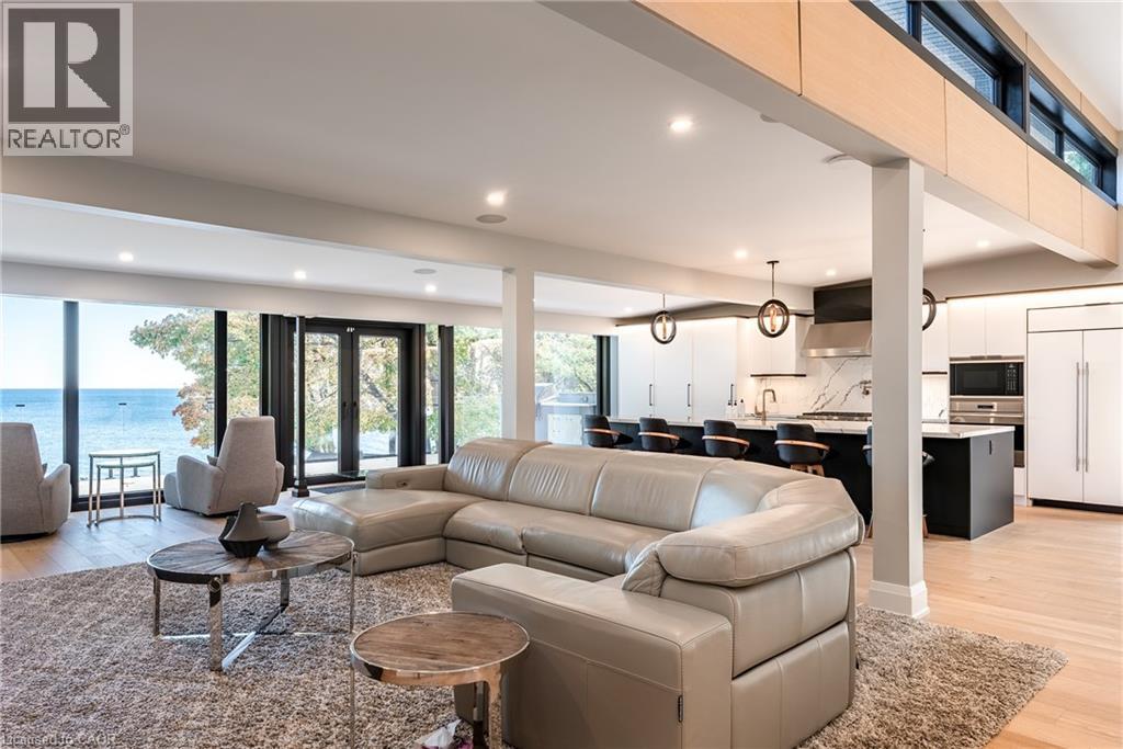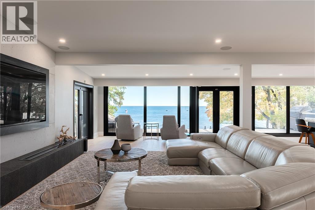 Natural serenity meets modern design at 121 Edgecliffe Place. Set on a rare 29,000 sq. ft. pie-shaped lakefront lot where Appleby Creek meets Lake Ontario, this exceptional property offers 105 feet of direct waterfront and 130 feet along the creek with riparian rights, creating an irreplaceable natural setting in the city. This fully renovated home offers over 5,200 sq. ft. of finished living space with floor-to-ceiling windows that draw the lake and landscape into every room. The open-concept main level features 12-foot peaked ceilings, engineered light hardwood, and dark-framed windows that frame panoramic southern views. A chef’s kitchen anchors the space with a large island and top-tier appliances, ideal for entertaining. The walkout lower level accommodates four bedrooms, each with its own ensuite and ductless air conditioning unit. The primary suite opens directly to the lakeside deck, featuring a spa-inspired ensuite with dual rain showers and a massive walk-in closet with custom cabinetry. Radiant in-floor heating extends throughout the home for year-round comfort. Multiple outdoor living spaces blur the line between indoors and out. A covered lower deck and expansive upper terrace with built-in BBQ maximize lakefront enjoyment and capture the home’s stunning setting. Modern. Peaceful. One of a kind on the water. (id:4555)