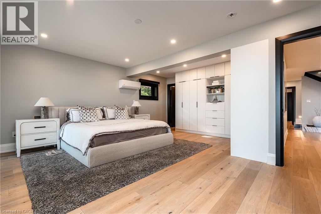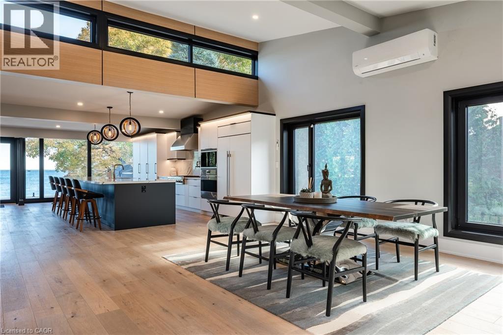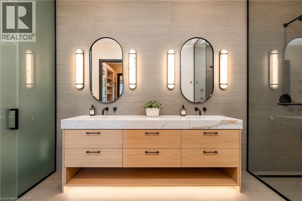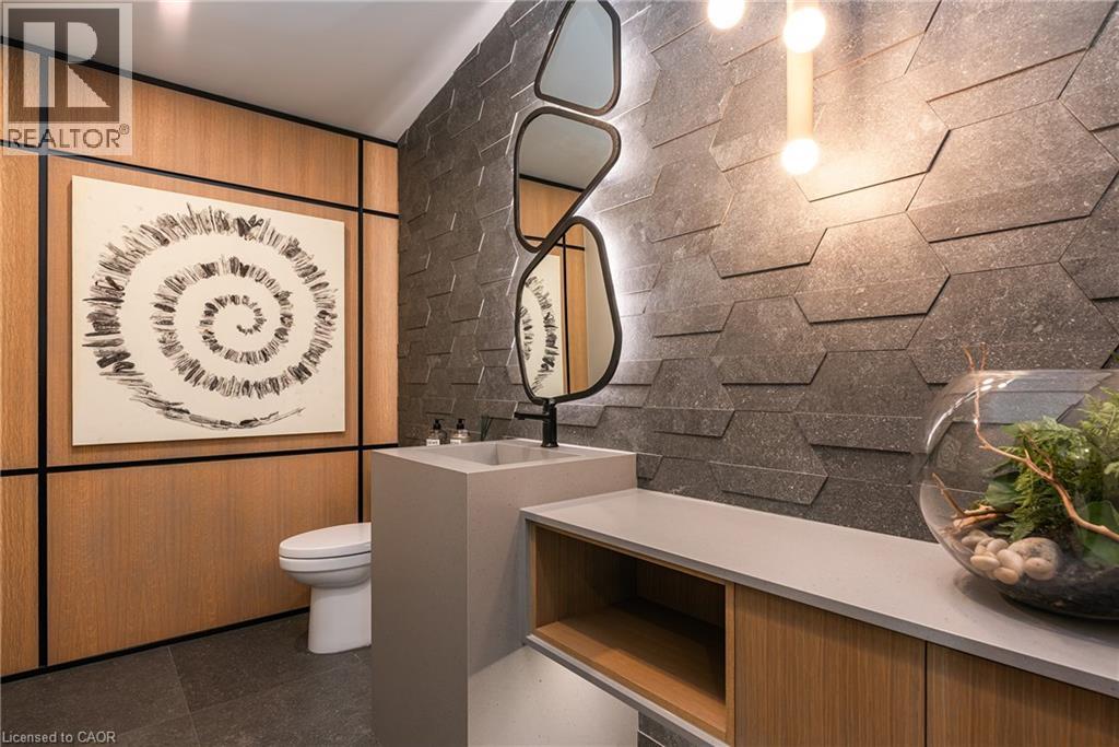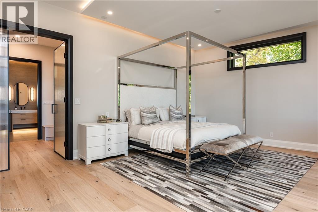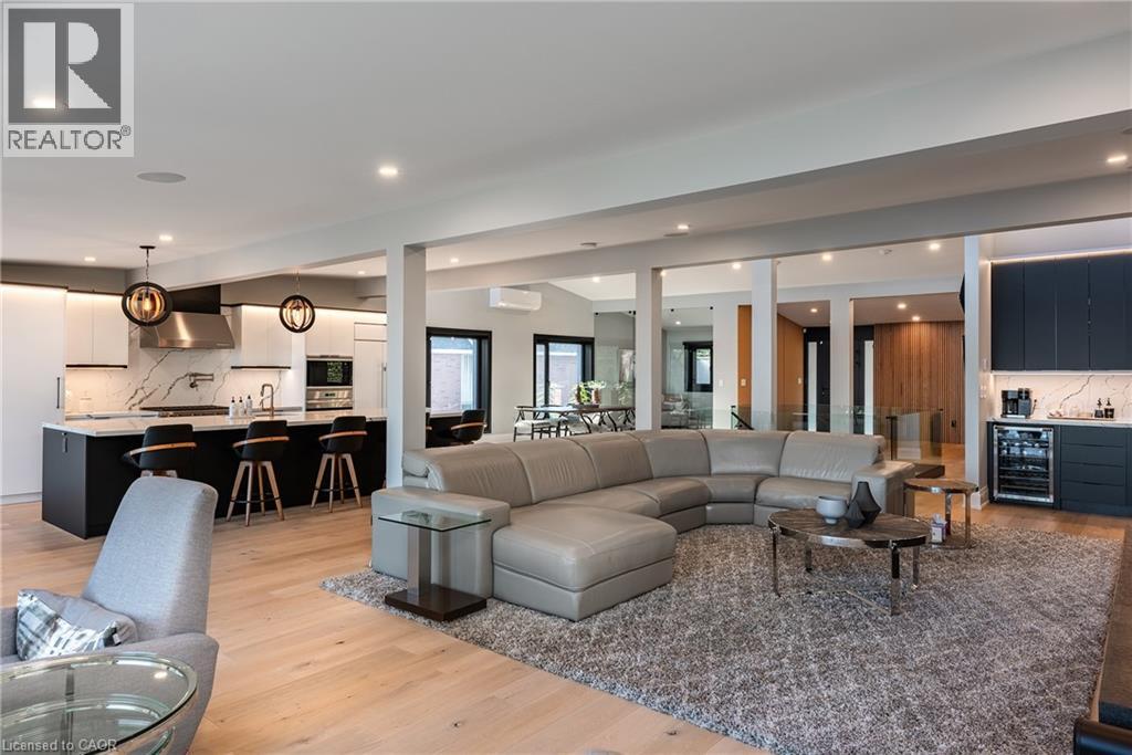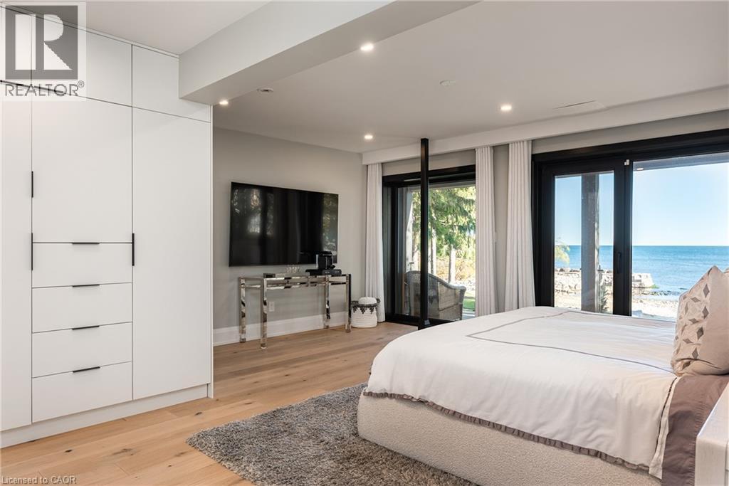 Natural serenity meets modern design at 121 Edgecliffe Place. Set on a rare 29,000 sq. ft. pie-shaped lakefront lot where Appleby Creek meets Lake Ontario, this exceptional property offers 105 feet of direct waterfront and 130 feet along the creek with riparian rights, creating an irreplaceable natural setting in the city. This fully renovated home offers over 5,200 sq. ft. of finished living space with floor-to-ceiling windows that draw the lake and landscape into every room. The open-concept main level features 12-foot peaked ceilings, engineered light hardwood, and dark-framed windows that frame panoramic southern views. A chef’s kitchen anchors the space with a large island and top-tier appliances, ideal for entertaining. The walkout lower level accommodates four bedrooms, each with its own ensuite and ductless air conditioning unit. The primary suite opens directly to the lakeside deck, featuring a spa-inspired ensuite with dual rain showers and a massive walk-in closet with custom cabinetry. Radiant in-floor heating extends throughout the home for year-round comfort. Multiple outdoor living spaces blur the line between indoors and out. A covered lower deck and expansive upper terrace with built-in BBQ maximize lakefront enjoyment and capture the home’s stunning setting. Modern. Peaceful. One of a kind on the water. (id:4555)