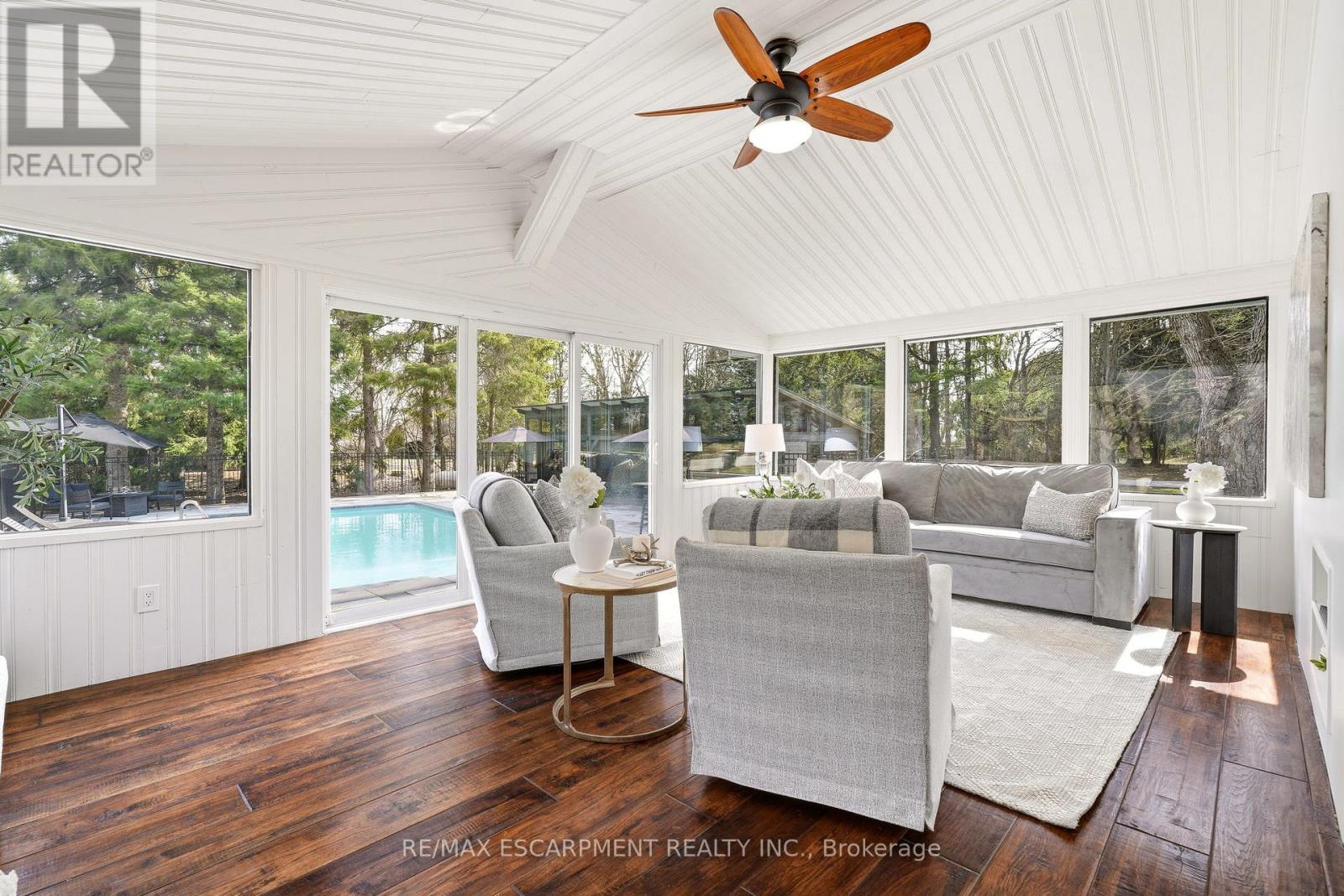 Experience country living at its absolute finest, perfectly situated just minutes from the City limits. Nestled on a picturesque 1.15-acre property, this home captures breathtaking views of both the City skyline and the escarpment. Inside, the spacious layout includes a gourmet kitchen with solid cherry wood and granite, open to a cozy family room and an elegant dining area with a fireplace. The main-level primary suite is a true retreat. The exterior is an entertainer's dream, featuring a saltwater pool and a glass pool house with a bar. With recent exterior updates, this incredible property is close to parks, golf courses, all major highways, and all the amenities the city has to offer. Let's get you home! (id:4555)
