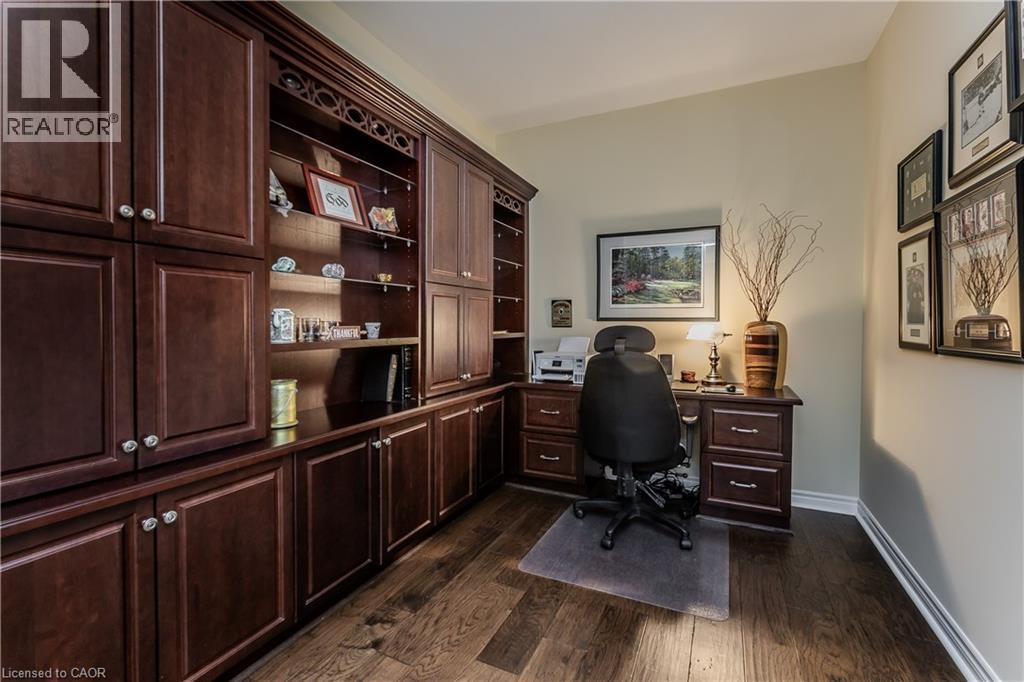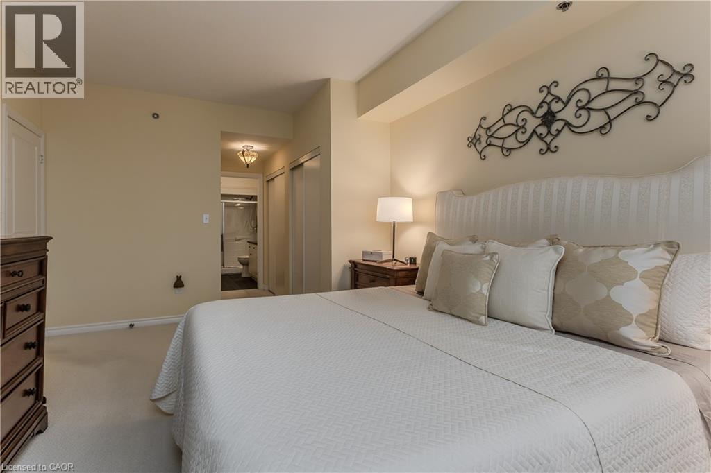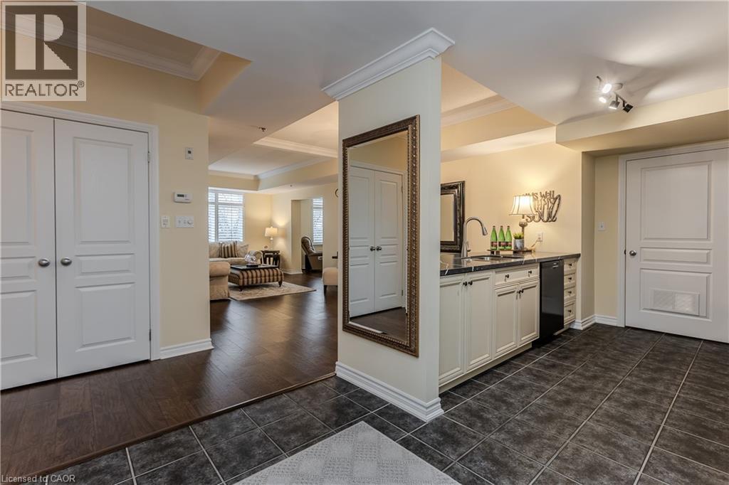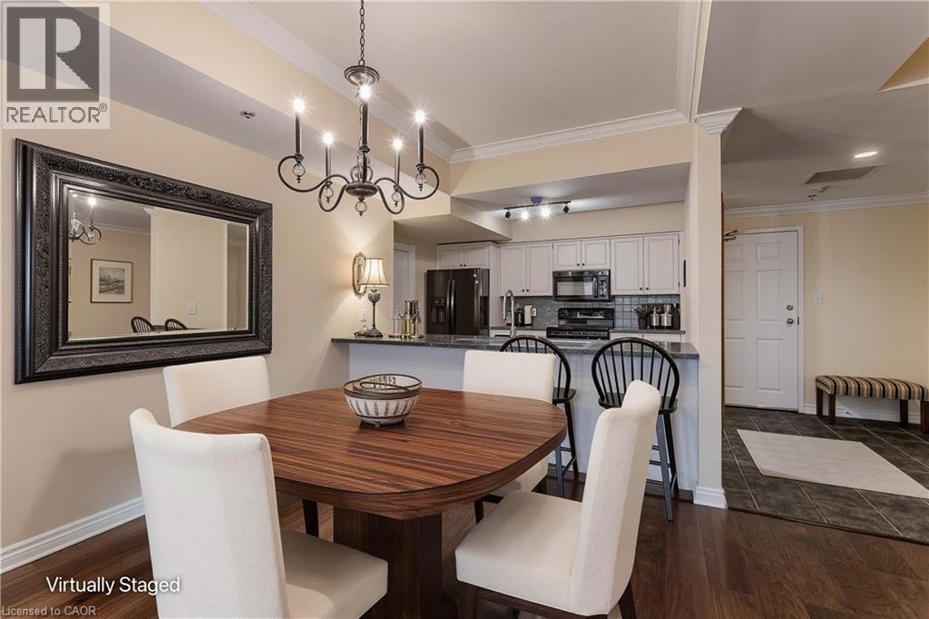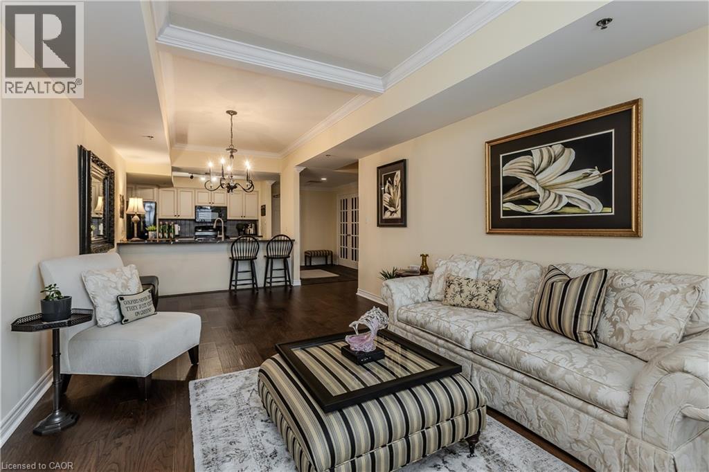 Welcome to this beautifully designed condo in The Dovercourt, a well-maintained low-rise building nestled in the sought-after Aldershot community. Offering one of the larger custom layouts in the building, this customized suite blends space, functionality, and style in a prime location—just mins to the GO Station, QEW, Royal Botanical Gardens, Burlington Golf & Country Club, and everyday amenities. Step inside to discover a bright and inviting open-concept layout, with hardwood flooring throughout the main living areas. The kitchen is a true focal point, featuring quartz countertops, an oversized breakfast bar perfect for casual dining or gathering with guests, a stylish tile backsplash, black stainless steel appliances, and ample cabinetry to meet all your storage needs. Overlooking the main living space, it connects beautifully to the dining and living areas. The spacious living room is filled with natural light and showcases a tray ceiling with a beam accent, along with walkout access to a private balcony. A versatile den offers the potential to convert into an additional bedroom, while a separate home office with French doors provides the ideal work-from-home setup. The primary bedroom is generously sized and designed as a private retreat, complete with dual closets and a well-appointed 3-piece ensuite featuring an oversized granite vanity and a walk-in shower. A second bedroom also offers direct access to the balcony, creating a bright and airy space for family or guests. A 4-piece main bathroom adds further convenience. Additional features include a storage locker and two parking spaces—one underground and one surface. Residents enjoy access to a party/media room within this well-managed building. This is a rare opportunity to own a spacious, move-in-ready condo with a flexible layout in one of Burlington’s most convenient and connected locations—perfect for professionals, downsizers, or those seeking low-maintenance living without compromising on space. (id:4555)
