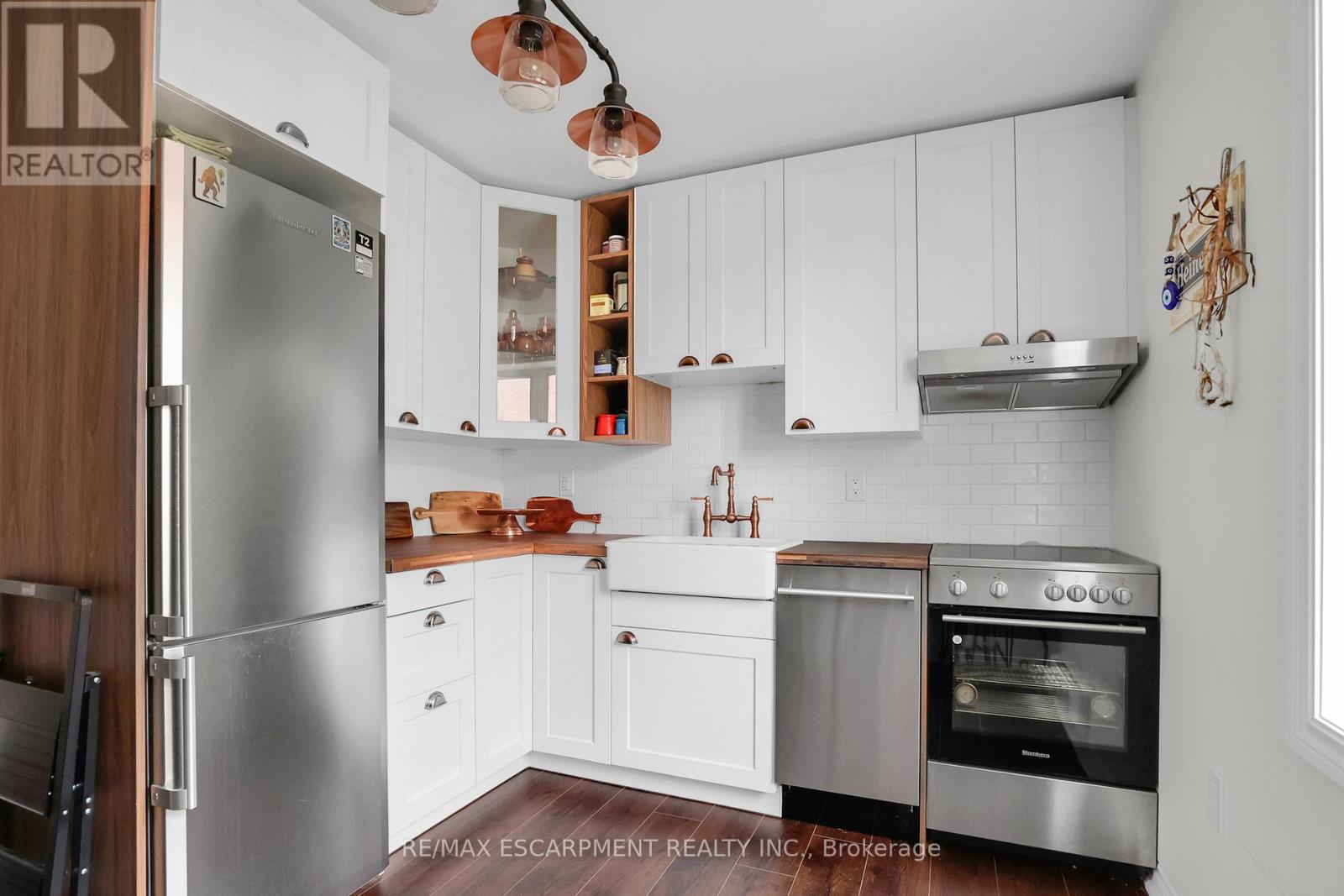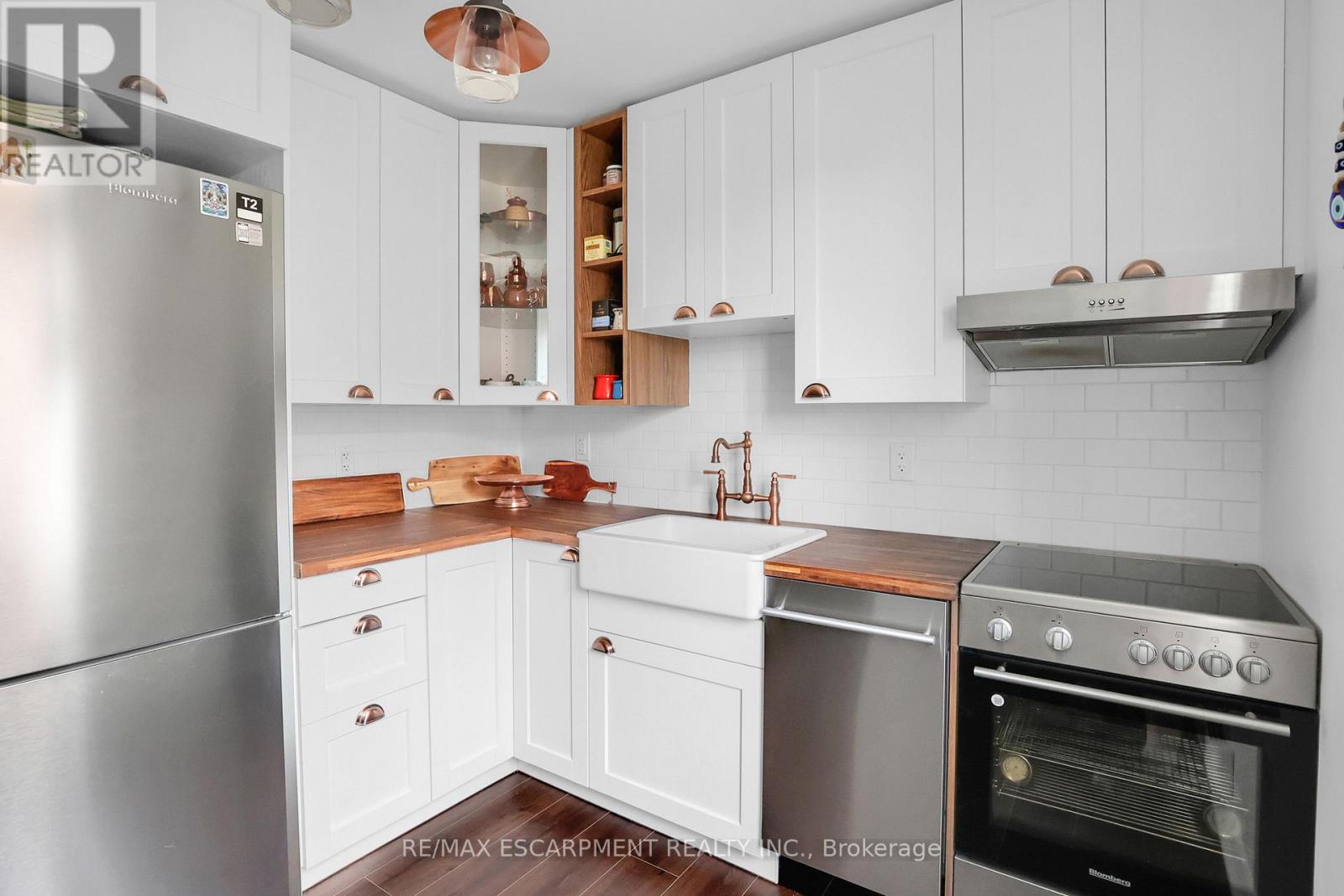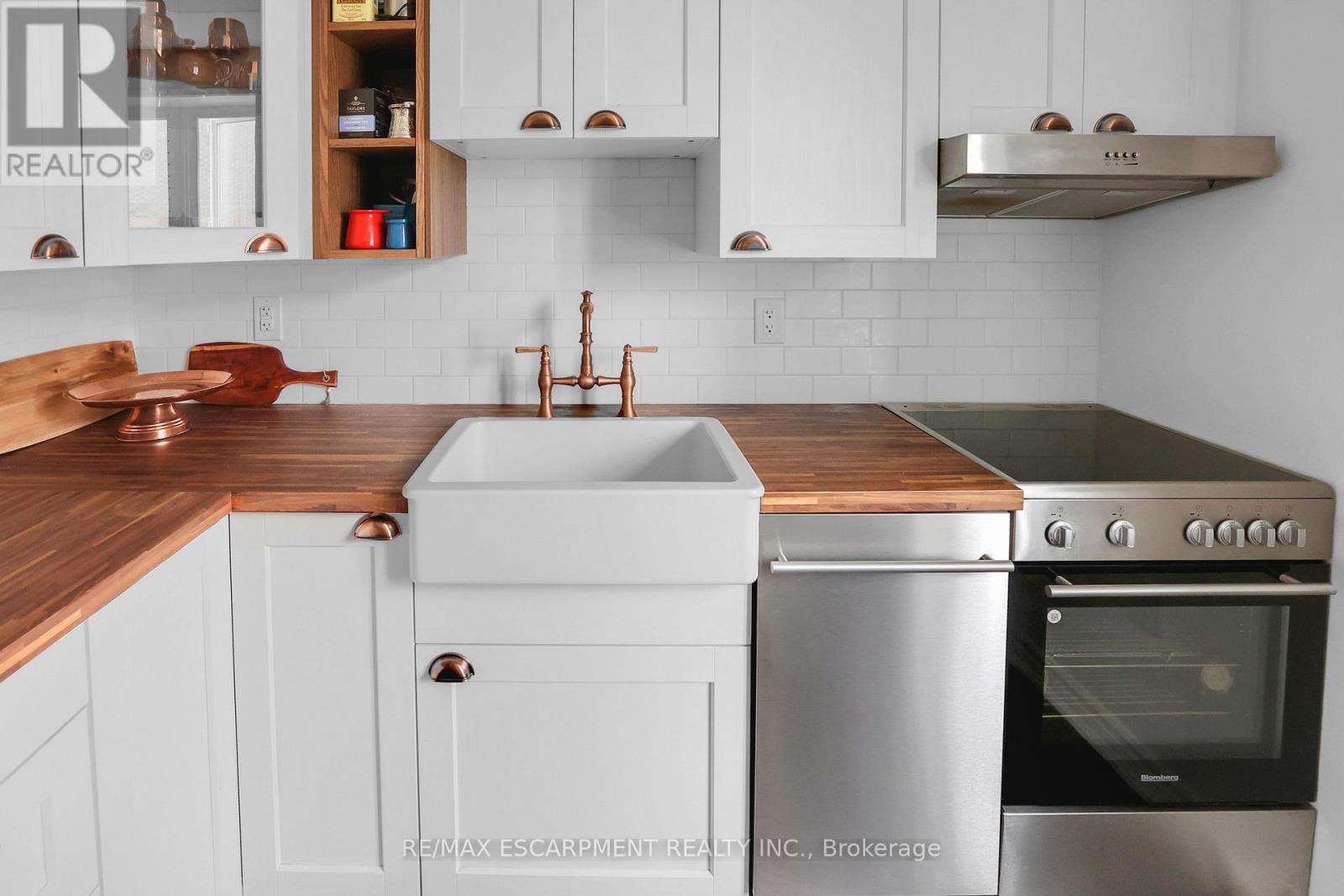 Welcome to 37-1347 Lakeshore Road, a beautiful fully renovated 2-bedroom, 1-bath co-op in the heart of downtown Burlington. Offering 832 sq ft of fully transformed space, this home blends modern function with vintage charm-just steps from Spencer Smith Park, the waterfront trail, and Lake Ontario views.Every detail has been thoughtfully upgraded, including new drywall and a full electrical overhaul for safety and modern living. New swing-out windows welcome fresh lake breezes, while dark wood-style floors add warmth throughout.The kitchen shines with burnished copper fixtures, butcher block counters, and a classic white farmhouse sink. The bathroom echoes a 1949 film noir aesthetic, fully tiled in black and white with a vintage-style sink. Refined finishes-bronze hardware, modern wainscotting, detailed trim, and a spacious French-door closet-enhance the space.Equipped with premium compact Blomberg appliances, this unit balances style and efficiency. A black fire-rated front door with Deco silver numbering completes the look, merging heritage with contemporary design.Steps to the lake, trails, dining, and with easy highway access, this is Burlington living at its best-a rare find for those who value style, quality, and location. Your lakeside lifestyle starts her. (id:4555)