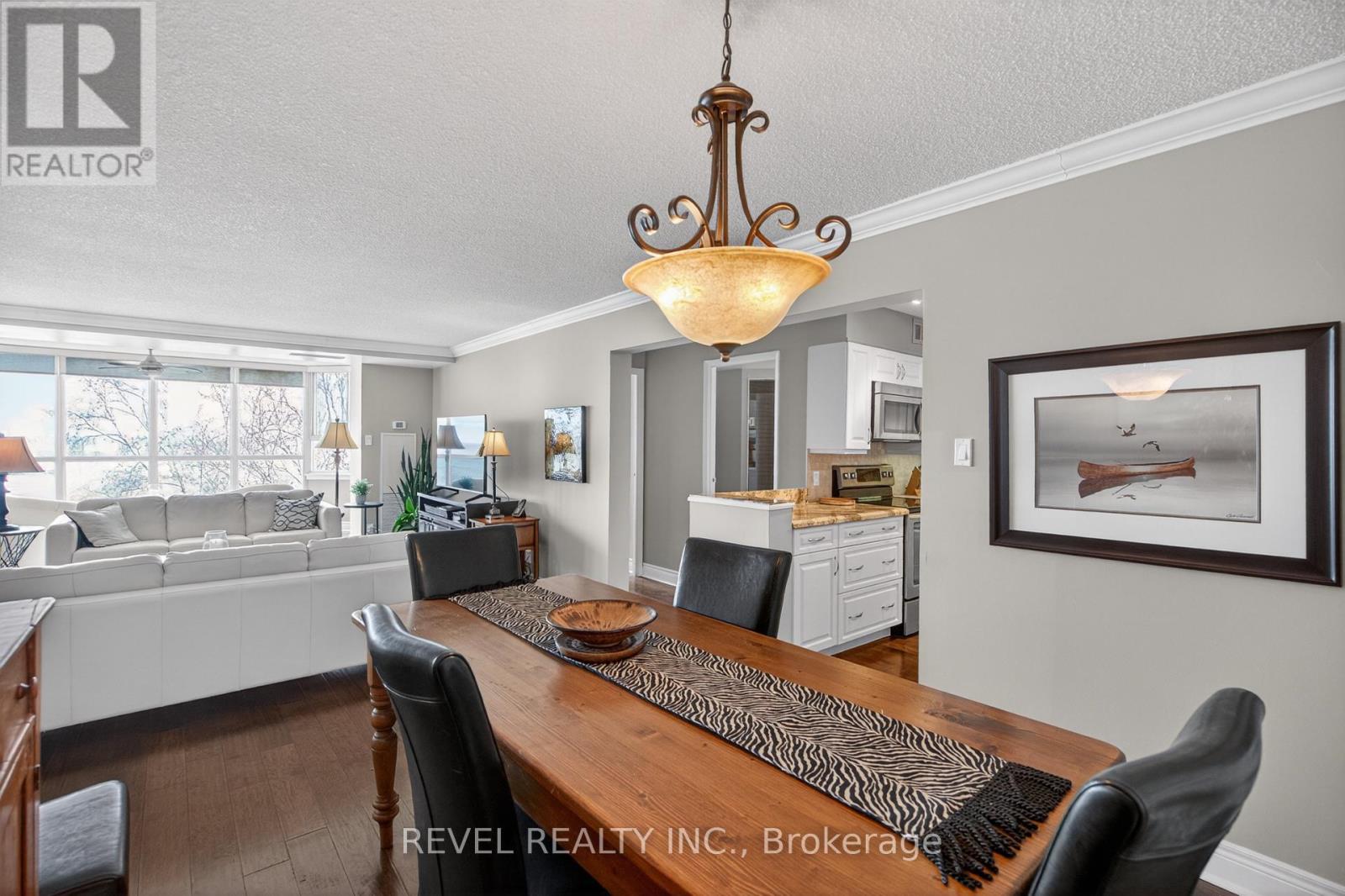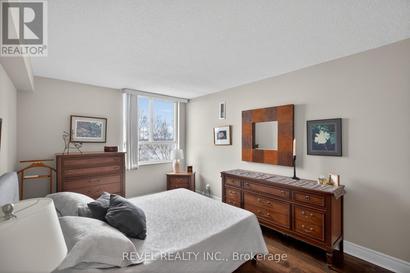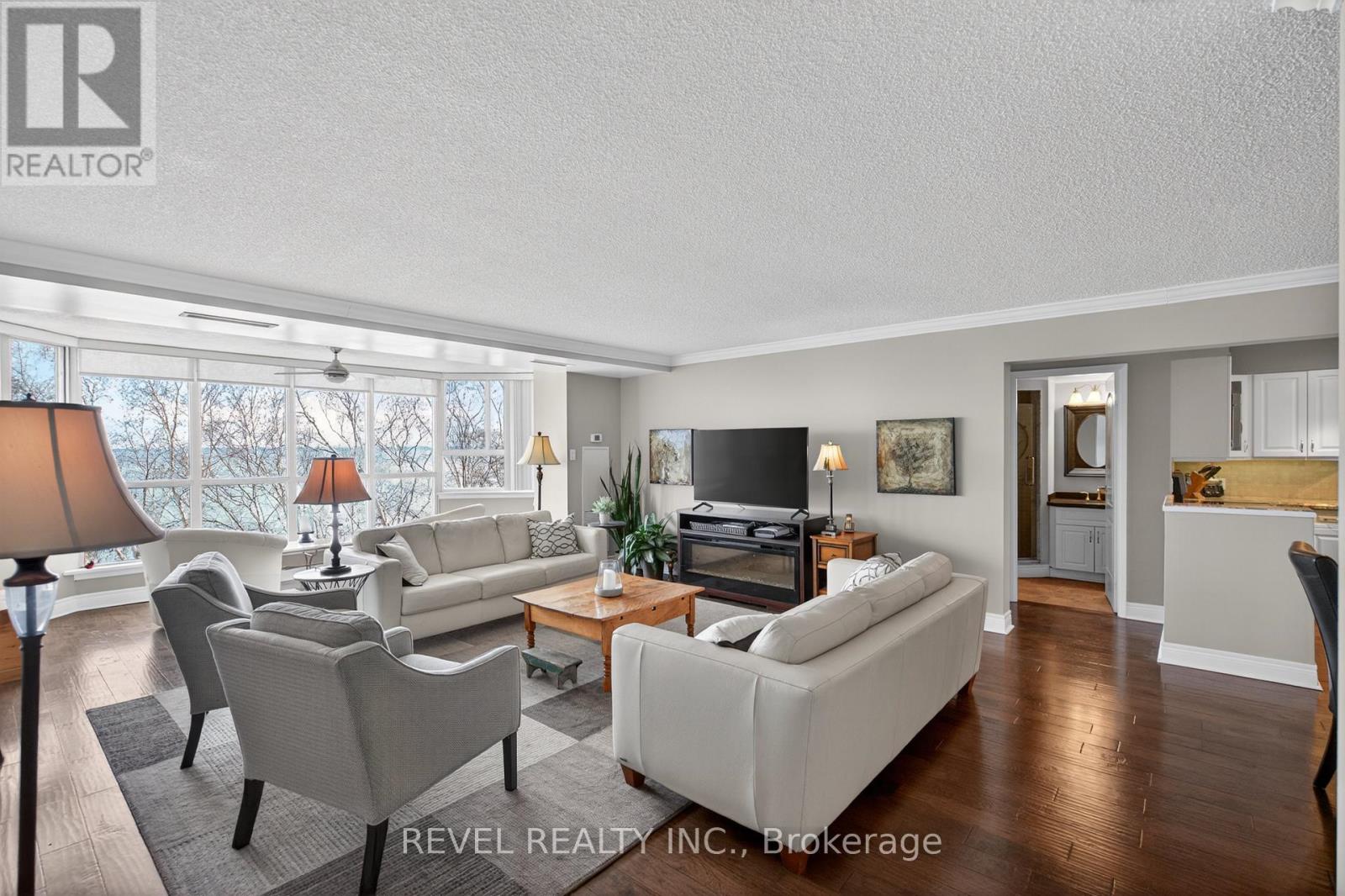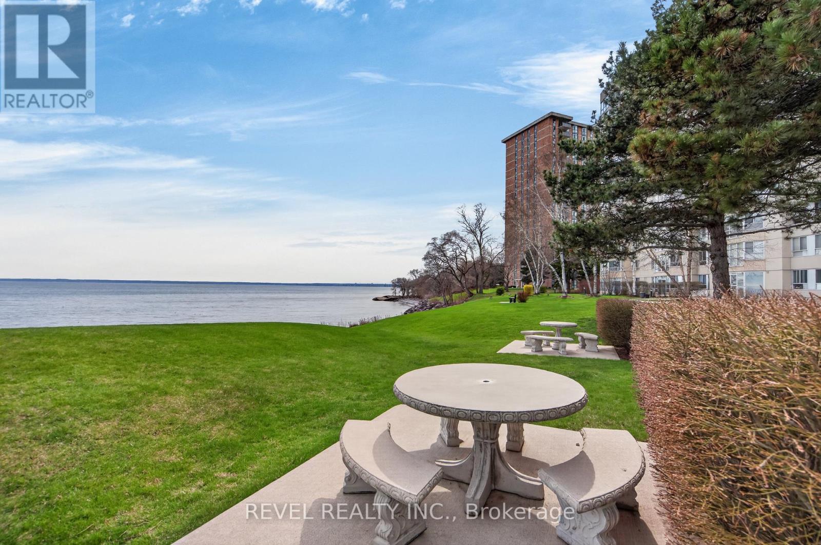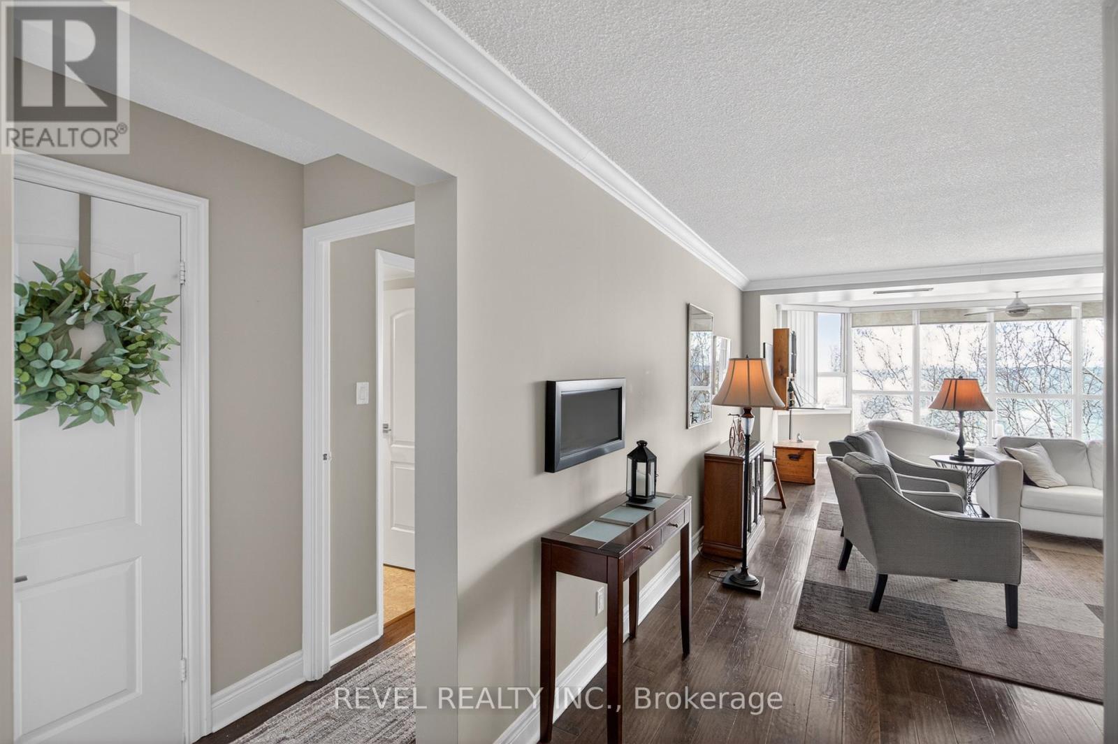 Welcome to Royal Vista! Stunning lakefront living with fantastic views. This gorgeous and spacious unit boasts top to bottom renovations showcasing the perfect location overlooking Lake Ontario.Upon entry you'll be greeted by a beautiful open concept living room/dining room complete with additional sitting space in front of the panoramic windows making the massive living space bright and inviting, perfect for entertaining guests or getting lost in the gorgeous views.A fully updated kitchen including newer stainless steel appliances, stone counters with a tile backsplash and clean cabinetry add to the warmth and appeal.The generous master bedroom includes an updated en suite bathroom with subway tile around the bathtub, new vanity and flooring. A second spacious bedroom plus additional bathroom with glass shower provide even more comfort and living space.Carpet free, with luxurious hand scraped wood flooring, new trim, in suite laundry and loads of closet and storage space make this unit one of a kind.Royal Vista also includes top notch amenities including a party room with a full kitchen, a full gym along with a dry sauna. Once the weather warms there's also a large outdoor pool a tennis court which can also be used for pickleball.Units in this building don't often come up, especially ones with this view and attention to detail. Check out this unique, exquisite place before it's gone! (id:4555)