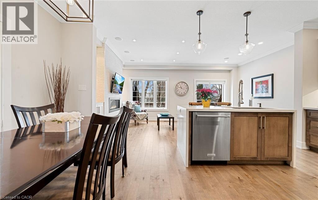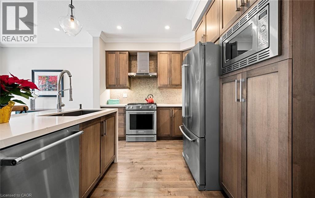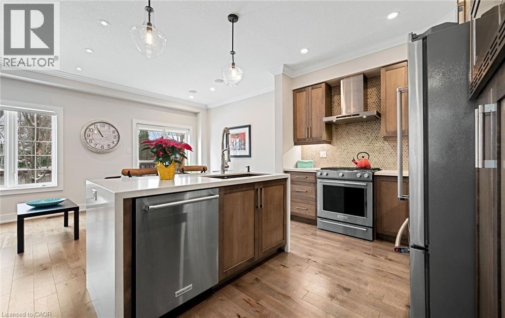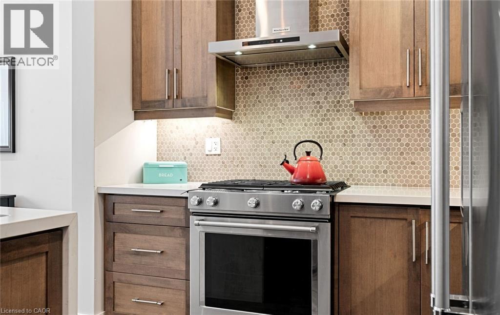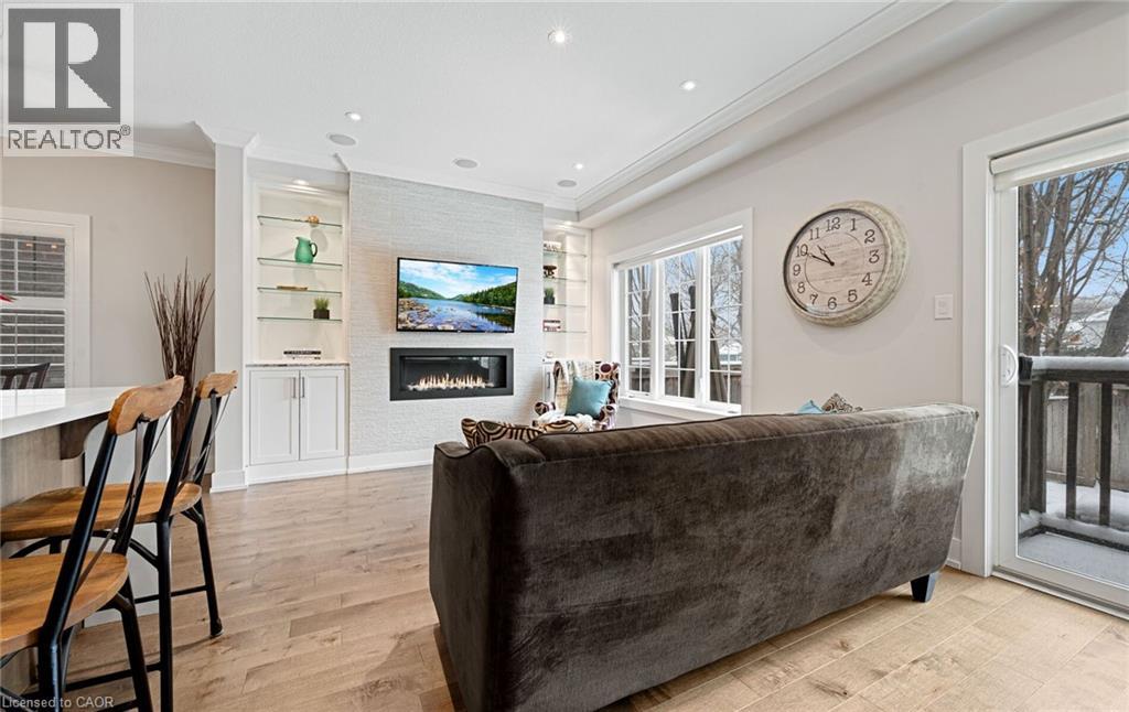 Welcome to refined executive living just moments from Downtown Burlington and the vibrant Brant Street corridor. This rare end-unit condo townhouse offers approx. 2,000 sq. ft. of beautifully finished space (1,473 sq. ft. above grade + 527 sq. ft. below), blending upscale design with unmatched urban convenience near the lakefront, boutique shops, dining, Spencer Smith Park, GO Transit, and major highways. The bright, open-concept main level features 9-ft ceilings, rich flooring, designer lighting, and expansive windows that maximize natural light—an advantage of the premium end-unit location. The chef-inspired KitchenAid kitchen impresses with custom cabinetry, a waterfall quartz island, and a 5-burner gas range, all flowing into the elegant dining and living areas. A striking stone gas fireplace with custom built-ins, a convenient 2-piece powder room, and whole-home audio with integrated home theatre elevate the space for everyday comfort and high-end entertaining. Upstairs, three generous bedrooms include a serene primary retreat with walk-in closet and spa-like ensuite. A stylish 4-piece main bath and second-floor laundry add to the thoughtful executive design. The fully finished lower level extends the lifestyle with a refined recreation room featuring wood-look flooring, LED pot lights, frosted glass doors, and a spa-inspired 3-piece bath with heated floors—ideal for a media room, office, gym, or guest suite. Smart home upgrades include Lutron lighting and Google Nest controls, providing modern comfort and efficiency. Set within a top-rated school district and close to parks, trails, and Burlington’s signature waterfront, this home delivers the perfect blend of luxury, location, and lifestyle—ideal for professionals, downsizers, and families seeking executive living near Burlington’s most coveted amenities. (id:4555)