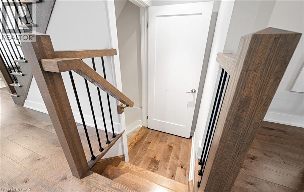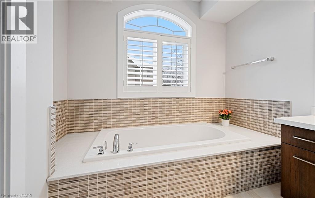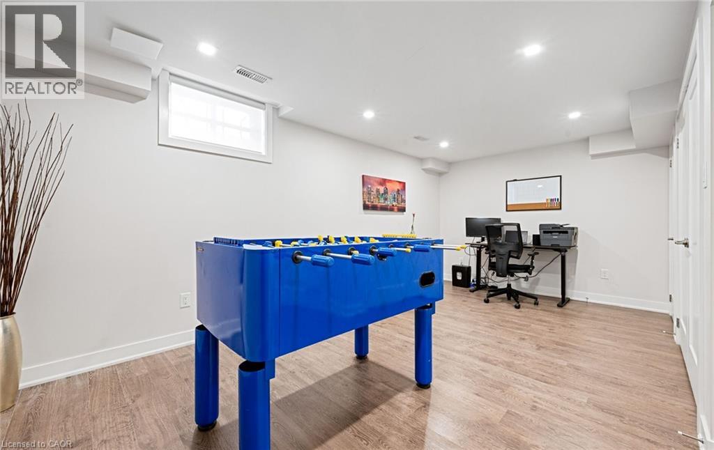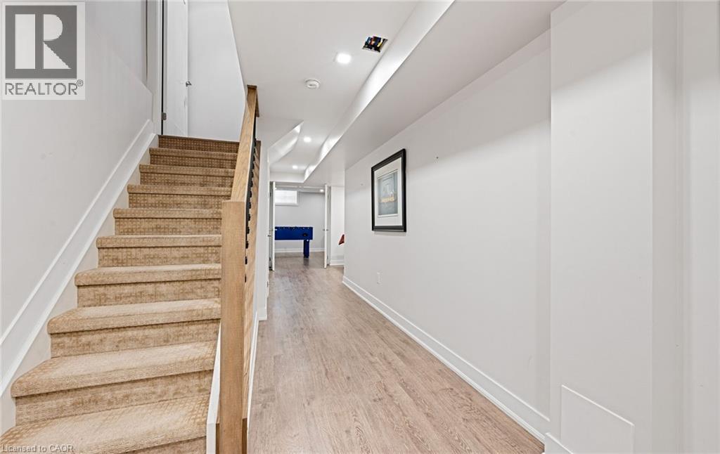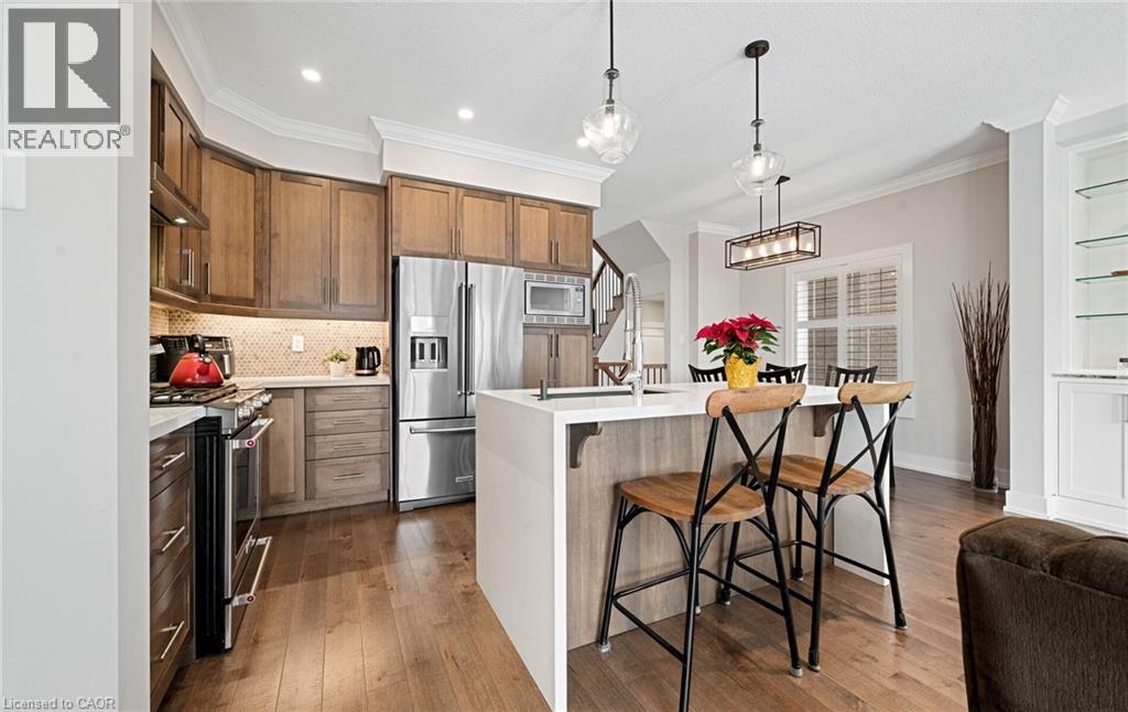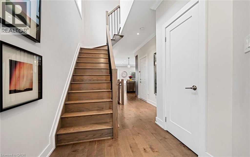 Welcome to refined executive living just moments from Downtown Burlington and the vibrant Brant Street corridor. This rare end-unit condo townhouse offers approx. 2,000 sq. ft. of beautifully finished space (1,473 sq. ft. above grade + 527 sq. ft. below), blending upscale design with unmatched urban convenience near the lakefront, boutique shops, dining, Spencer Smith Park, GO Transit, and major highways. The bright, open-concept main level features 9-ft ceilings, rich flooring, designer lighting, and expansive windows that maximize natural light—an advantage of the premium end-unit location. The chef-inspired KitchenAid kitchen impresses with custom cabinetry, a waterfall quartz island, and a 5-burner gas range, all flowing into the elegant dining and living areas. A striking stone gas fireplace with custom built-ins, a convenient 2-piece powder room, and whole-home audio with integrated home theatre elevate the space for everyday comfort and high-end entertaining. Upstairs, three generous bedrooms include a serene primary retreat with walk-in closet and spa-like ensuite. A stylish 4-piece main bath and second-floor laundry add to the thoughtful executive design. The fully finished lower level extends the lifestyle with a refined recreation room featuring wood-look flooring, LED pot lights, frosted glass doors, and a spa-inspired 3-piece bath with heated floors—ideal for a media room, office, gym, or guest suite. Smart home upgrades include Lutron lighting and Google Nest controls, providing modern comfort and efficiency. Set within a top-rated school district and close to parks, trails, and Burlington’s signature waterfront, this home delivers the perfect blend of luxury, location, and lifestyle—ideal for professionals, downsizers, and families seeking executive living near Burlington’s most coveted amenities. (id:4555)