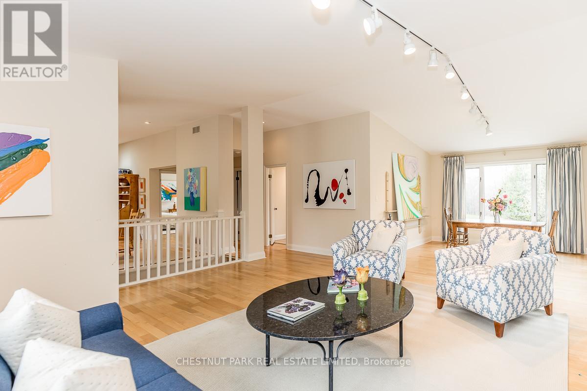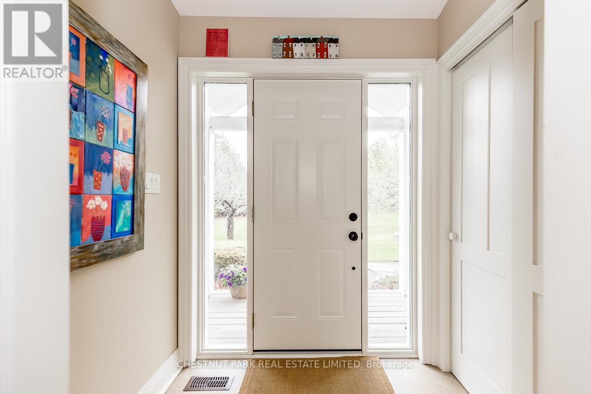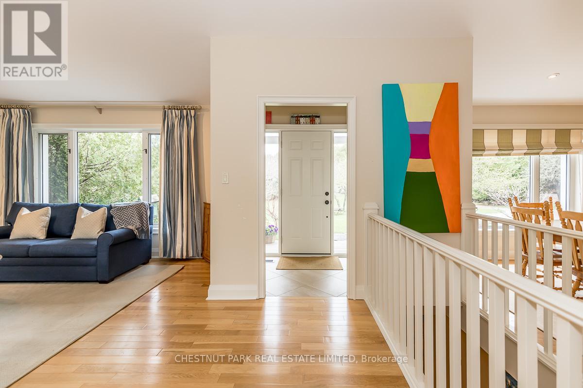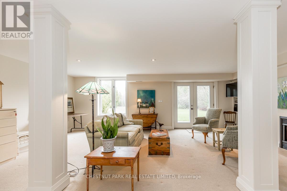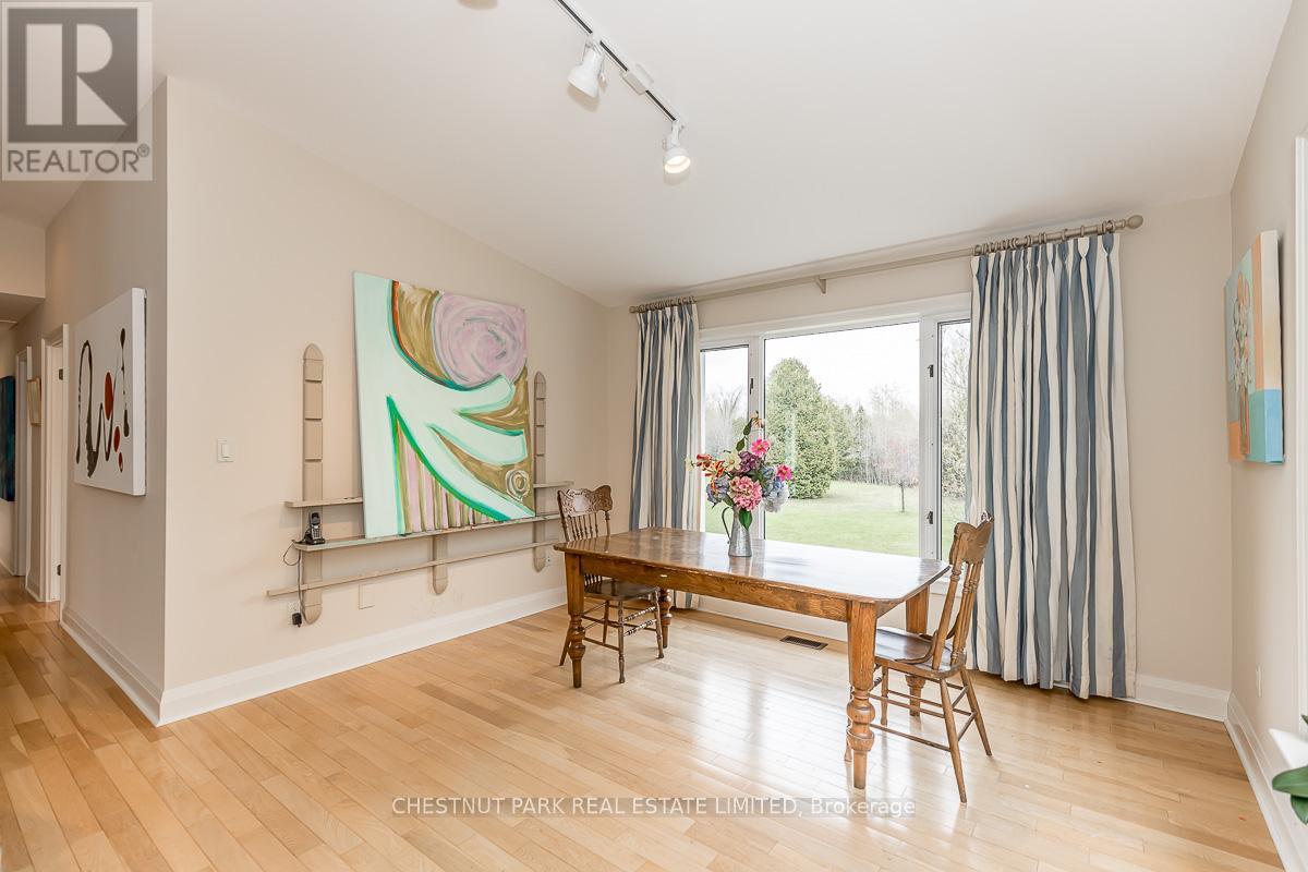 This bright sun-filled bungalow offers the perfect balance of comfort, charm, and quiet privacy! Set on 3.76 acres of peaceful countryside, with beautiful vaulted ceilings and an open-concept layout, the main floor feels spacious and inviting, ideal for everyday living and family gatherings. The living room features a cozy wood-burning fireplace and expansive windows with lovely views of the property. A spacious kitchen with a dedicated eating area provides plenty of room to create your dream culinary space. Step out to a private, covered deck, a quiet spot to enjoy morning coffee or an evening breeze. The mudroom with built-in hooks and cupboards for easy organization connects the home to an attached 4-car garage. Downstairs, the fully finished lower level offers a large family room with a gas fireplace, built-in entertainment unit, and walk-out access to a level lawn surrounded by trees perfect for kids, pets, or simply enjoying the outdoors. Well-maintained and full of potential, this is a wonderful opportunity to create your ideal family home in a peaceful, private setting. (id:4555)
