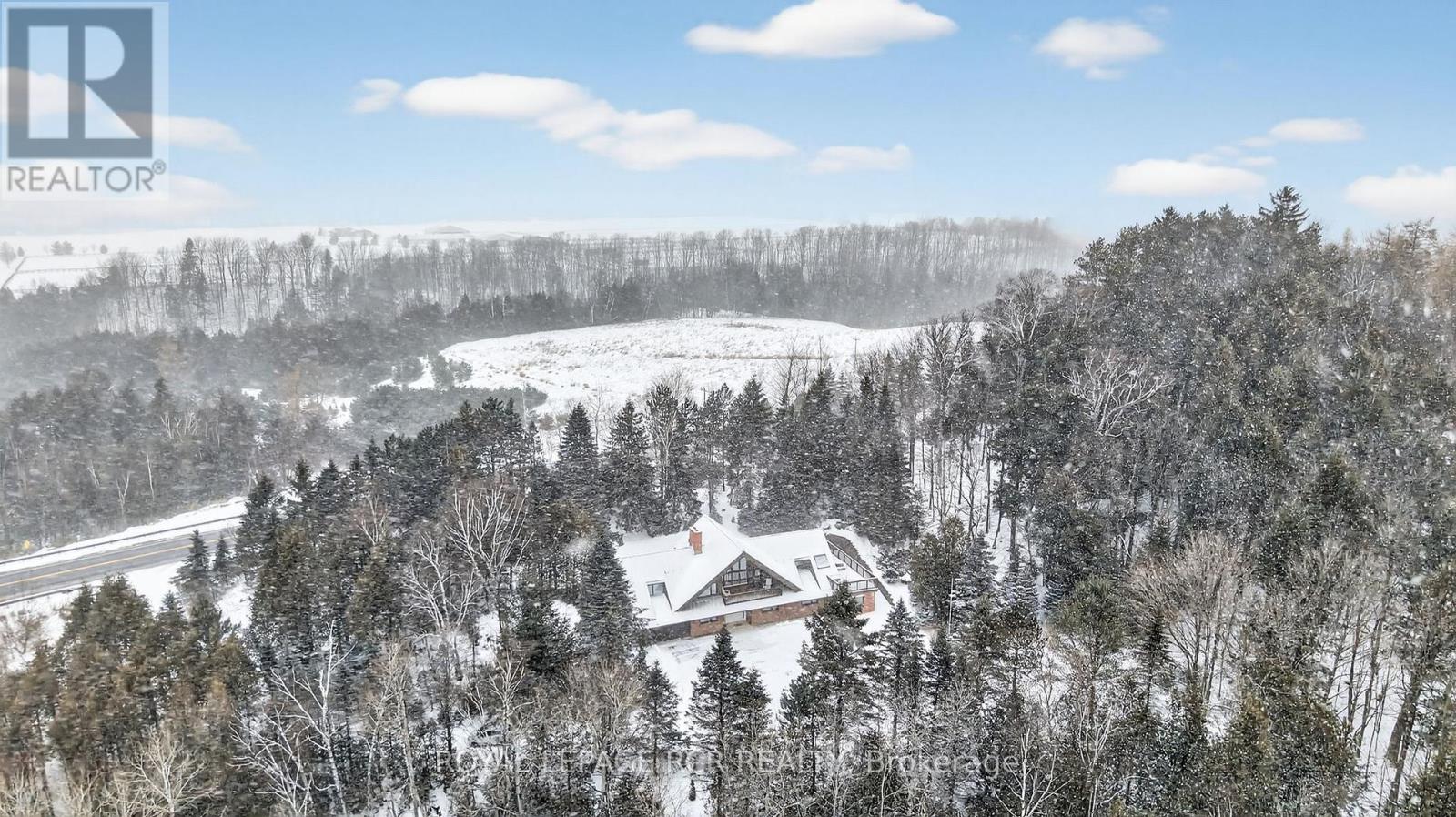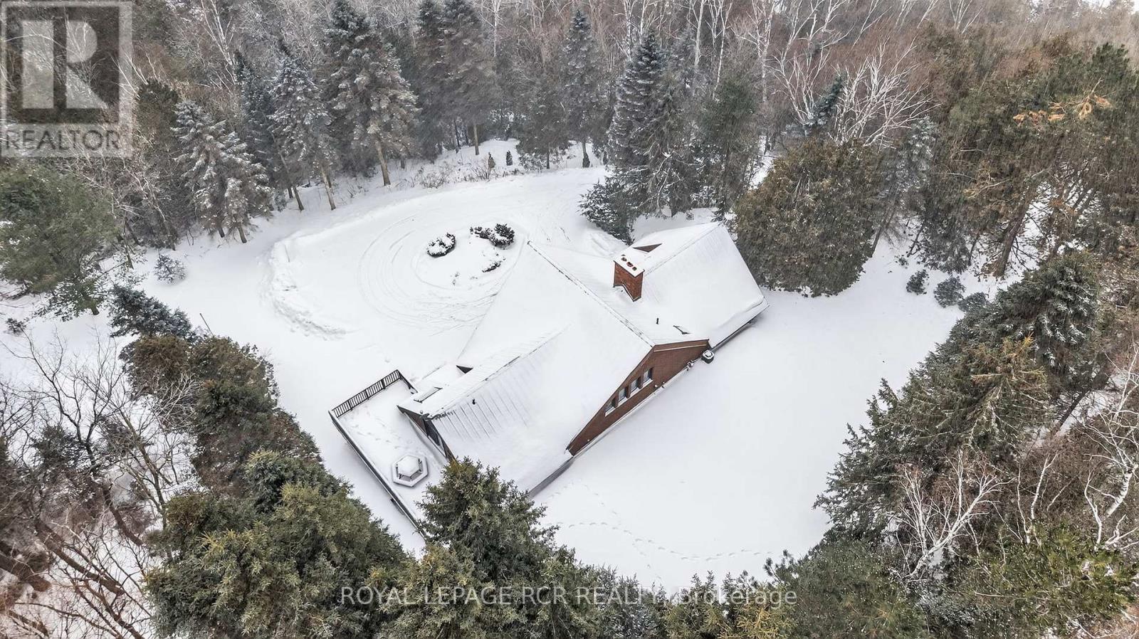 Offered for the first time since 1988, this exceptional chalet-style home is a rare opportunity to own a truly unique property on nearly 3 acres of forested land. Tucked away yet ideally located on Hwy 9 just west of Airport Road, it offers outstanding access to the GTA and Pearson Airport while feeling completely removed from it all. Surrounded by mature trees, the home evokes the charm of a European mountain retreat, featuring soaring vaulted ceilings, expansive windows, and warm architectural details that invite the outdoors in. The thoughtfully designed layout includes 4 bedrooms and 2 bathrooms, with two lower-level bedrooms offering their own attached living areas-ideal for extended family, in-laws, or flexible living arrangements. Meticulously maintained, the home presents an incredible blank canvas for future updates while offering solid long-term value. Key features include a metal roof, many newer windows (2022), natural gas heating, central air conditioning, a two-car garage, and a circular driveway with parking for at least eight vehicles. Private, peaceful, and unlike anything else on the market, this hidden retreat must be experienced to be fully appreciated. (id:4555)