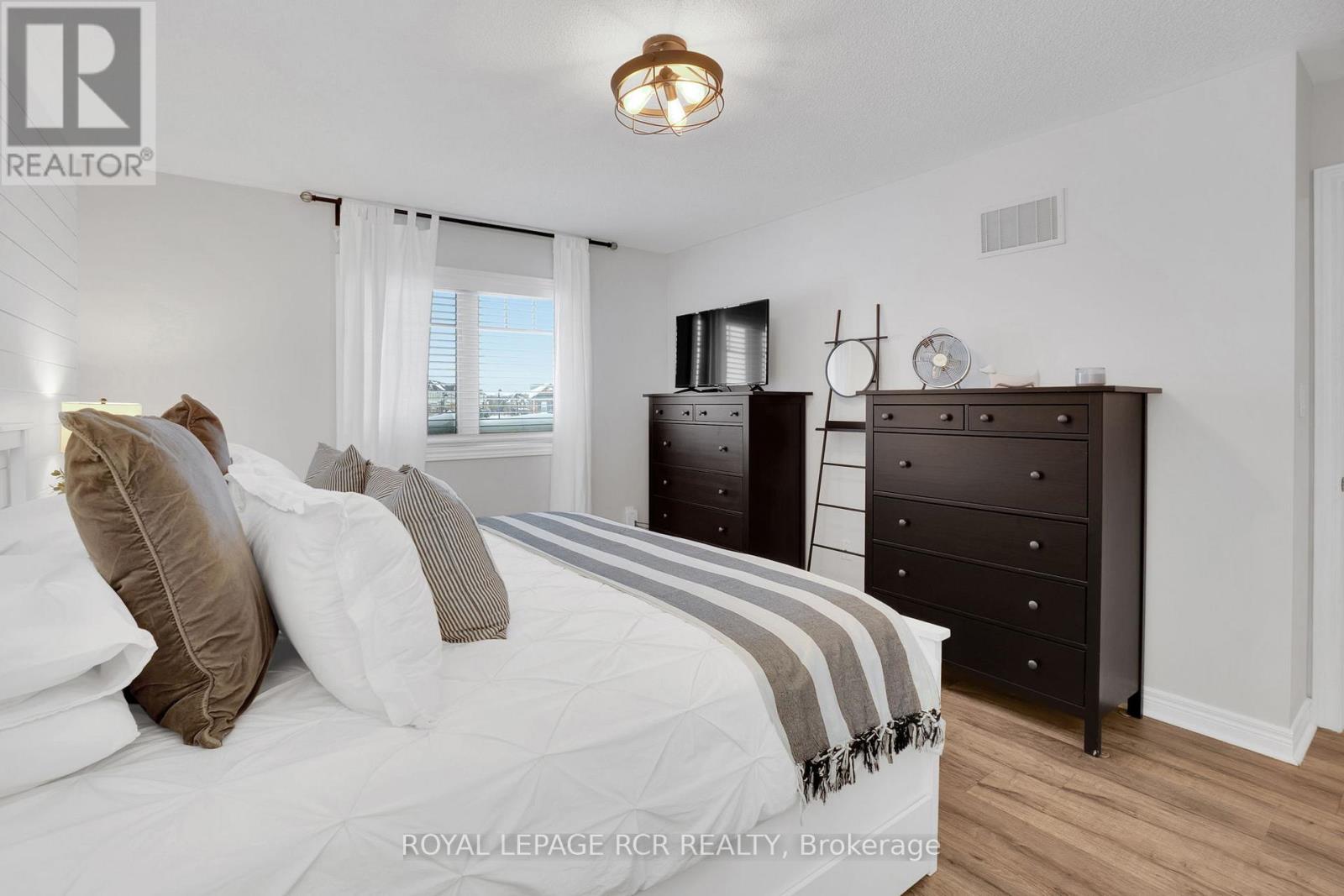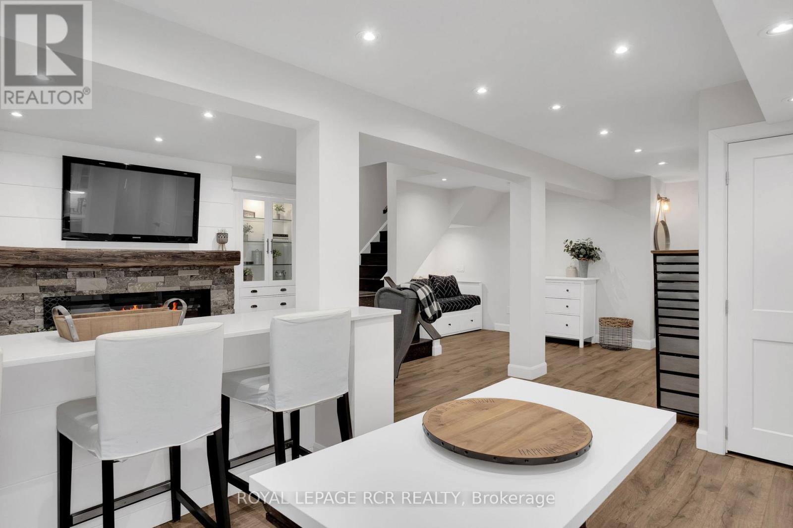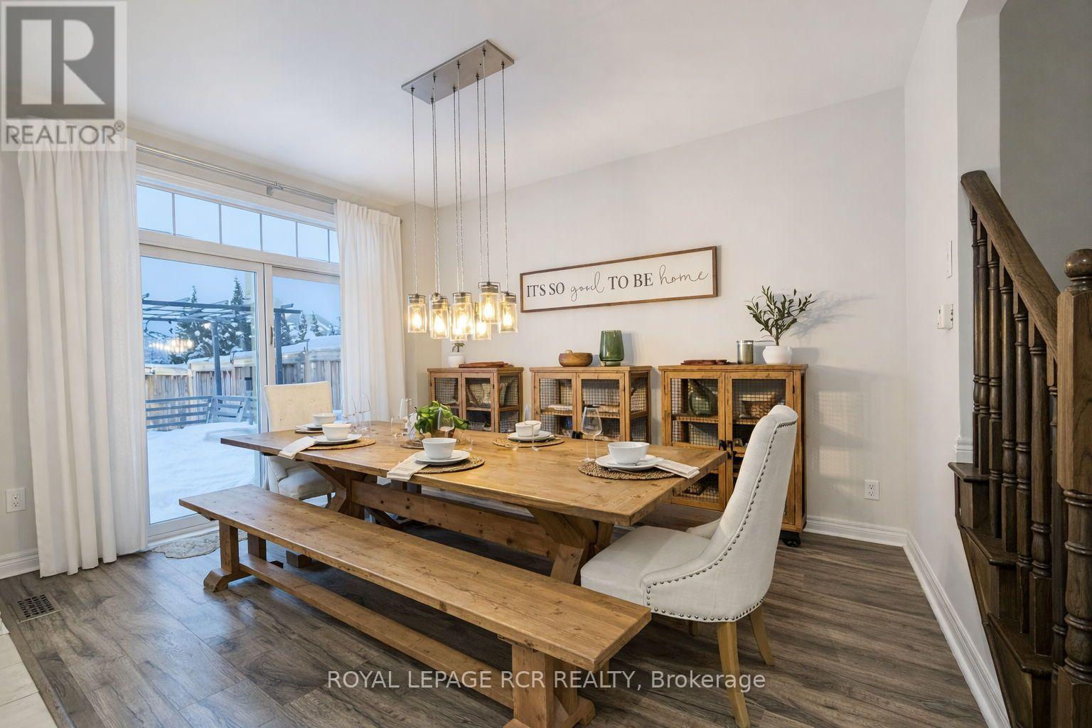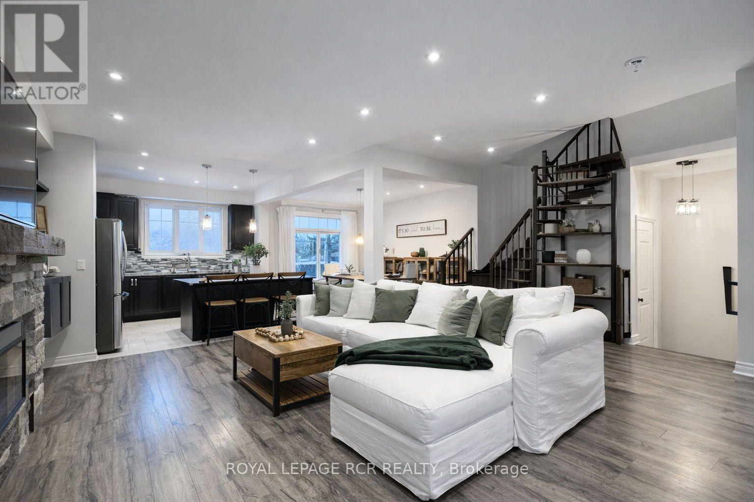 Welcome to this stunning executive townhome (Belfountain Model-Energy Star Home), perfectly situated on a quiet cul-de-sac in the highly sought-after community of Caledon East. Offering 1,800 sq. ft. of finished living space plus a fully finished lower level, this home delivers exceptional style, comfort, and functionality. Beautiful curb appeal features a stone walkway and a generous covered front porch. Inside, enjoy high-end finishes throughout, including 9' smooth ceilings, granite countertops, upgraded lighting, pot lights, stylish barn doors, and durable laminate flooring. The bright, open-concept main level is ideal for modern living and entertaining. It features a spacious family room with custom built-in shelving and cabinetry, an electric fireplace, and a large dining area with a walk-out to the backyard. The modern kitchen boasts a grand centre island with breakfast bar, built-in bar fridge and ample storage. The main level also offers access to the garage. Upstairs, the 2nd level offers a generous primary retreat boasting a walk-in closet and a luxurious 5-piece ensuite, along with three additional spacious bedrooms and a convenient second-floor laundry room. The finished lower level provides valuable additional living space with incredible potential, featuring an open-concept recreation room with servery/wet bar (potential for second kitchen), pantry with rough-in for a second laundry (ventless dryer option), built-in cabinetry, feature wall with electric fireplace, 3-piece washroom, cantina, and more. The fully fenced backyard is private and inviting, complete with a deck and gas BBQ hookup, perfect for creating your outdoor oasis. Located in a family-friendly neighbourhood within walking distance to schools, parks, Caledon East Community Complex, and the Caledon Trailway, and just minutes to all amenities in neighbouring town of Bolton, this exceptional townhome truly has it all. (id:4555)