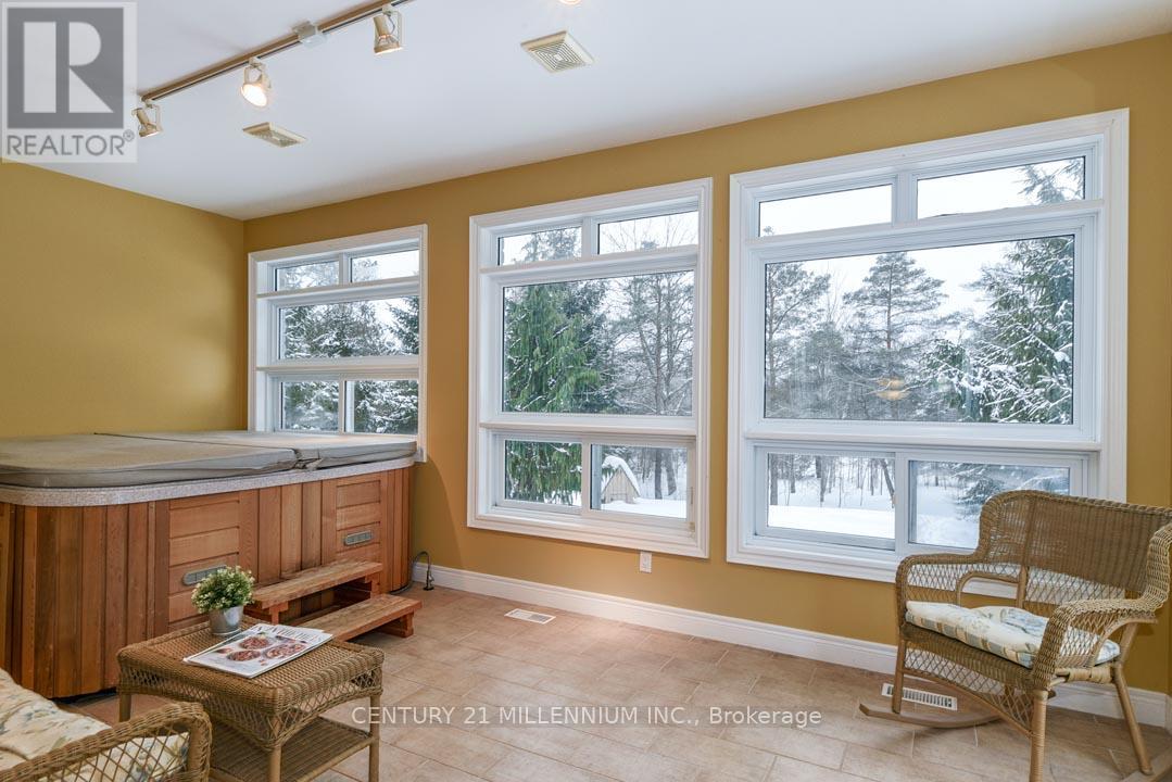 Built in 2003, by Charleston Homes, is this quality-constructed, 3+1 bedroom bungalow, set on a mature, private, park-like 2.05 acre lot, with an ornamental pond with a waterfall feature, bush, and small stream. Hardwood and porcelain tile flooring and 9-foot ceilings are found throughout, along with transom windows, vinyl casement windows, glass inserts in the front doors, side lights and elliptical glass above the front door. Maple "Barzotti" Kitchen with centre island with breakfast bar, SS appliances, tumbled marble backsplash, open to the Living. Dining has a coffered ceiling. Sunroom features 8-person hot tub plus garden door walk-out to a tiered deck and backyard. Primary w/ large walk-in closet, 5-piece ensuite w/ double sinks, jacuzzi tub & glass shower. Bright lower level has in-law suite potential w/ sep entry, Oak Kitchenette w/ granite countertop and breakfast bar, gas fireplace and nearby 4-pc bath. 4th bedroom or office has French doors. In addition to the attached 2-car garage, a detached approx. 20 ft. x 34 ft. workshop/garage offers hydro, a 240-volt, 60-amp service. This centrally located home is 10 minutes to all shopping amenities and the hospital in nearby Orangeville, is a 5-minute drive to Highways 10, 9, and Airport Rd for easy commuting and is a 45 min drive to TO. Recent upgrades include: furnace (2024), A/C (2025), humidifier (2025), well pump (2025), water softener (2024). (id:4555)