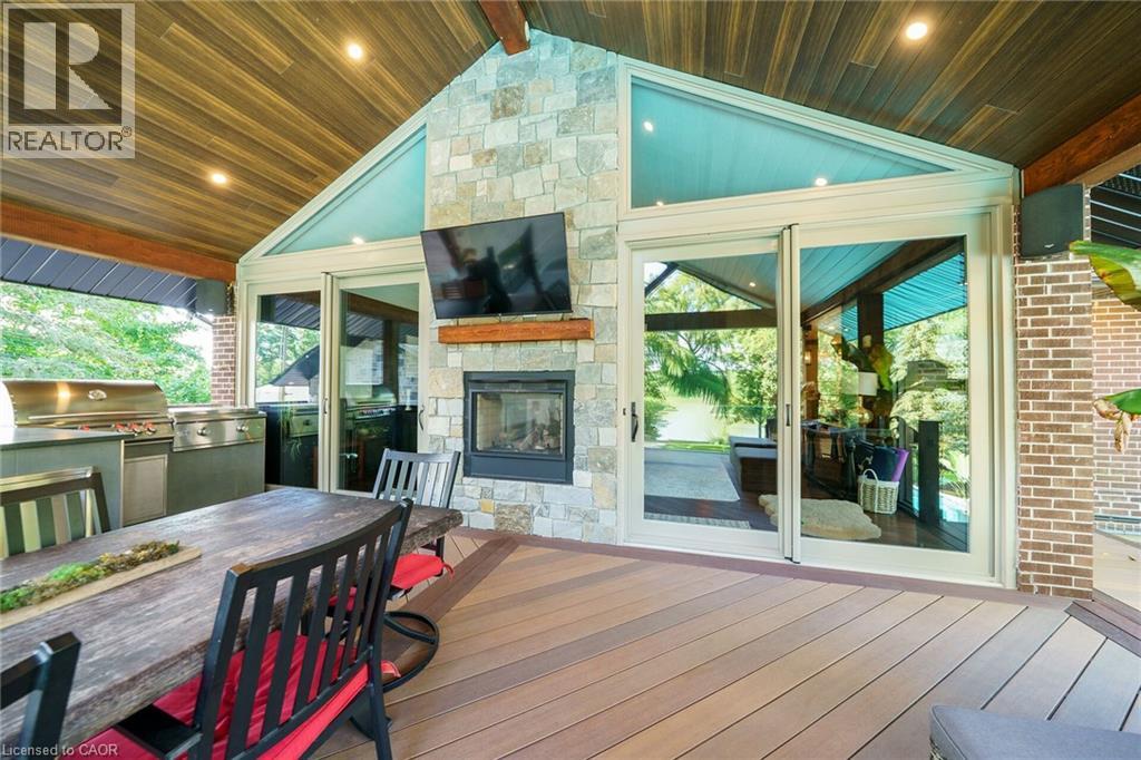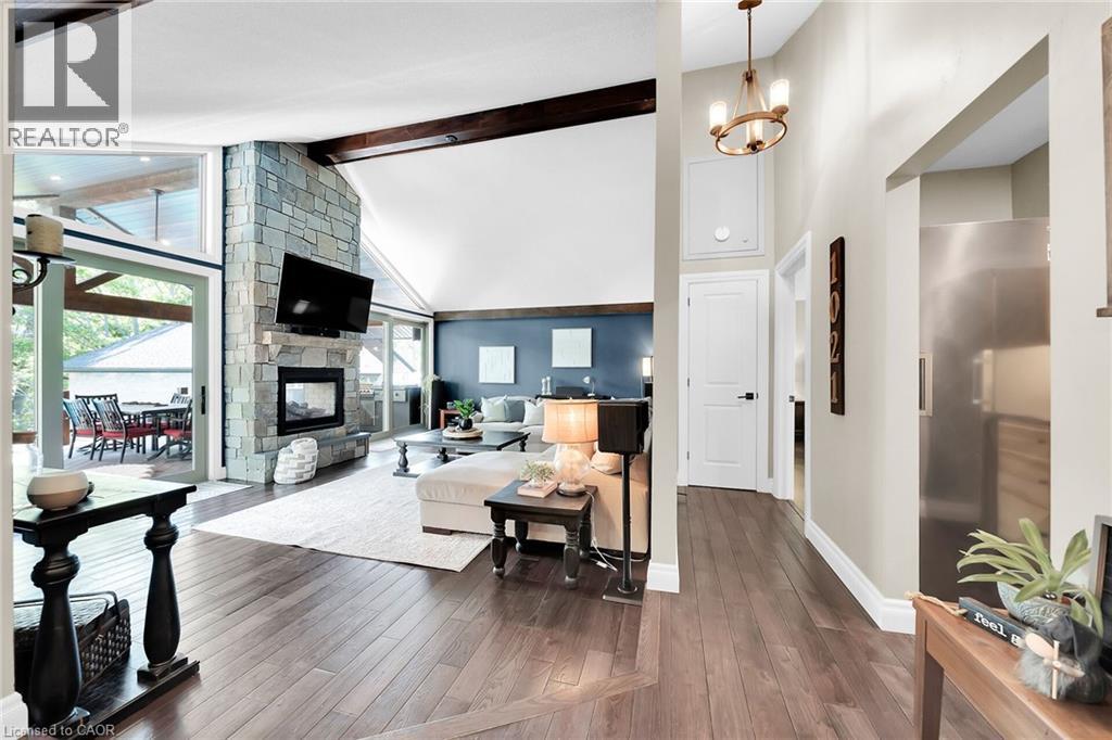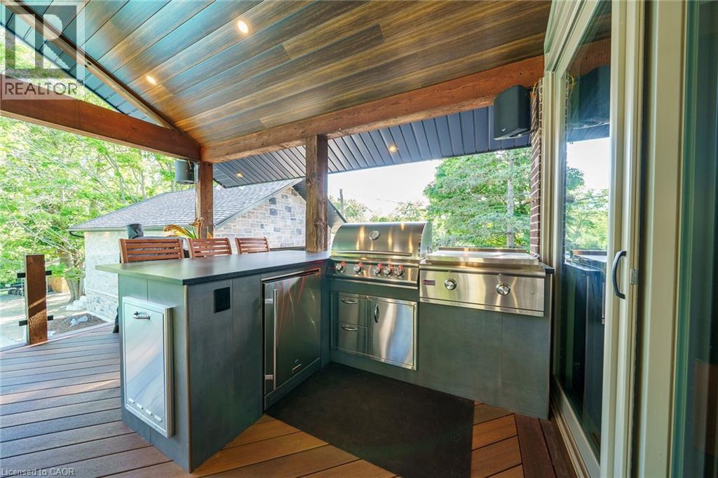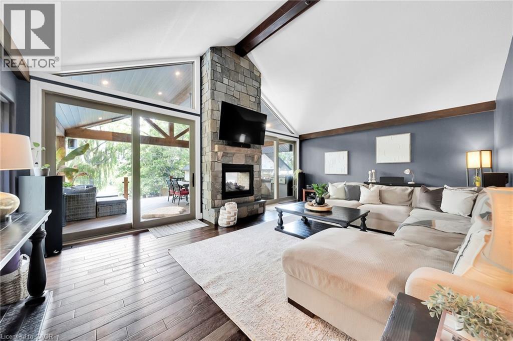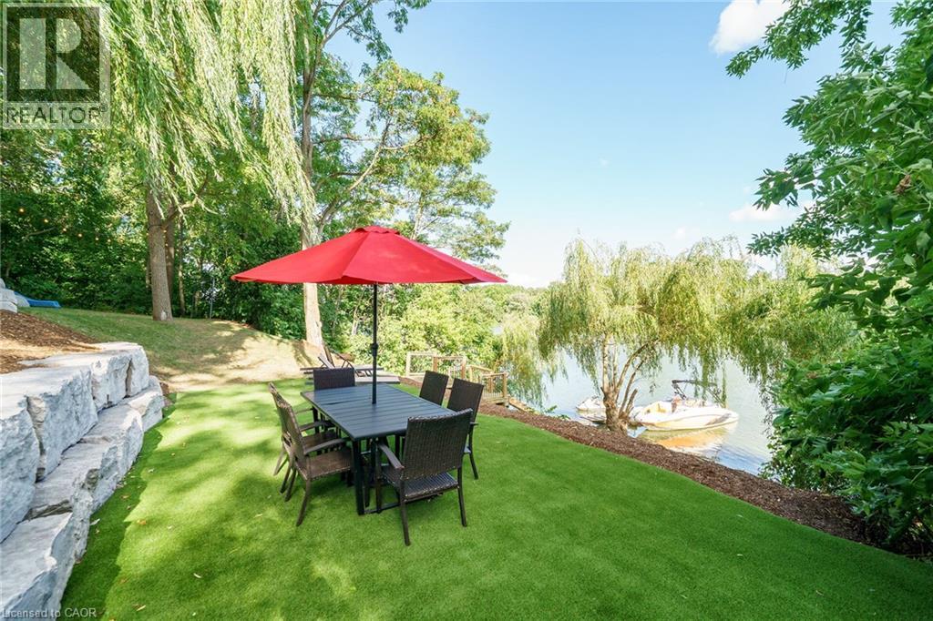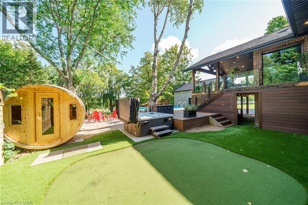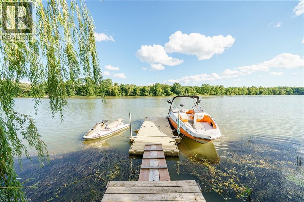 Irreplaceable Grand River Waterfront Masterpiece. A home and cottage retreat all in one with rare & sought after private dock! Exquisitely updated throughout by “Kreekside Construction” this 4 bedroom, 4 bathroom all stone & complimenting brick Bungalow with walk out basement is situated on “Muskoka” Like 100’ x 299’ lot with over 20 km of navigable water allowing you to boat, wakeboard, fish, kayak & enjoy all that Grand River Living has to offer right from your own backyard. Incredible curb appeal with detached 20’ x 30’ garage offering heat, A/C, epoxy floor, & Trusscore interior. Entertainers dream backyard Oasis complete with Douglas Fir post & beam covered porch with composite decking, TV, stone clad double-sided gas FP, outdoor kitchen w/ leathered granite, BBQ & griddle, 3 hole putting/chipping green, barrel sauna, hot tub, & 17’ x 33’ salt water heated pool. The easily accessible waterfront area includes extensive use of armour stone, entertaining area with astroturf, & steps to access your 6’ x 20’ Dock. The stunning interior features approximately 3200 sq ft of beautifully updated living space highlighted by great room with vaulted ceilings, wood beamed accents, gas fireplace set in stone floor to ceiling hearth, Pagoda hardwood flooring throughout, custom hickory kitchen cabinetry with granite countertops, contrasting island with quartz, & walk-in pantry, dining area, 3 spacious MF bedrooms including primary suite with vaulted ceilings & spa bathroom with soaker tub, walk in tile shower, & infloor heat. The finished lower-level features rec room with woodstove set in brick hearth, 4th bedroom, 2 pc bath, plus gym/living room area with 2 pc bath & separate entrance allowing for ideal inlaw set up or perfect home office. Conveniently located close to amenities & easy access to Ancaster, Caledonia, & 403. Grand River Living is more than a place to call home – It’s a Lifestyle you deserve to Experience. (id:4555)